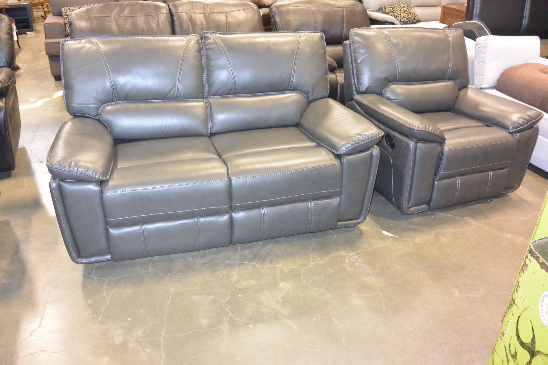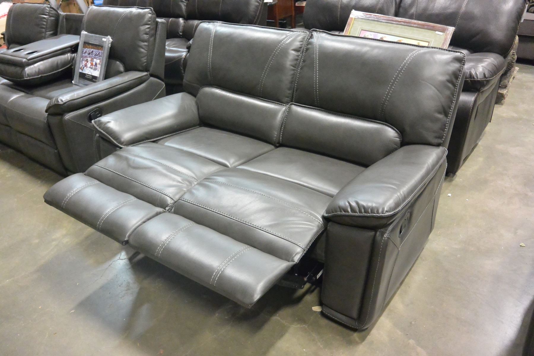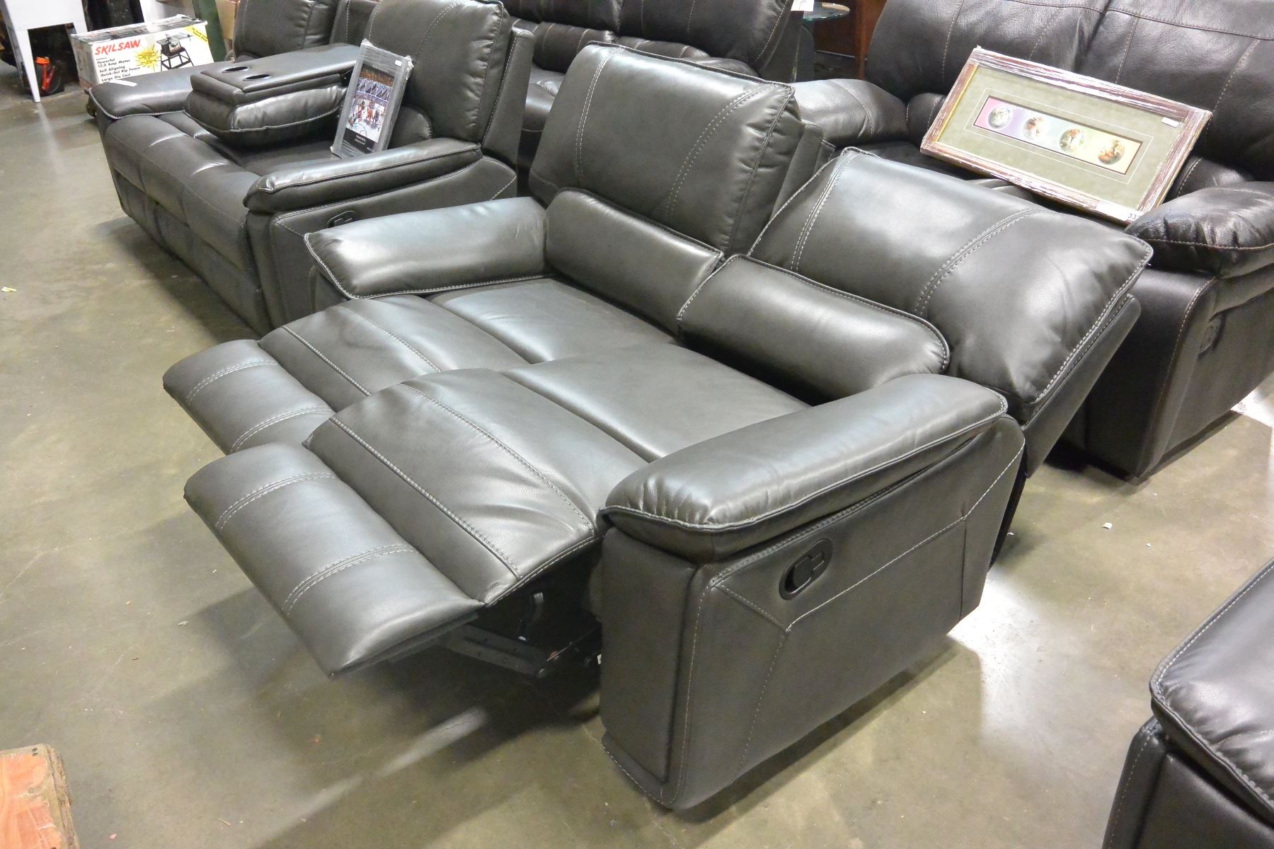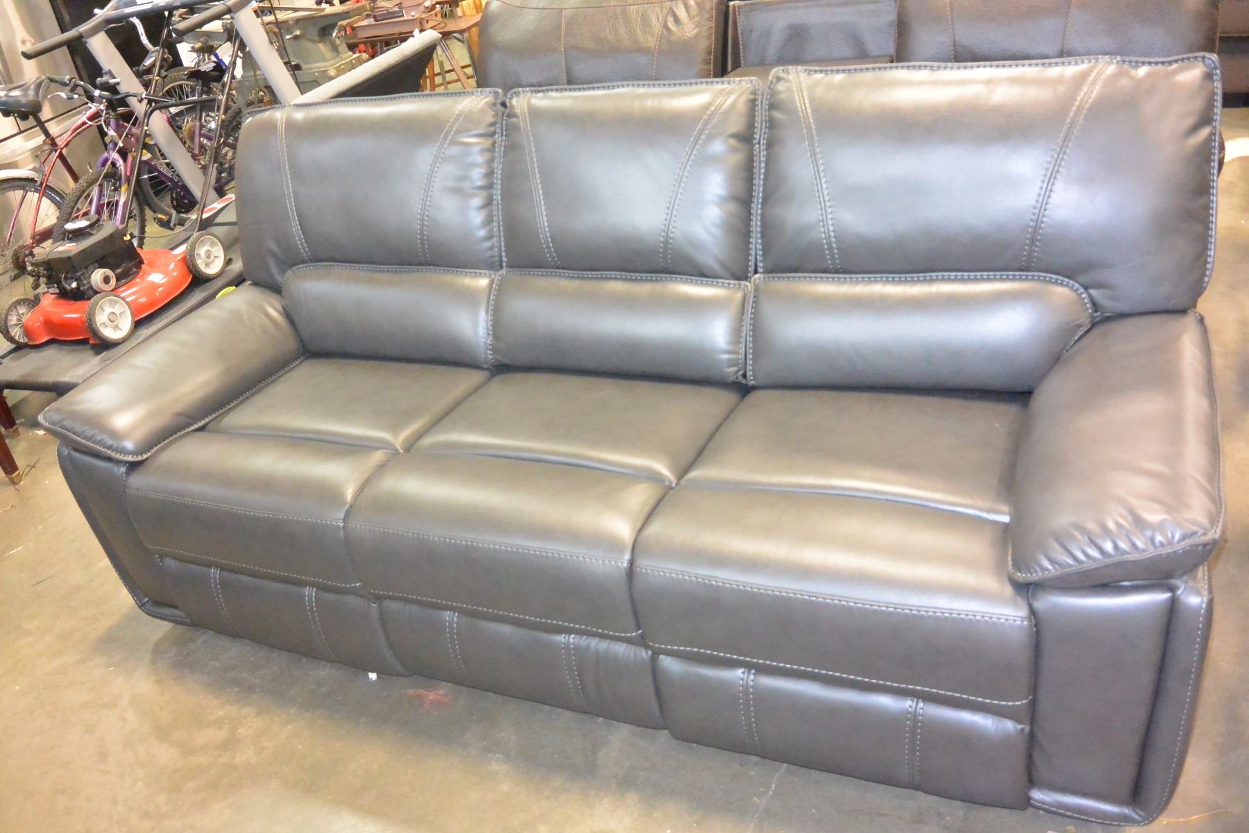 BRAND NEW GREY LEATHER WITH WHITE STITCHING MODERN 3 PIECE SOFA SET, WITH DROP DOWN SOFA TABLE, RECL