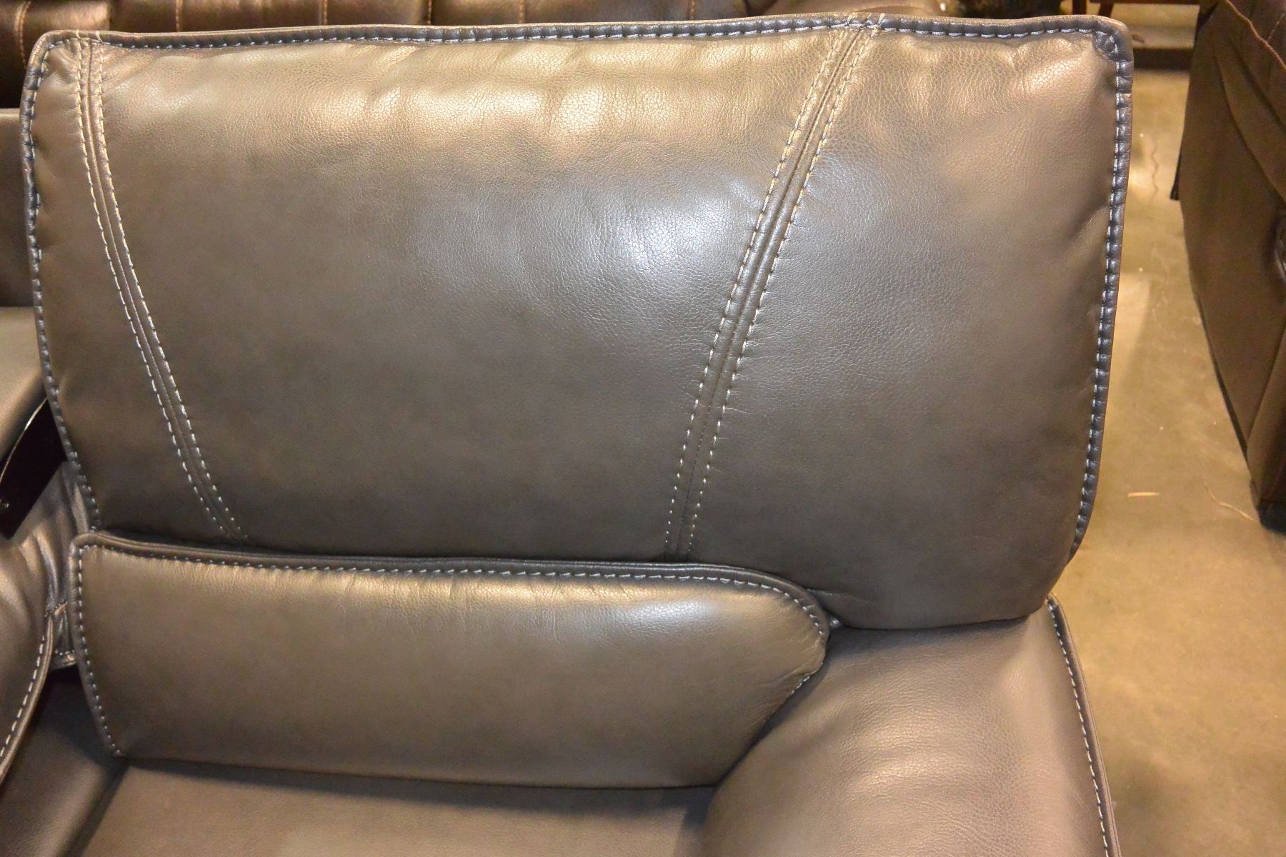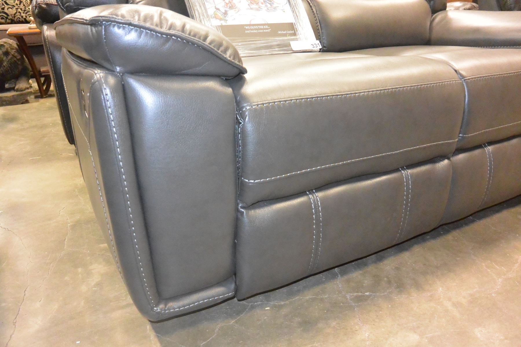 BRAND NEW GREY LEATHER WITH WHITE STITCHING MODERN 3 PIECE SOFA SET, WITH DROP DOWN SOFA TABLE, RECLINER AND LOVESEAT, RETAIL $5699