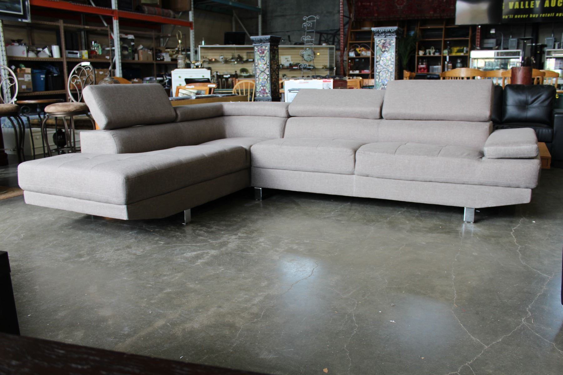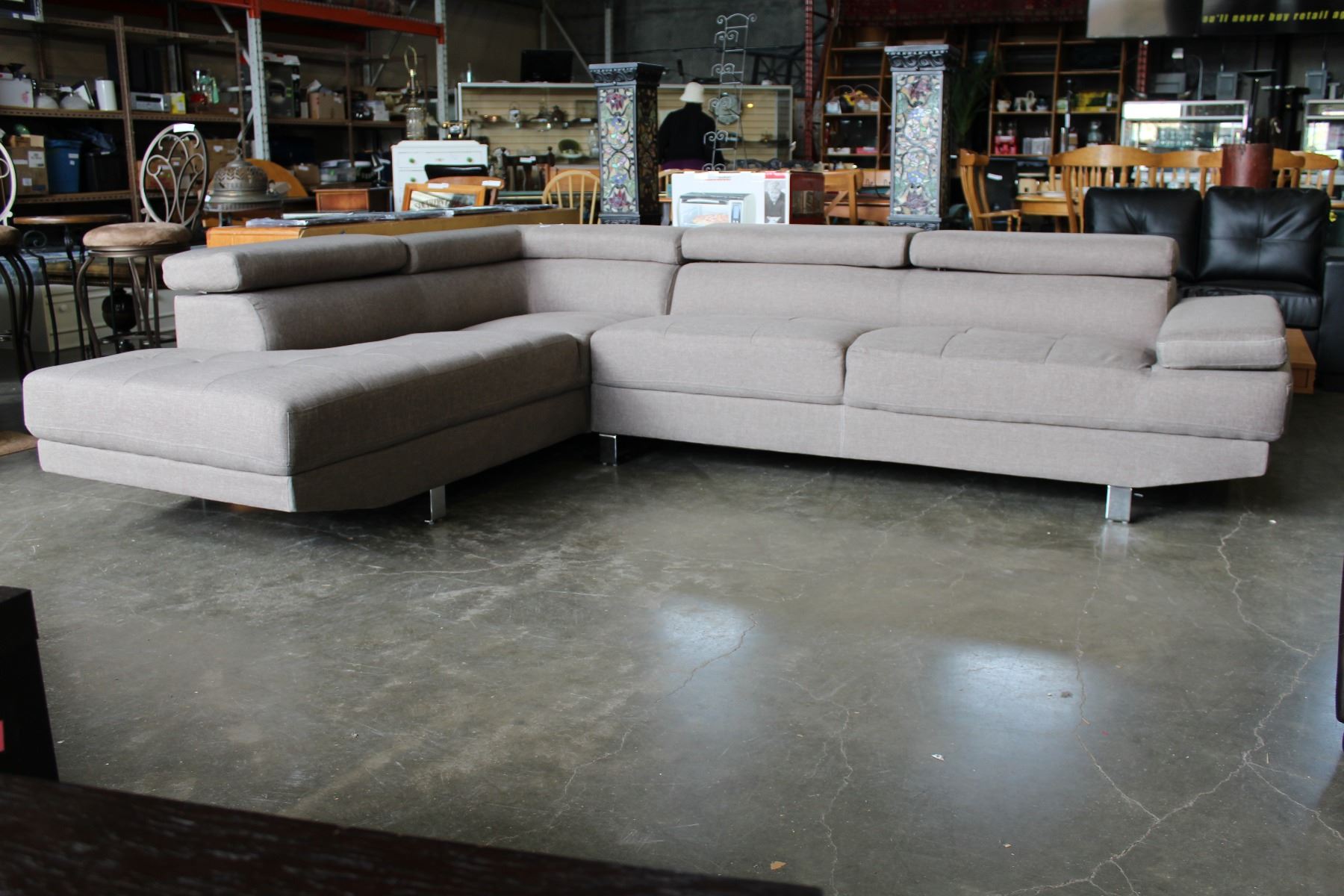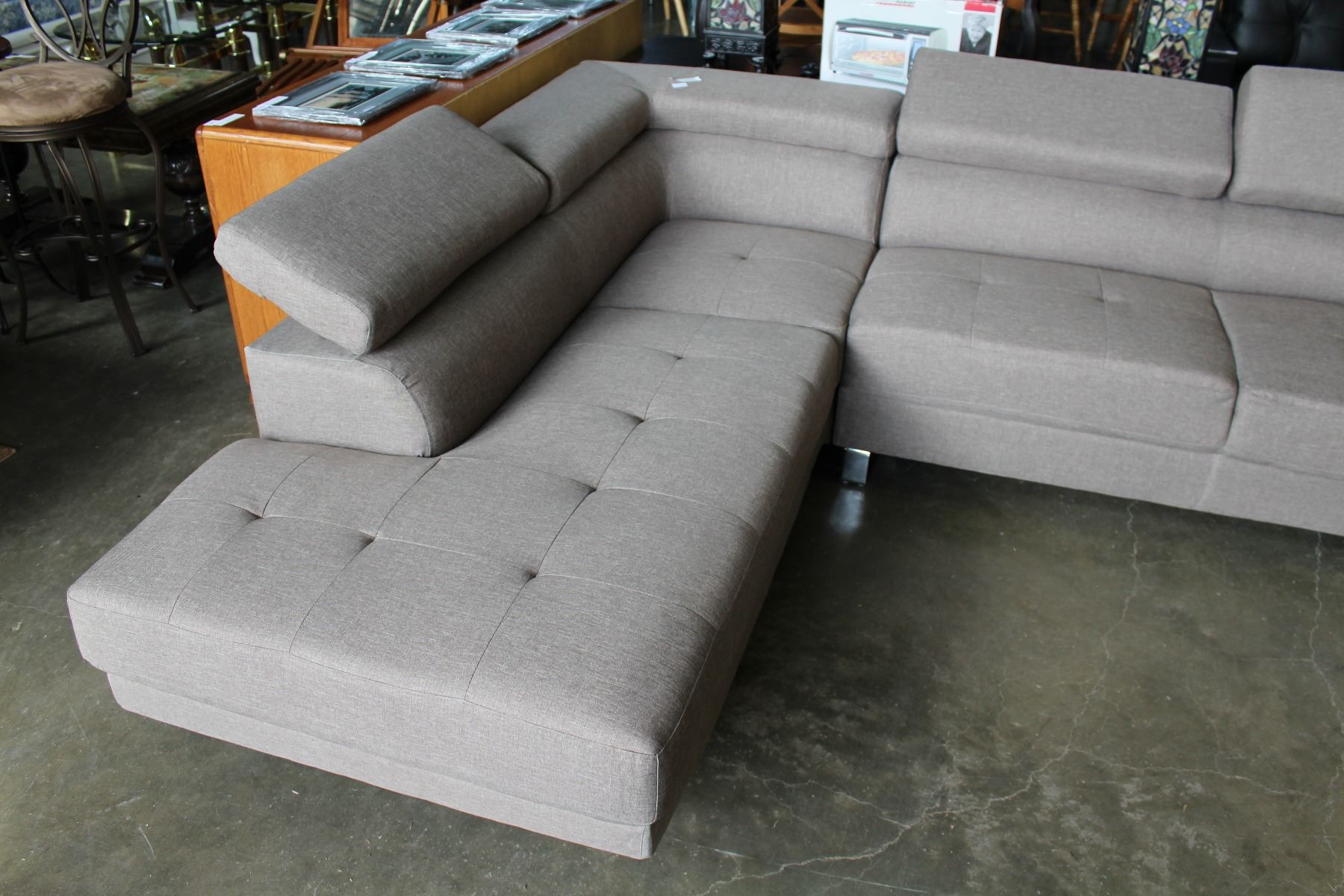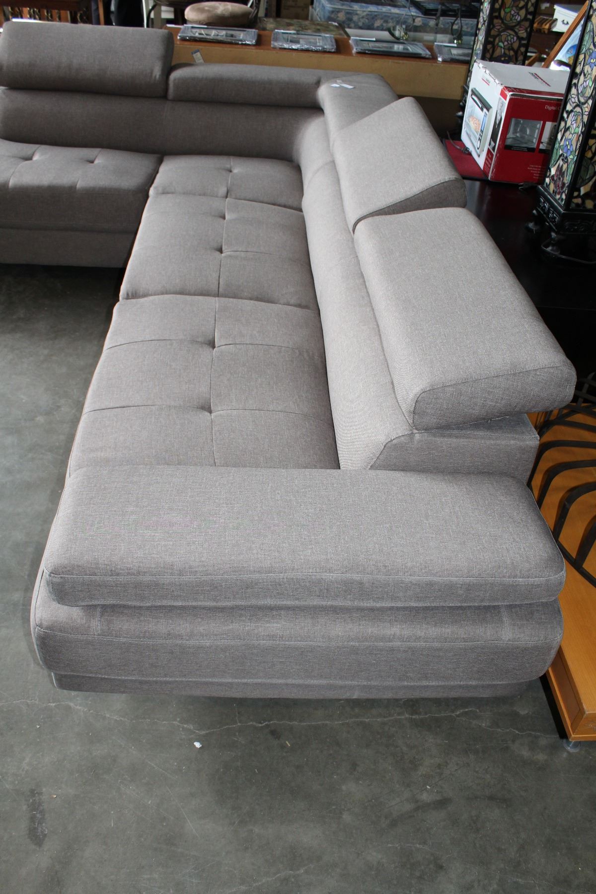 BRAND NEW MODERN 2 PIECE SECTIONAL SOFA IN GREY FABRIC, WITH ADJUSTABLE HEAD REST'S AND ARM REST. RETAIL $2499