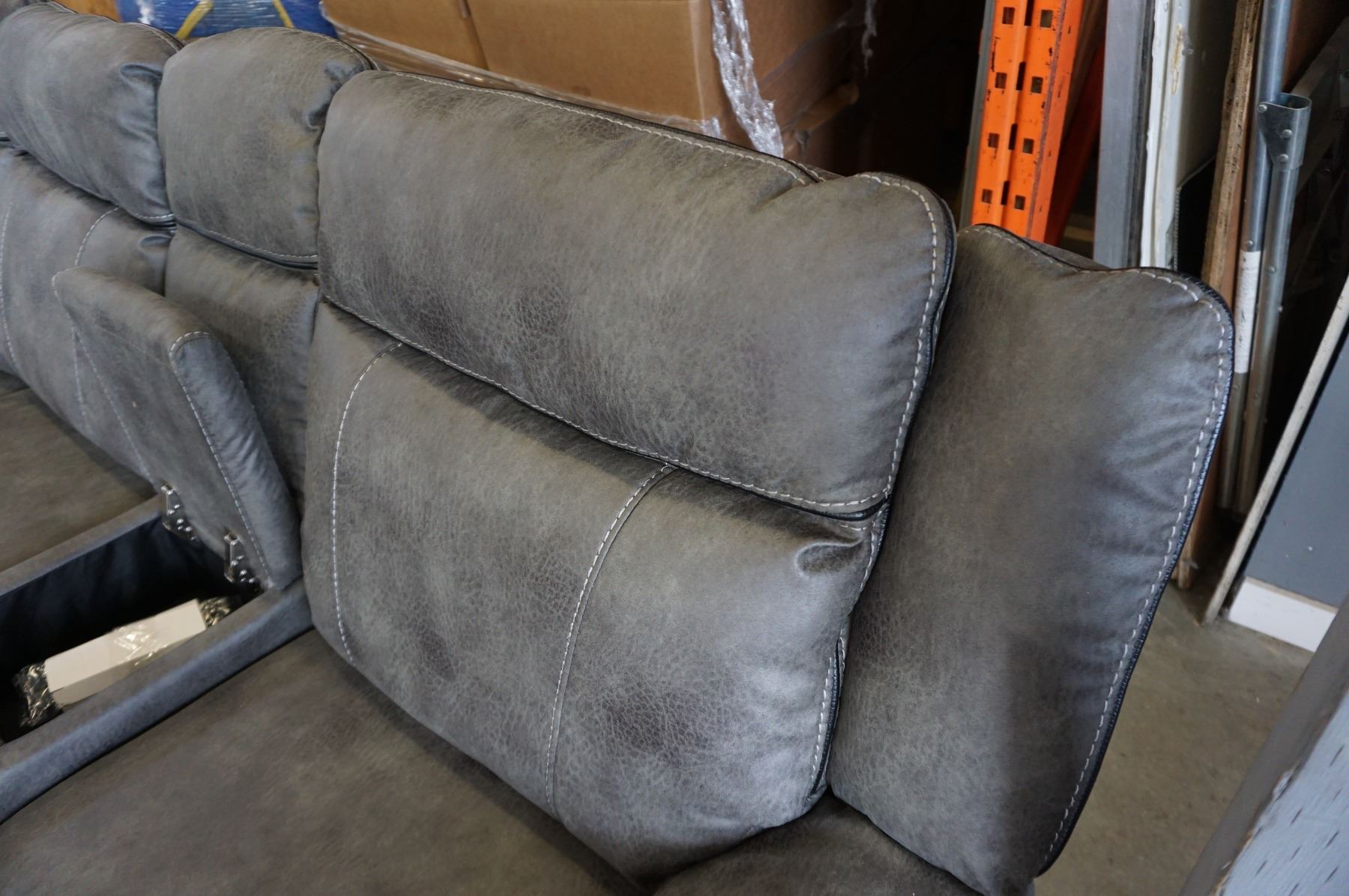 BRAND NEW MODERN GREY STITCHED MICROSUEDE 3 PIECE SECTIONAL SOFA, WITH 3 POWER RECLINERS, 2 CONSOLES