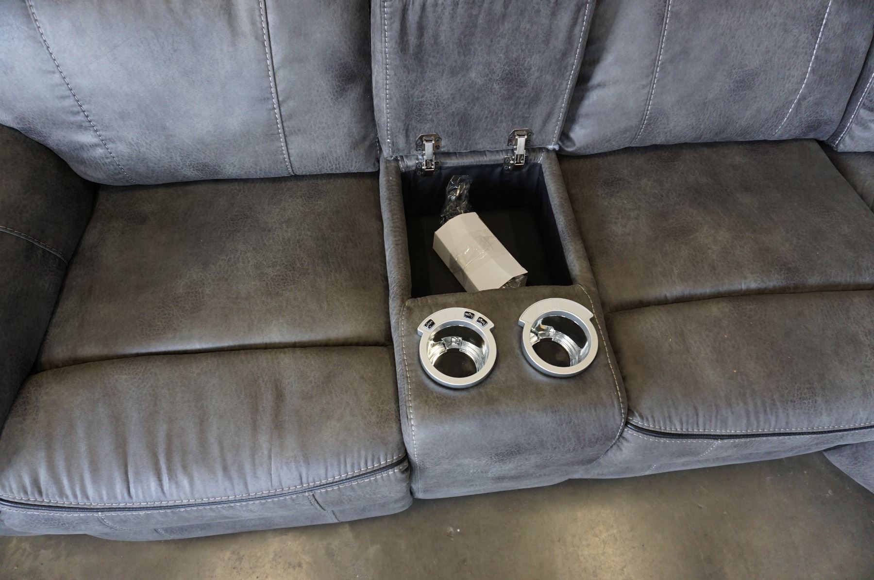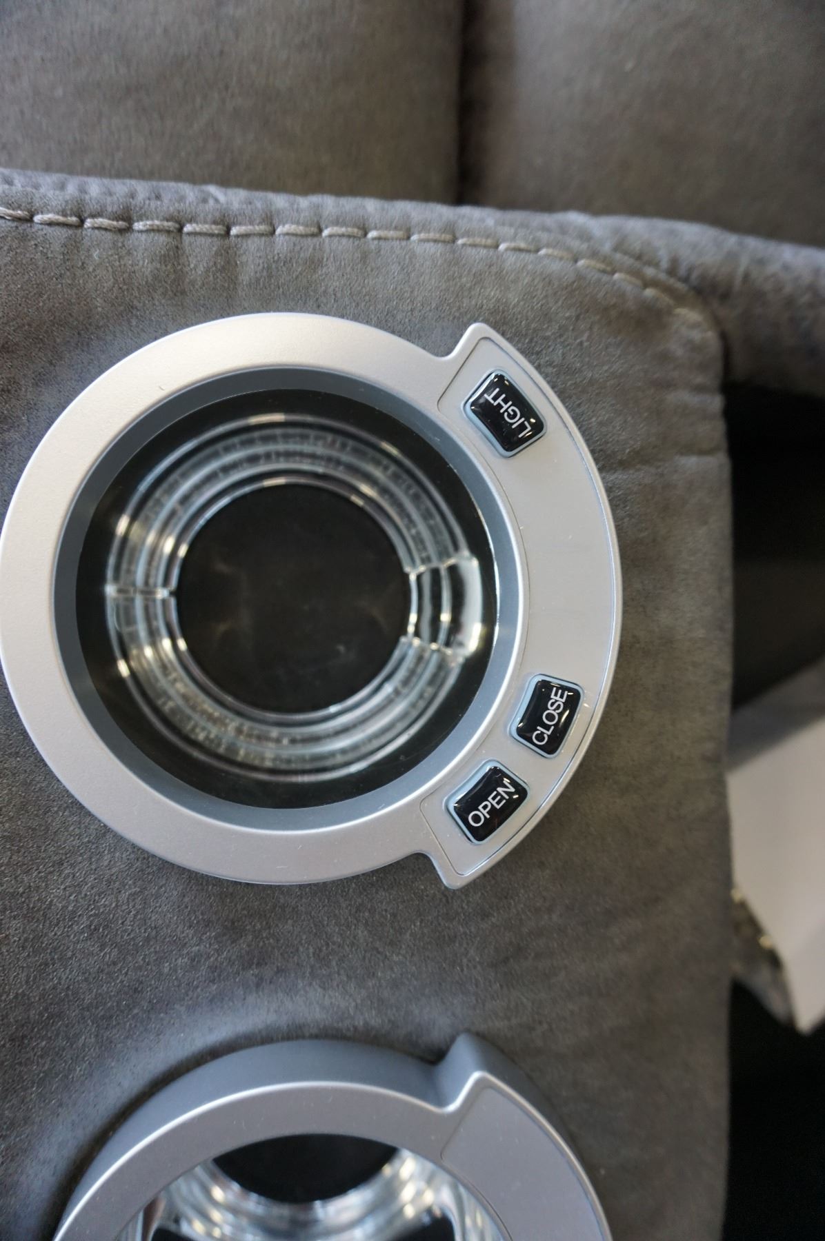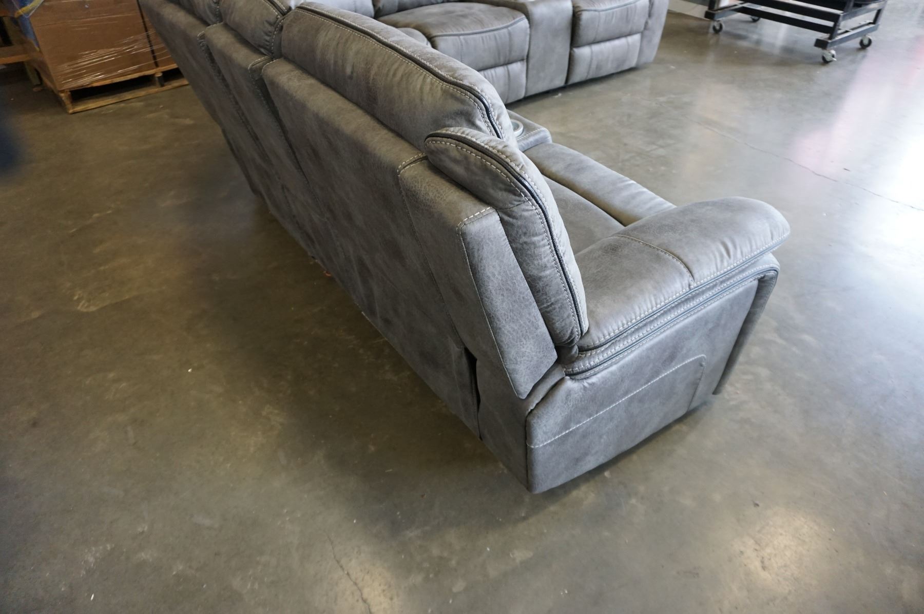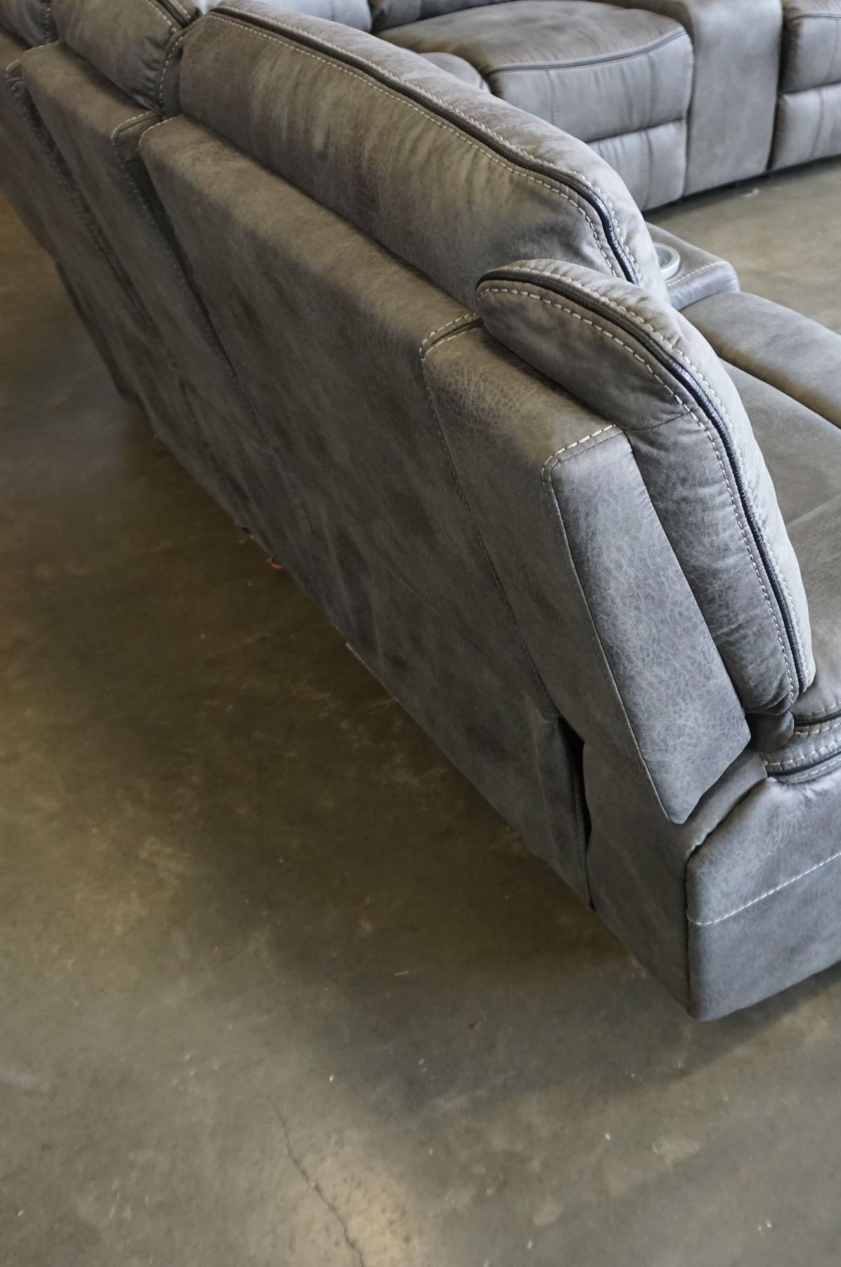 BRAND NEW MODERN GREY STITCHED MICROSUEDE 3 PIECE SECTIONAL SOFA, WITH 3 POWER RECLINERS, 2 CONSOLES, AND ILLUMINATED CUP HOLDERS, RETAIL $4199. ***BUYER TO RECEIVE A BRAND NEW SET IN BOXES, NOT A FLOOR MODEL!