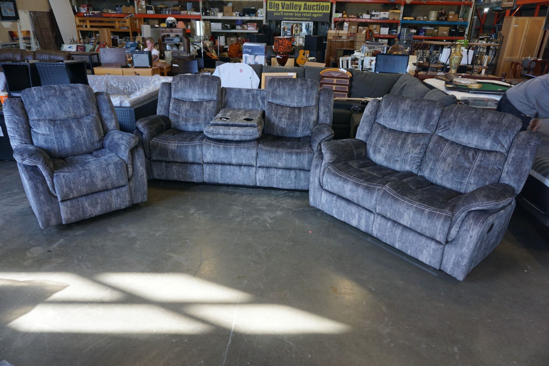 BRAND NEW MODERN VELVET 3 PIECE SOFA SET W/ DROP DOWN CONSOLE AND ROCKING RECLINER - RETAIL $2499