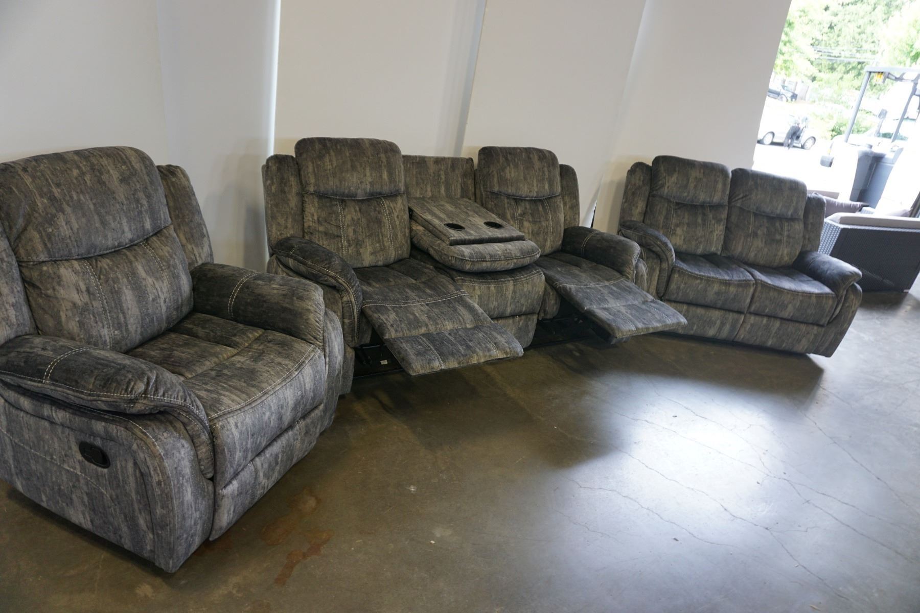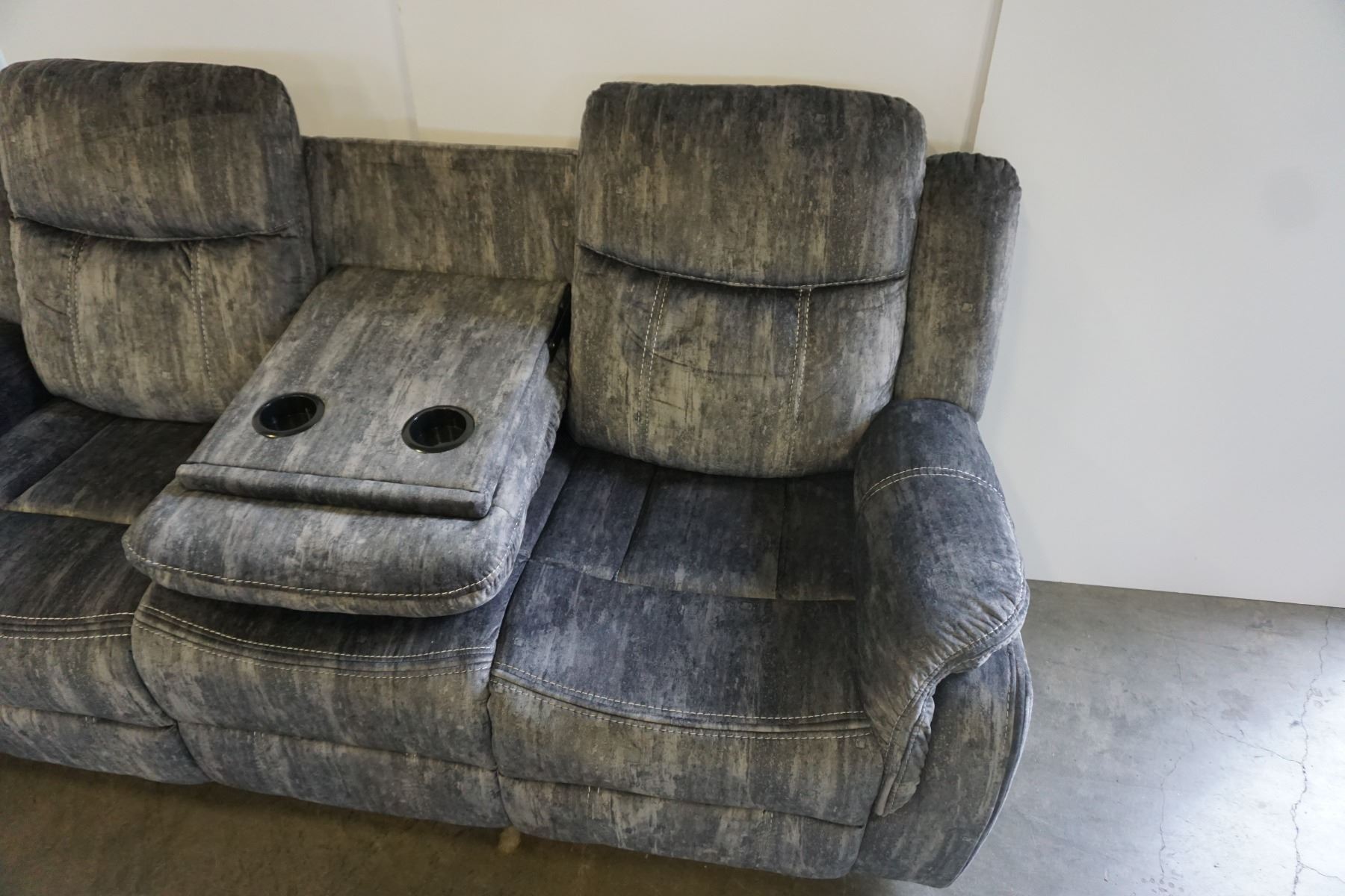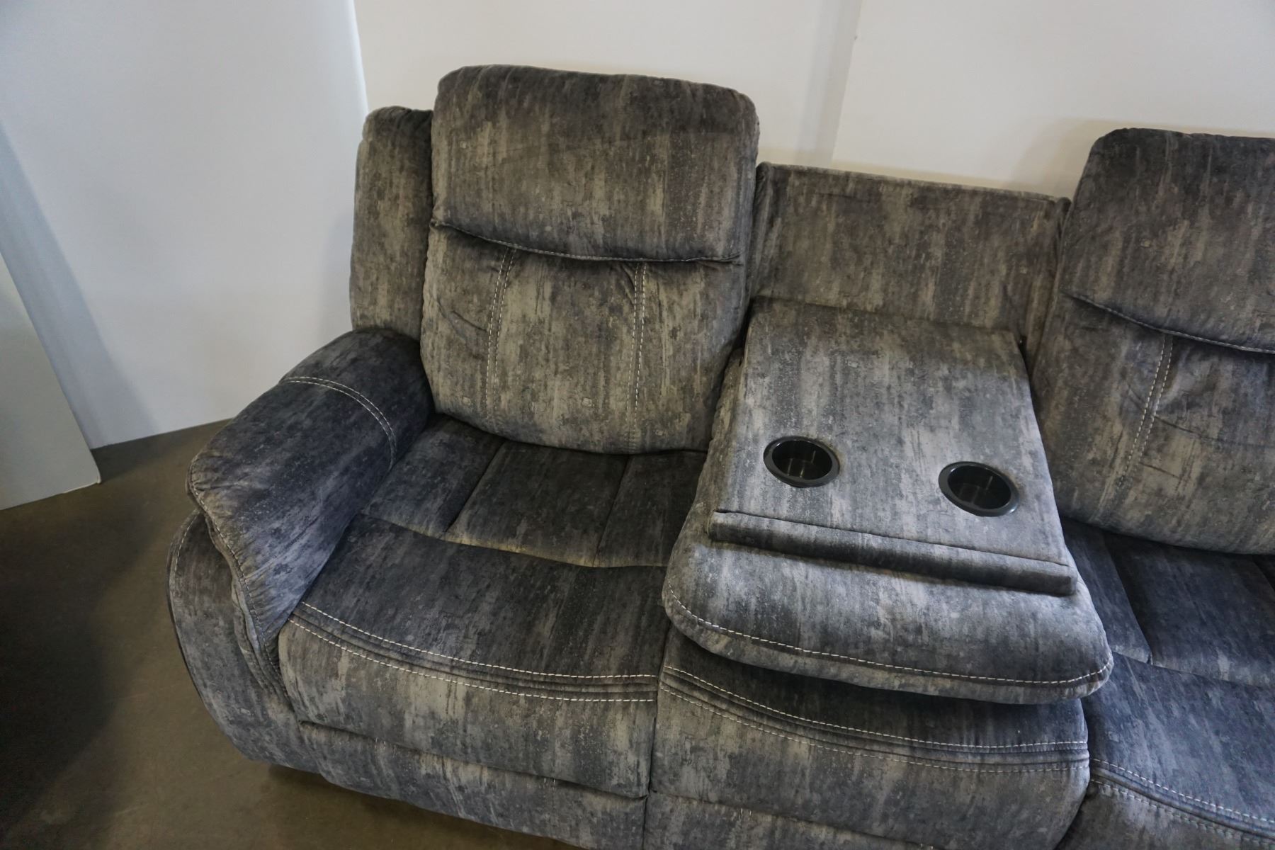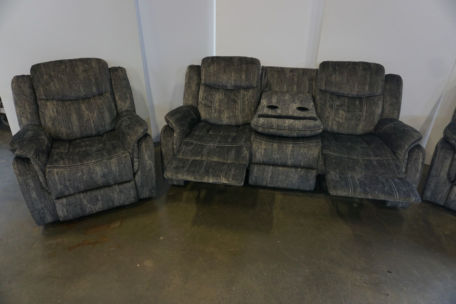 BRAND NEW MODERN VELVET 3 PIECE SOFA SET W/ DROP DOWN CONSOLE AND ROCKING RECLINER - RETAIL $2899