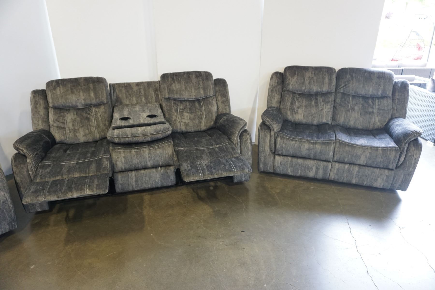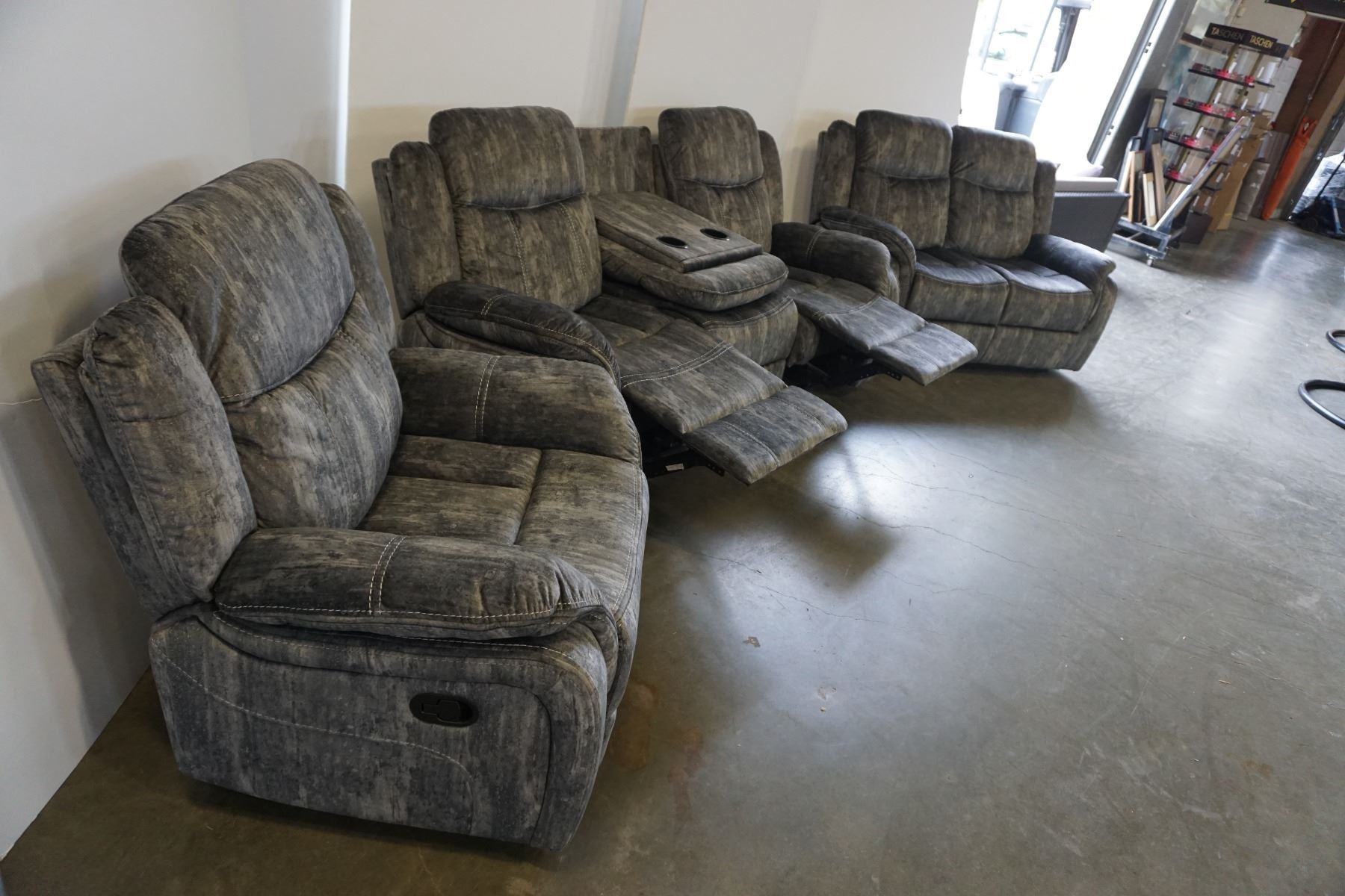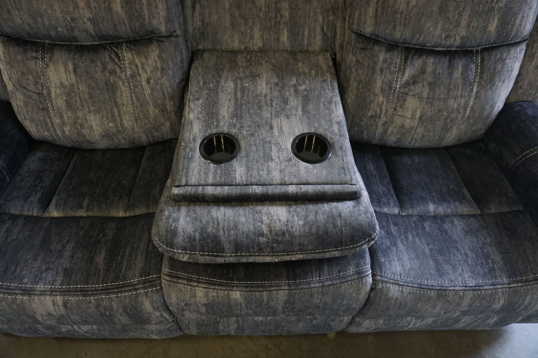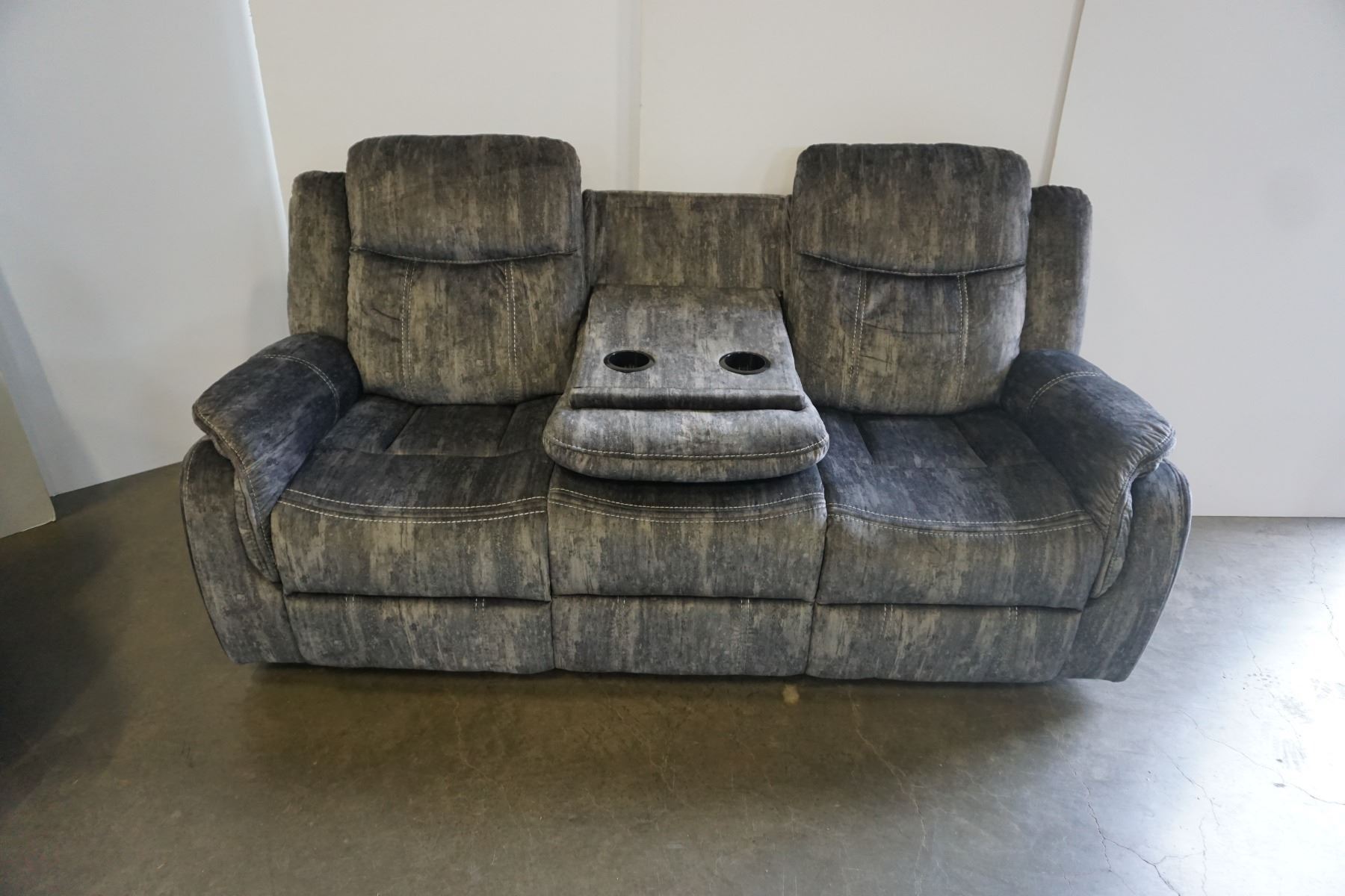 BRAND NEW MODERN VELVET 3 PIECE SOFA SET W/ DROP DOWN CONSOLE AND ROCKING RECLINER - RETAIL $2899