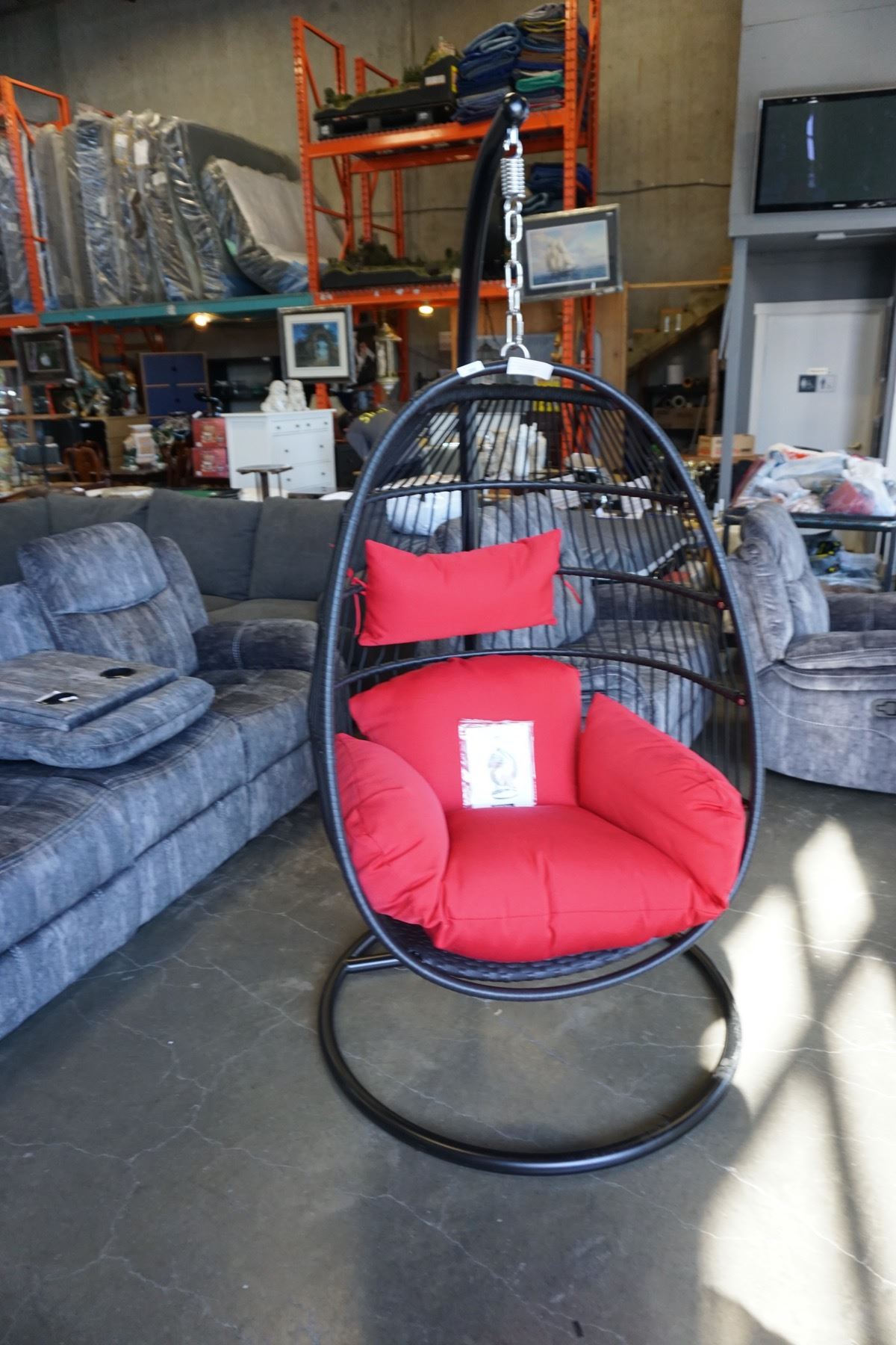 BRAND NEW OUTDOOR MODERN FOLDABLE HANGING CHAIR W/ RED CUSHIONS - RETAIL $949 AND RATED FOR 300LBS