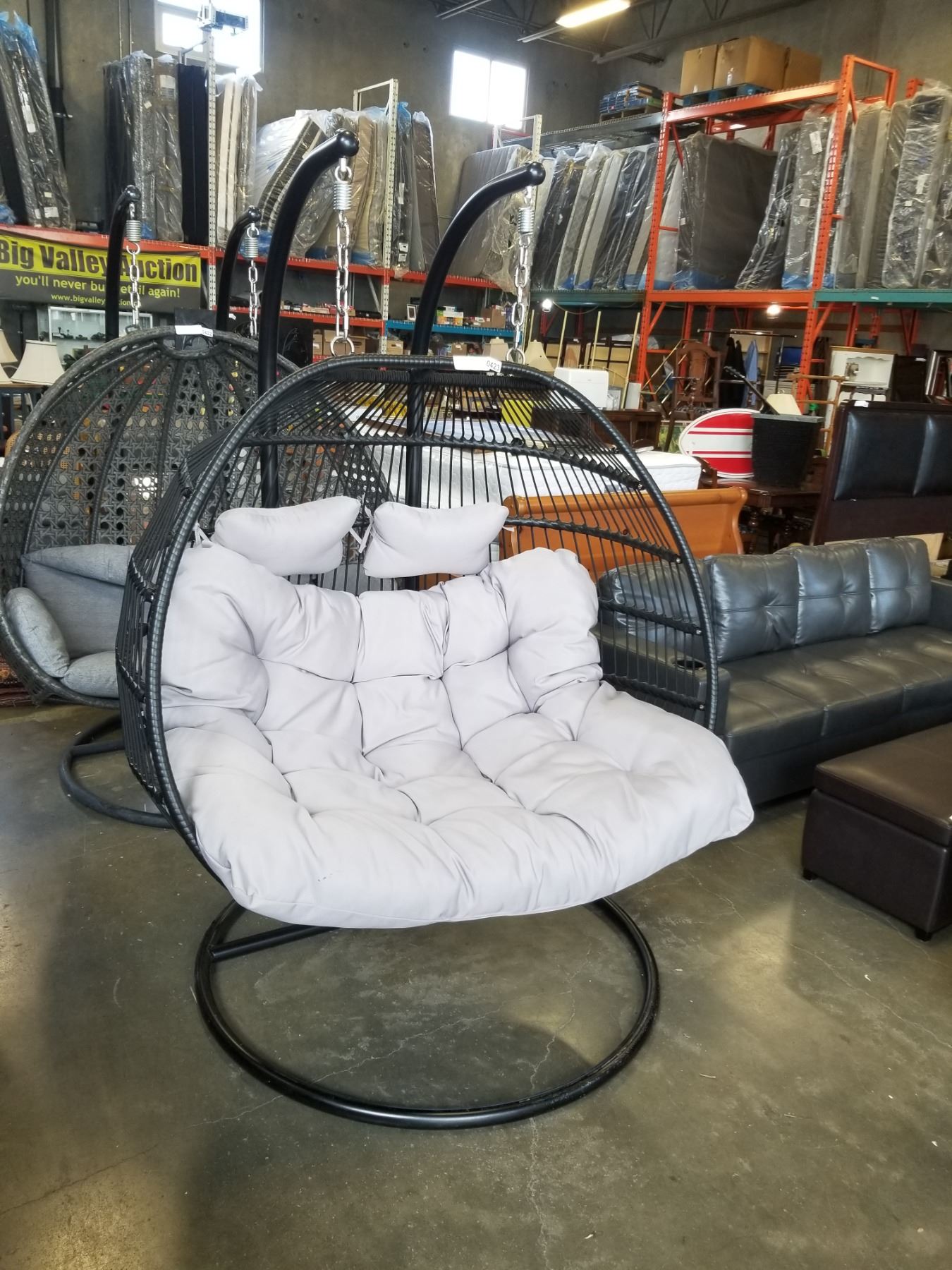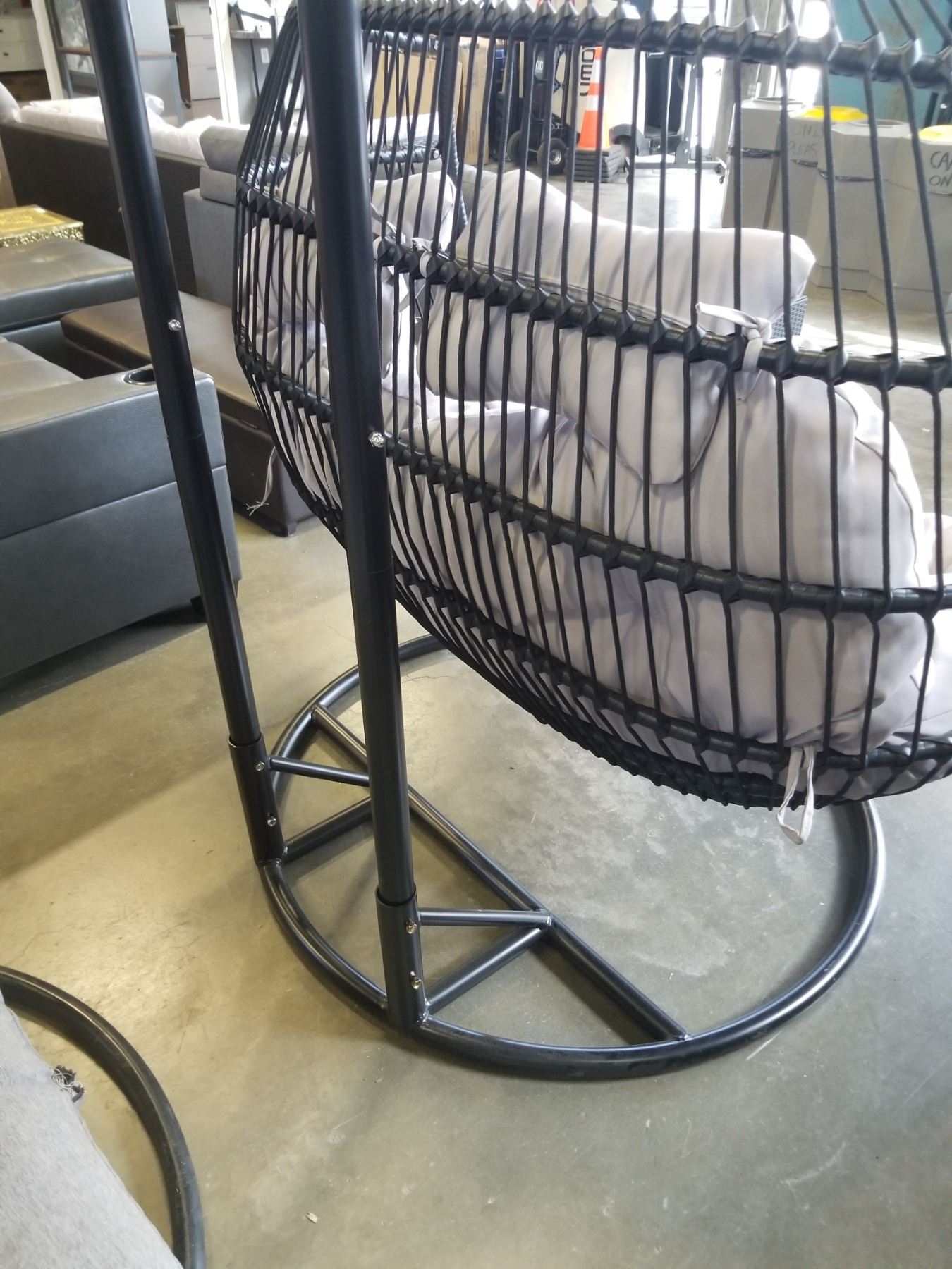 BRAND NEW OUTDOOR RATTAN FOLDABLE DOUBLE HANGING CHAIR W/ LIGHT GREY CUSHIONS - RETAIL $1299