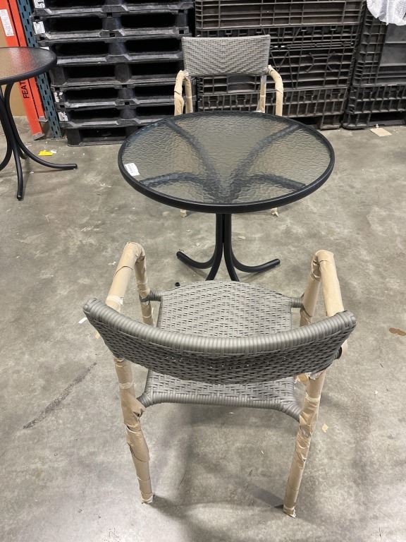 BRAND NEW PATIO BISTRO SET, GLASS TOP ROUND PATIO TABLE, 30 INCH DIAMETER AND 2 STACKING GREY STAINLESS AND RATTAN CHAIRS