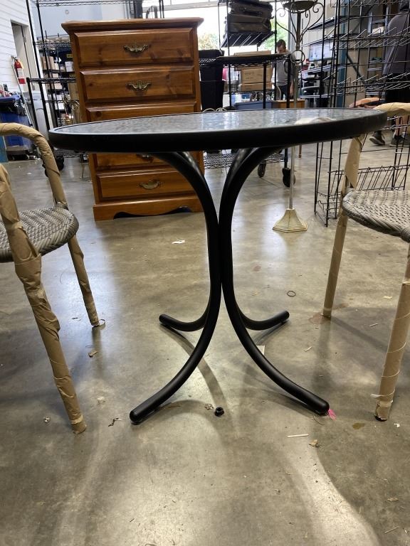 BRAND NEW PATIO BISTRO SET, GLASS TOP ROUND PATIO TABLE, 30 INCH DIAMETER AND 2 STACKING GREY STAINL