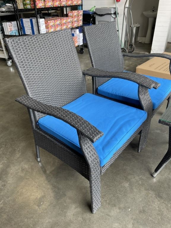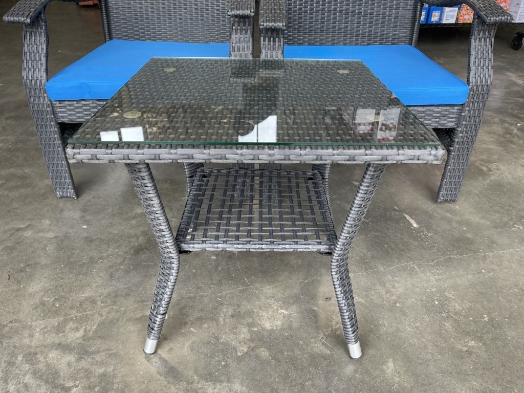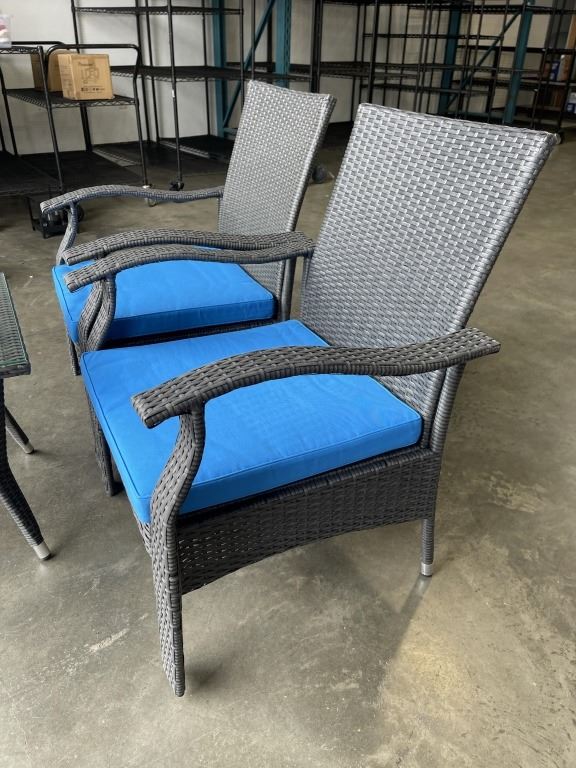 BRAND NEW PATIO FLARE 'WHYLIE' 3PC CHAT SET WITH BLUE CUSHIONS, RETAIL $669