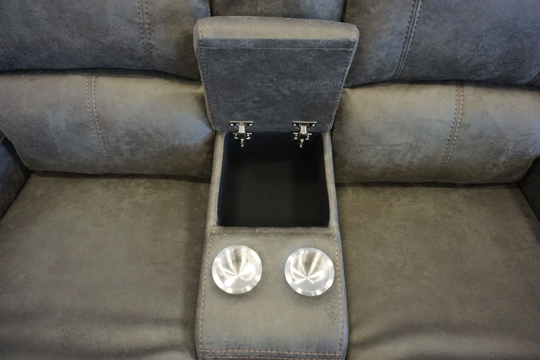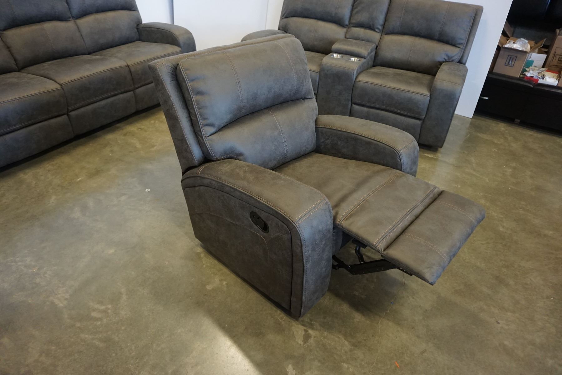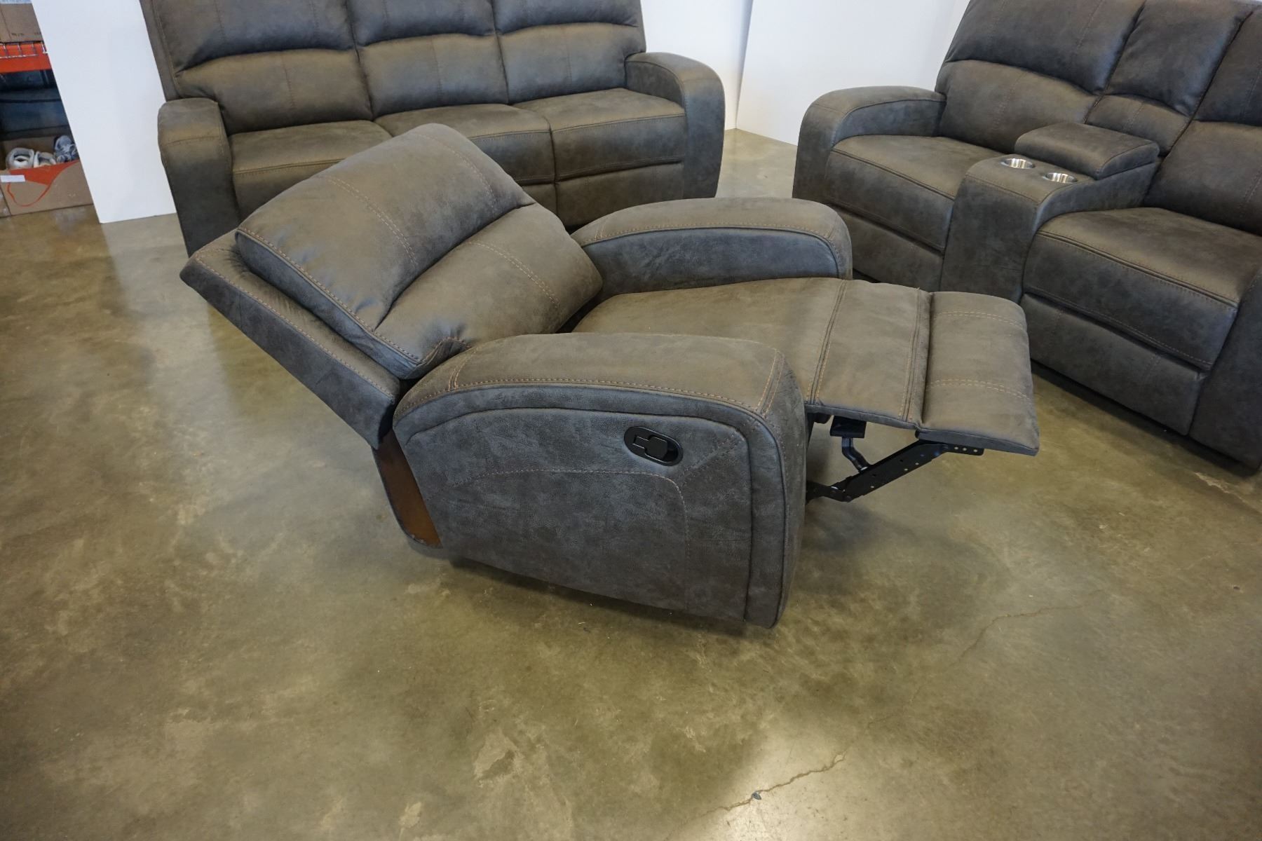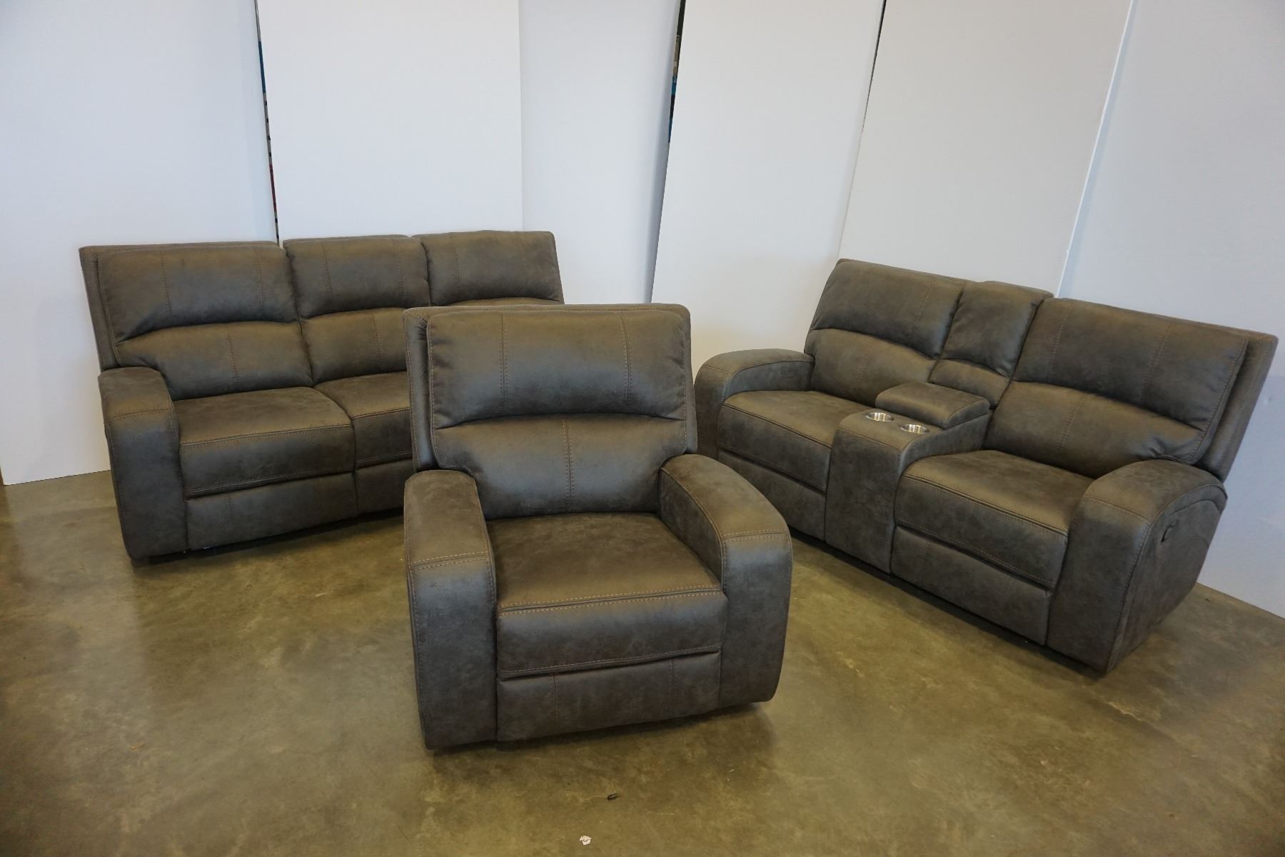 BRAND NEW PERTH GREY FABRIC 3 PIECE RECLINING SOFA SET LOVESEAT W/ CONSOLE - RETAIL $3099