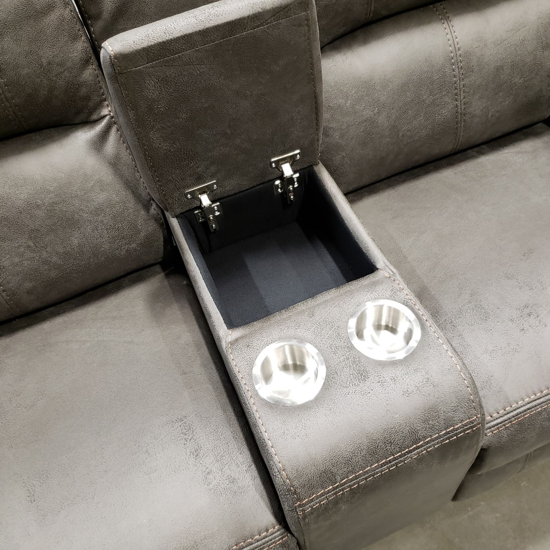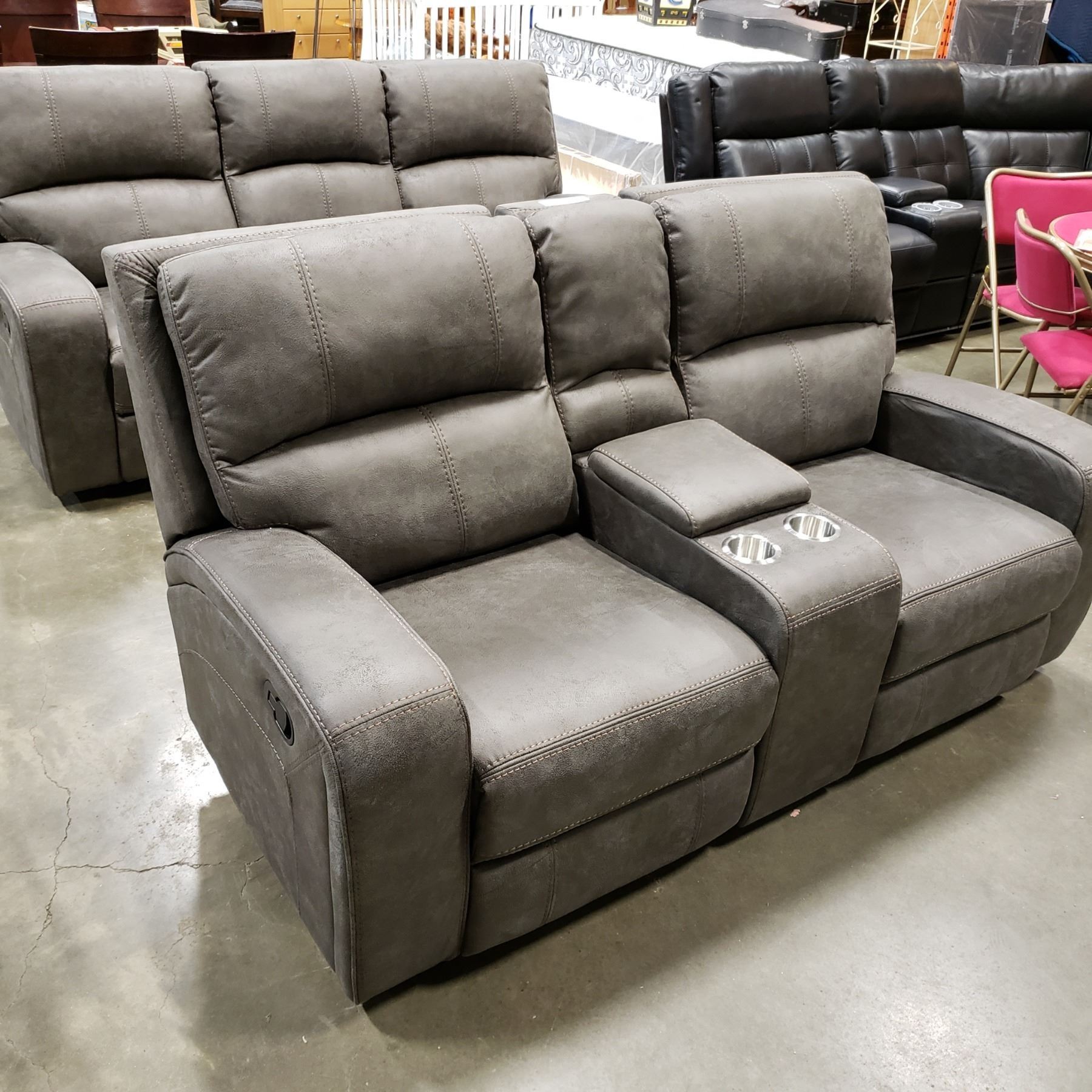 BRAND NEW PERTH RECLINING SOFA AND LOVESEAT, GREY PALOMINO FABRIC,WITH CONSOLE AND CUPHOLDERS, RETAI