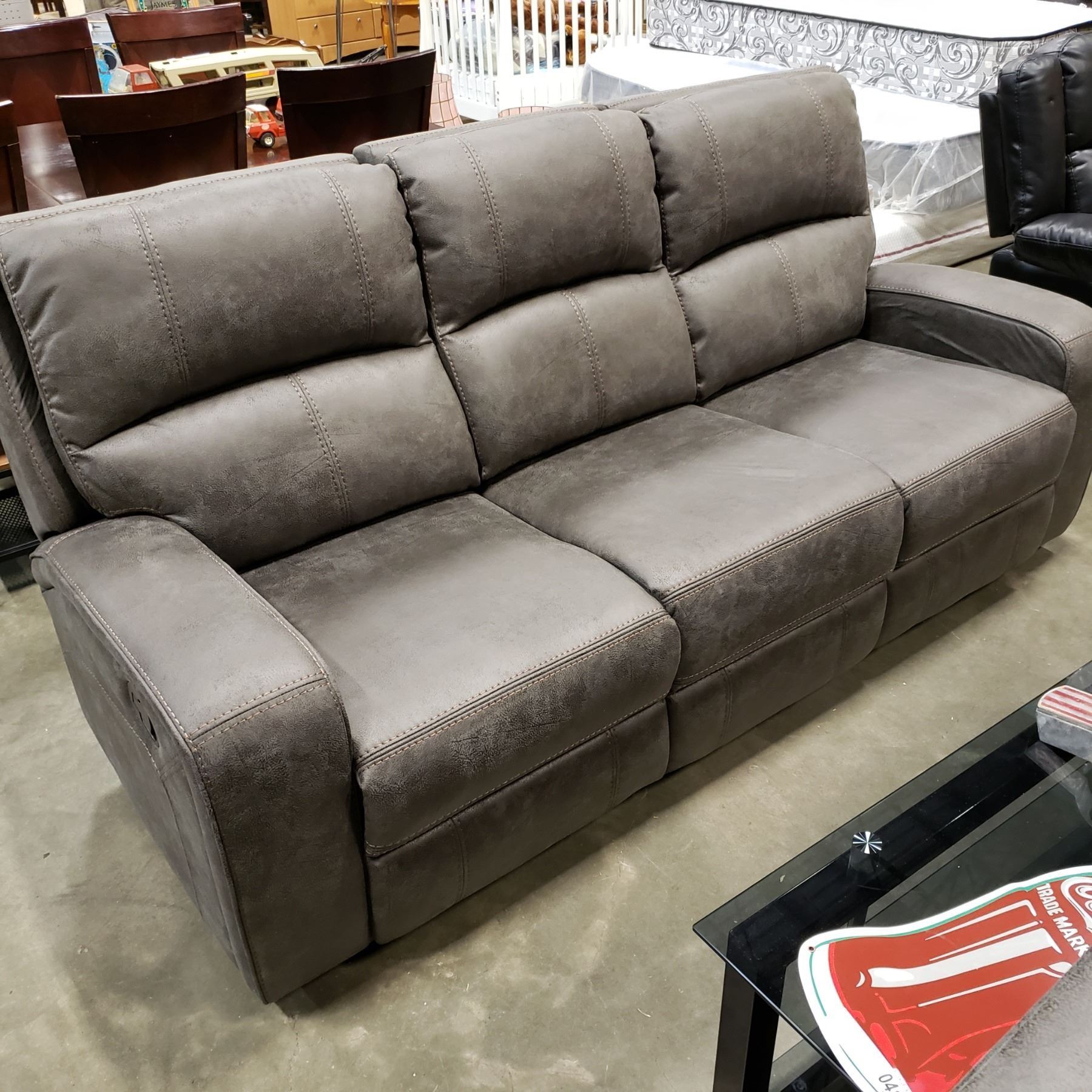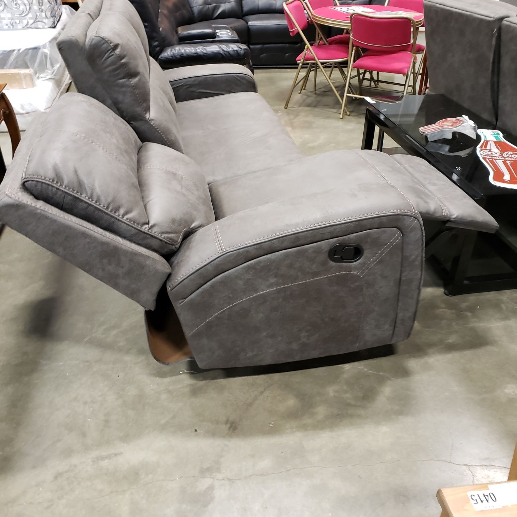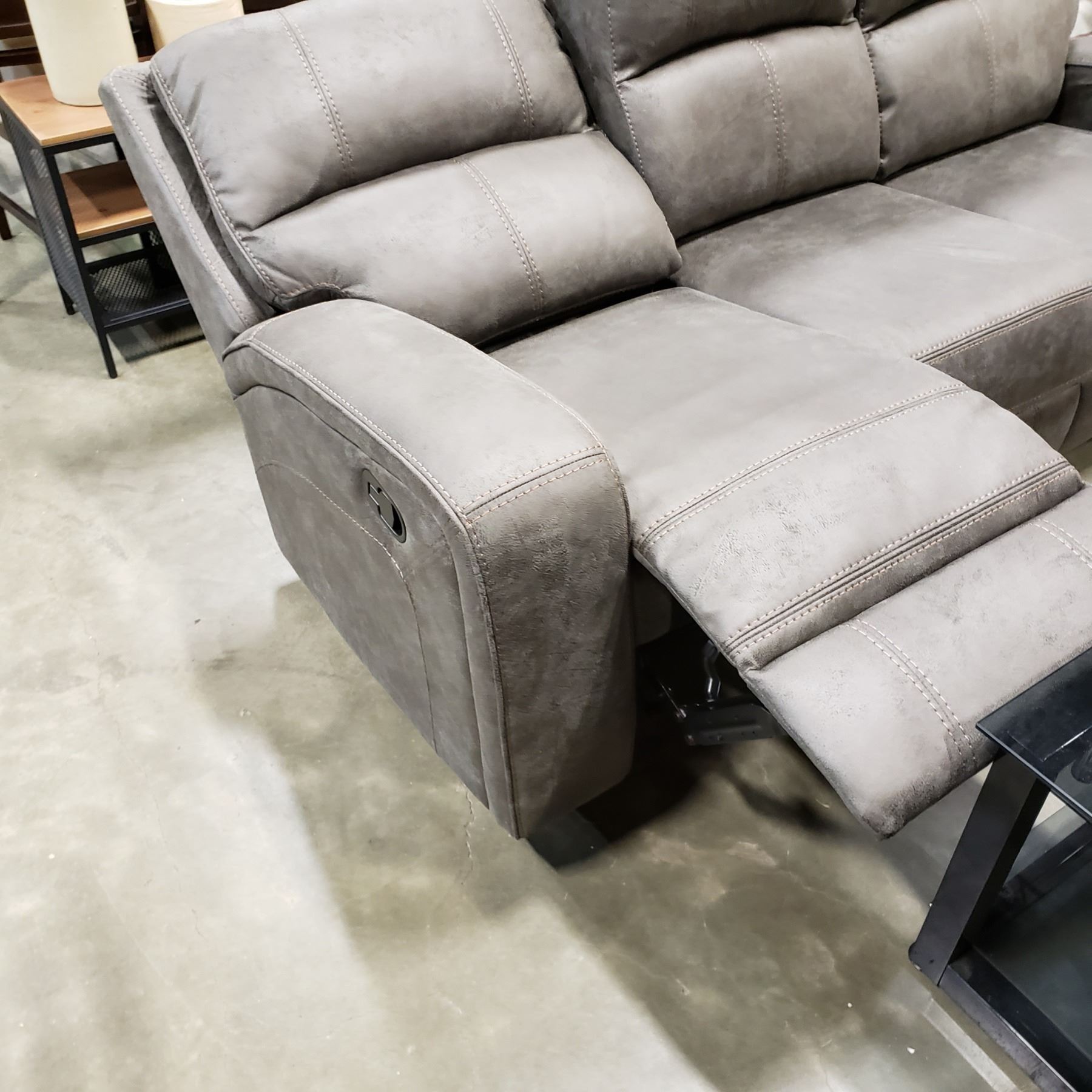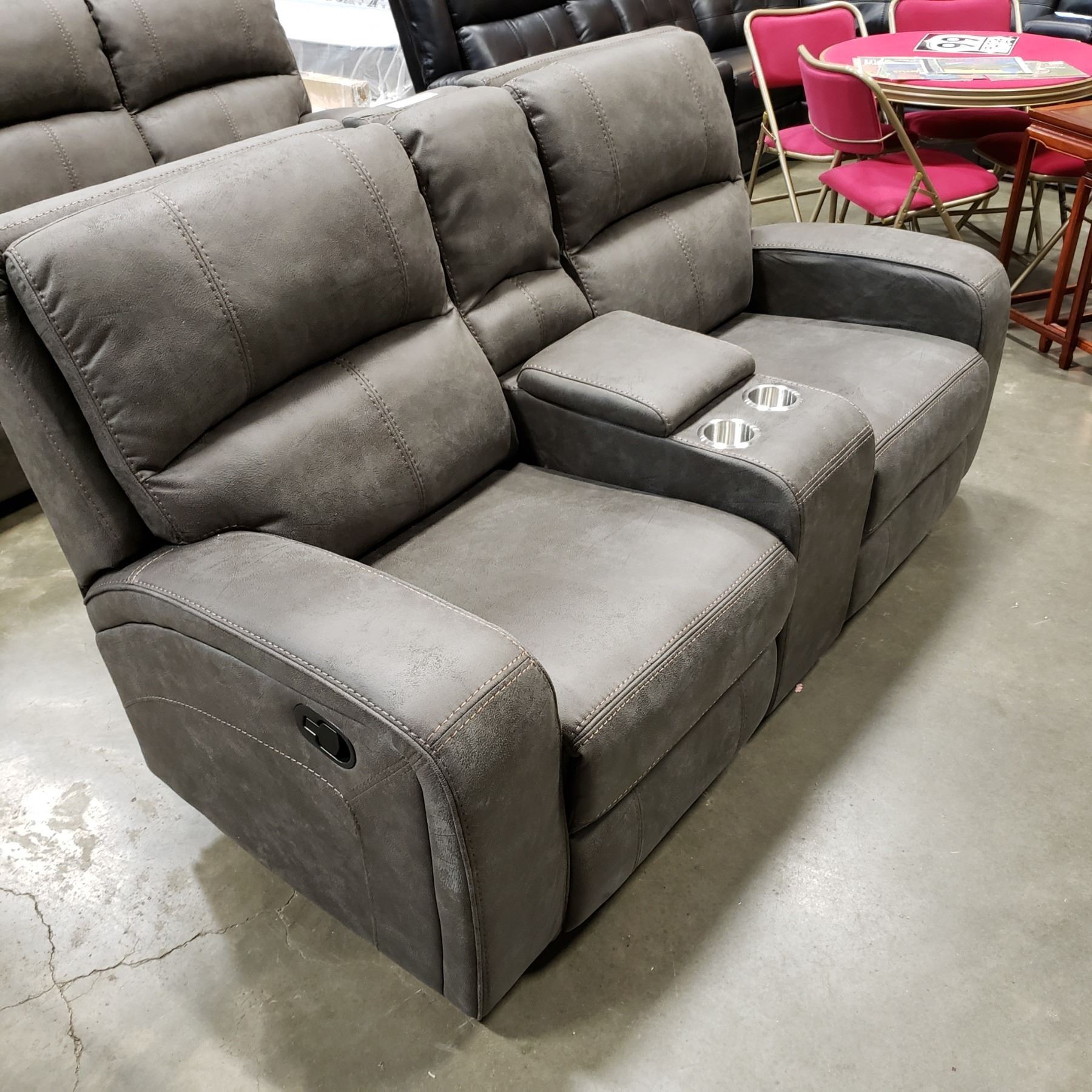 BRAND NEW PERTH RECLINING SOFA AND LOVESEAT, GREY PALOMINO FABRIC,WITH CONSOLE AND CUPHOLDERS, RETAI