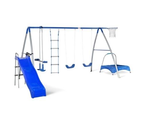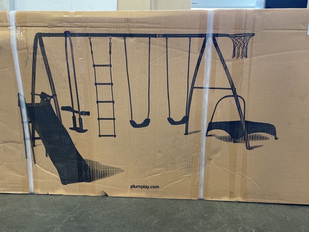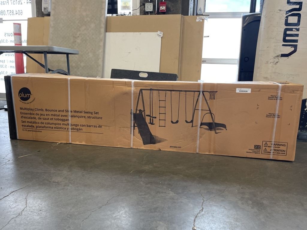 BRAND NEW PLUM MULTIPLAYER OUTDOOR SWING SET W/ CLIMB, BOUNCE, AND SLIDE - RETAIL $1099