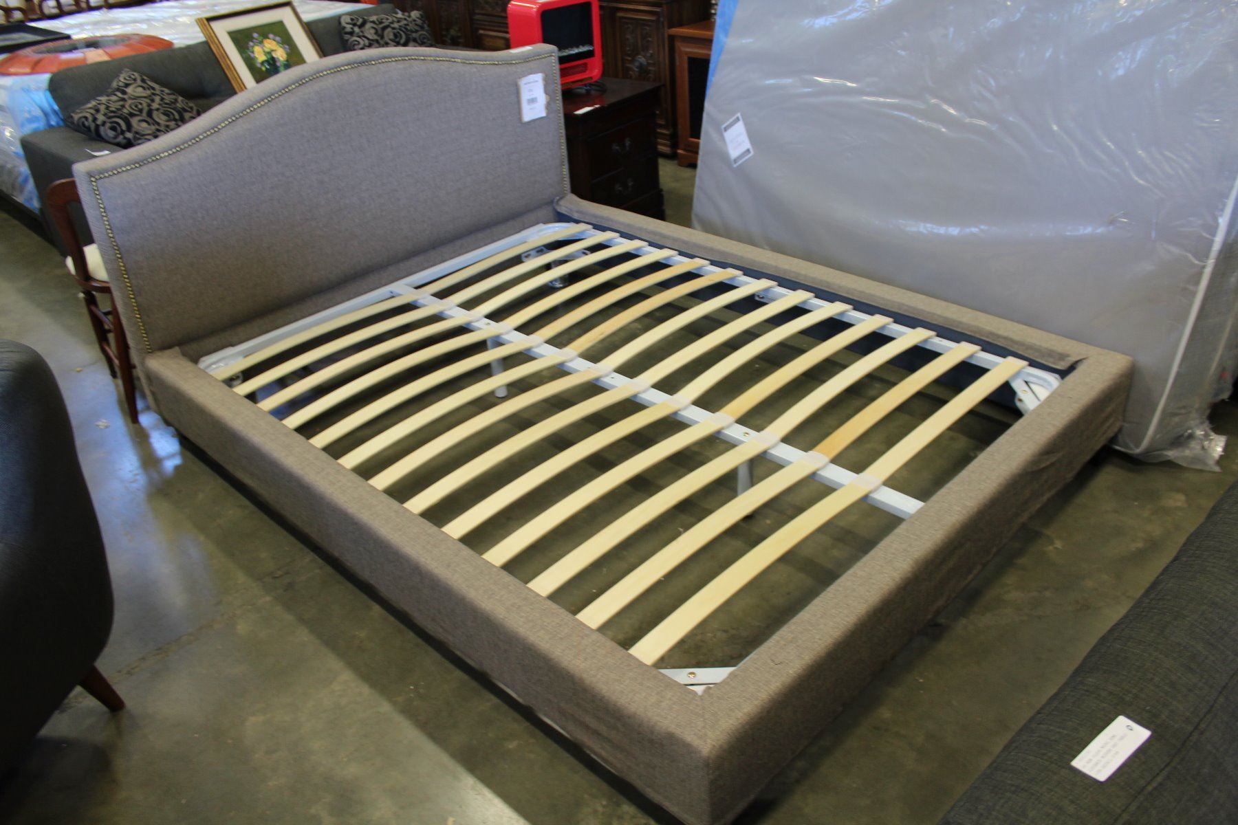 BRAND NEW QUEENSIZE HUNTINGTON BEDFRAME PLATFORM STYLE WITH STUDDED BRASS ACCENT IN GREY FABRIC RETAIL $1199