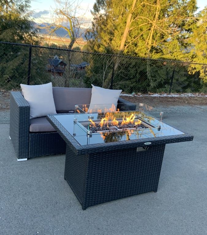 BRAND NEW RATTAN AND GLASS TOP FIRE TABLE RETAIL $999, POWDER COATED ALUMINUM FRAME, 55,000 BTU, CSA