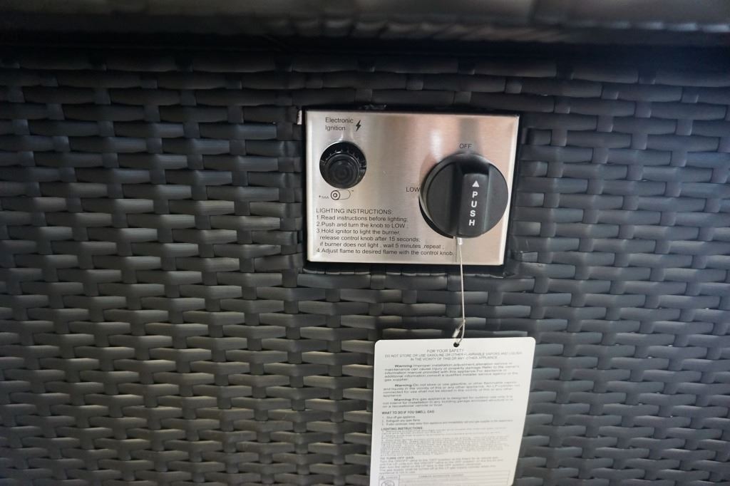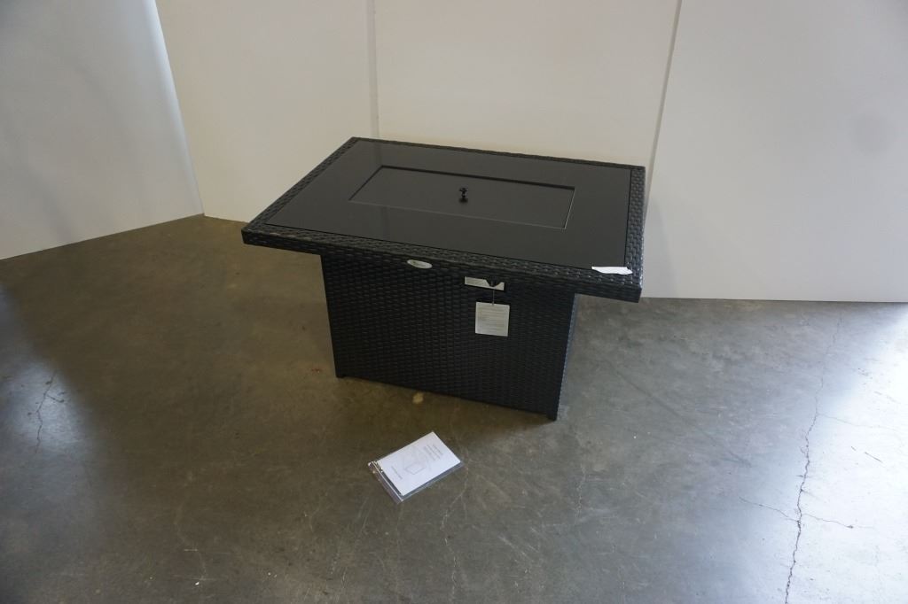 BRAND NEW RATTAN AND GLASS TOP FIRE TABLE RETAIL $999, POWDER COATED ALUMINUM FRAME, 55,000 BTU, CSA