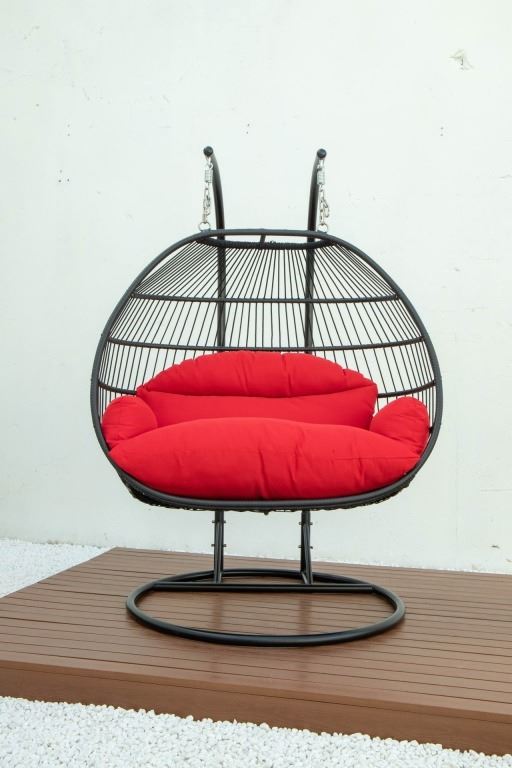 BRAND NEW RED DOUBLE HANGING EGG CHAIR - RETAIL $1969 W/ FOLDABLE FRAME, POWDER COATED STEEL FRAME,
