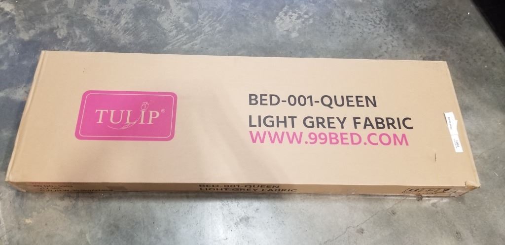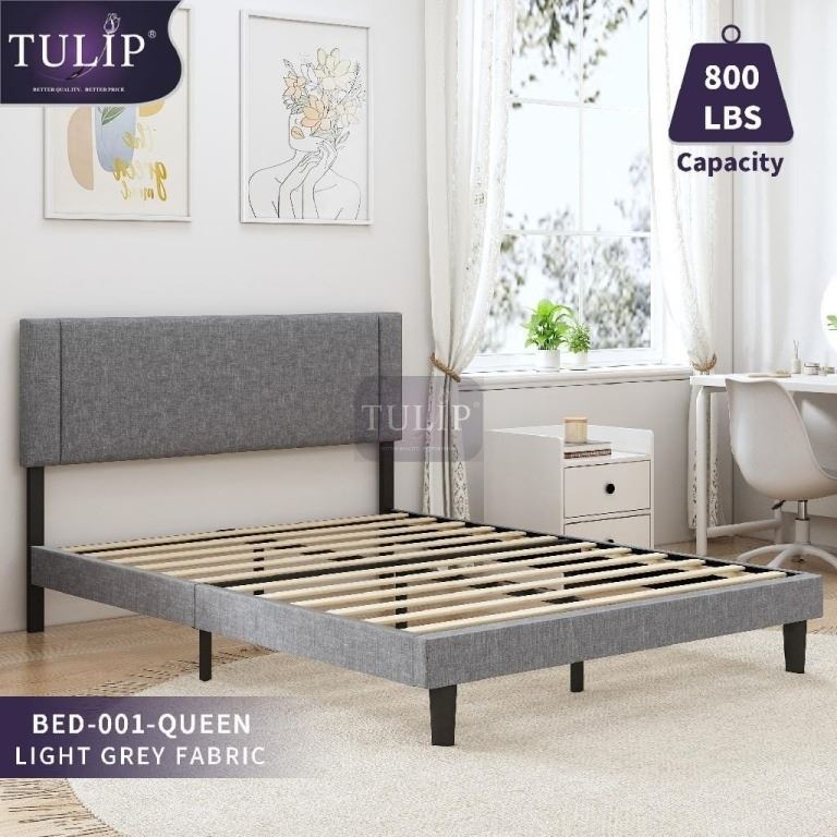 BRAND NEW TULIP QUEENSIZE PLATFORM BEDFRAME IN LIGHT GREY FABRIC MODEL 001 retail $499