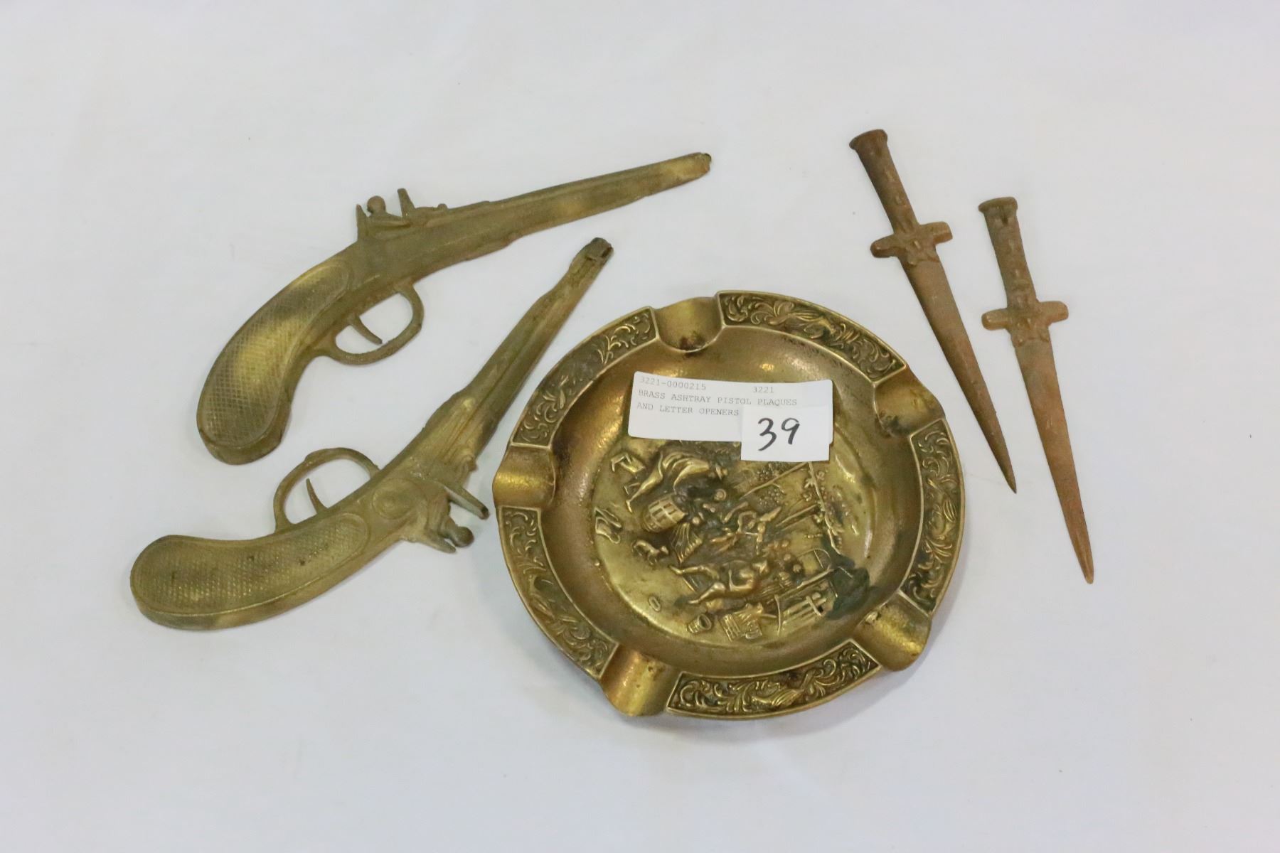 BRASS ASHTRAY PISTOL PLAQUES AND LETTER OPENERS