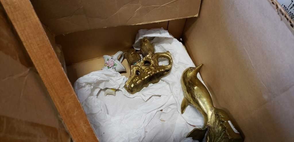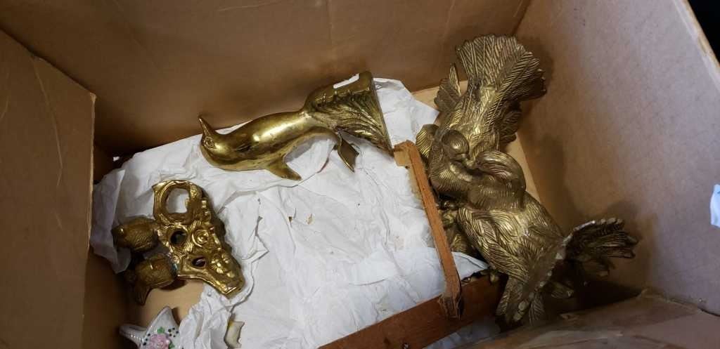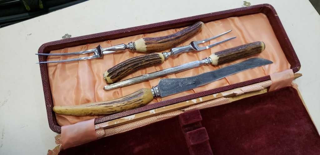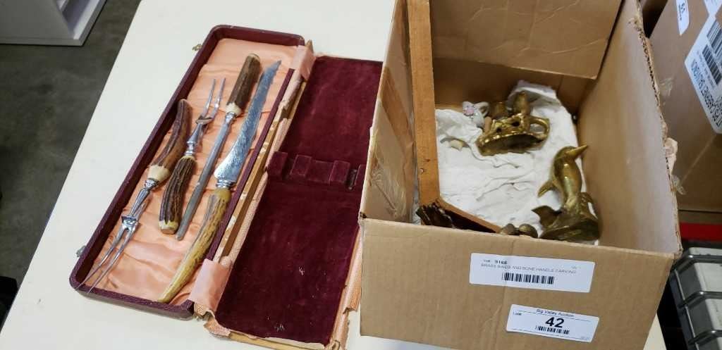 BRASS BIRDS AND BONE HANDLE CARVING SET