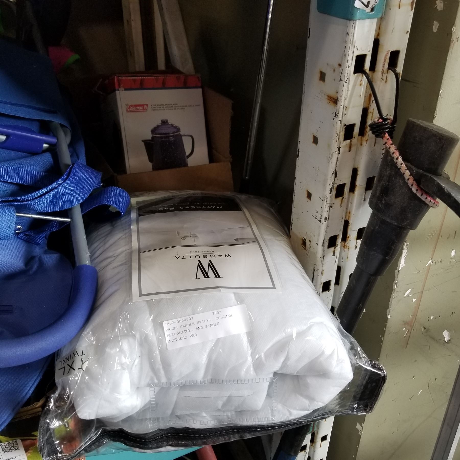 BRASS CANDLE STICKS, COLEMAN PERCOLATOR, AND SINGLE MATTRESS PAD