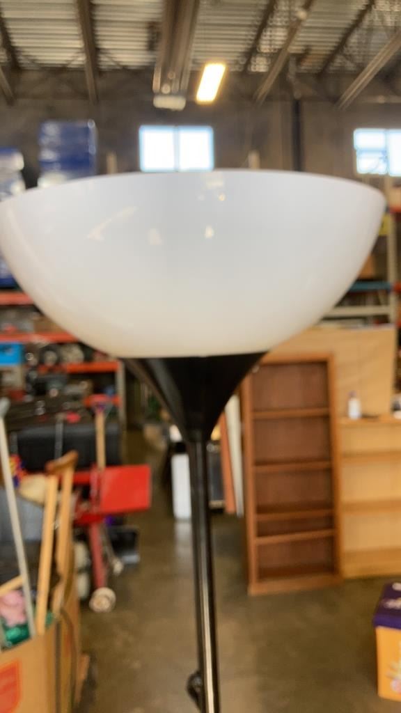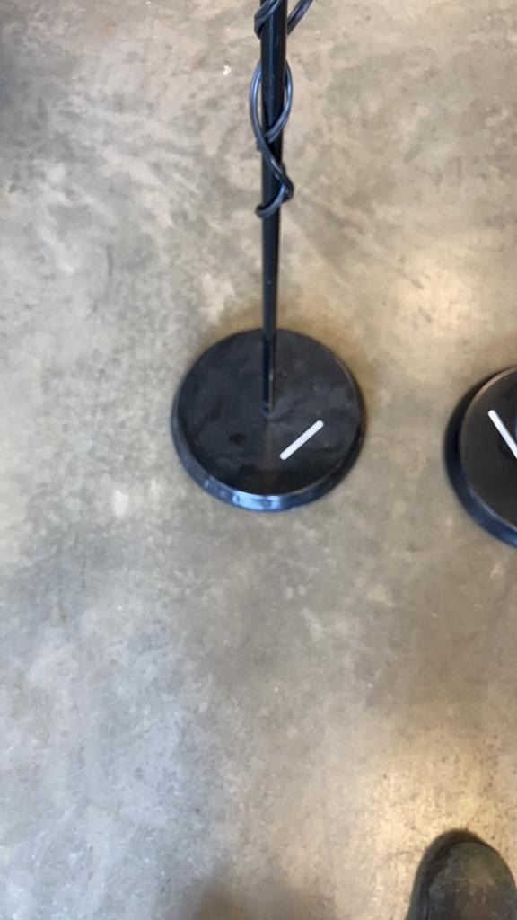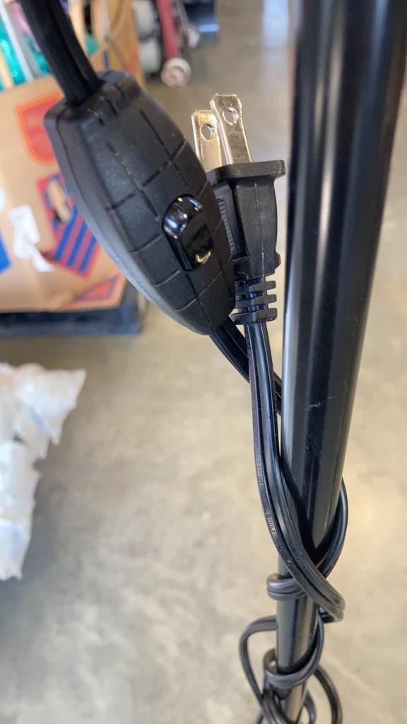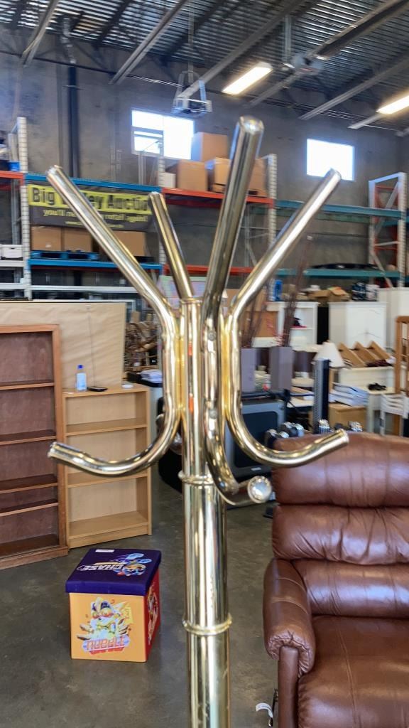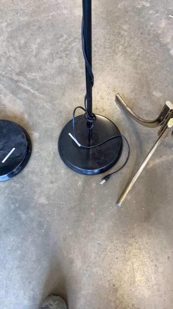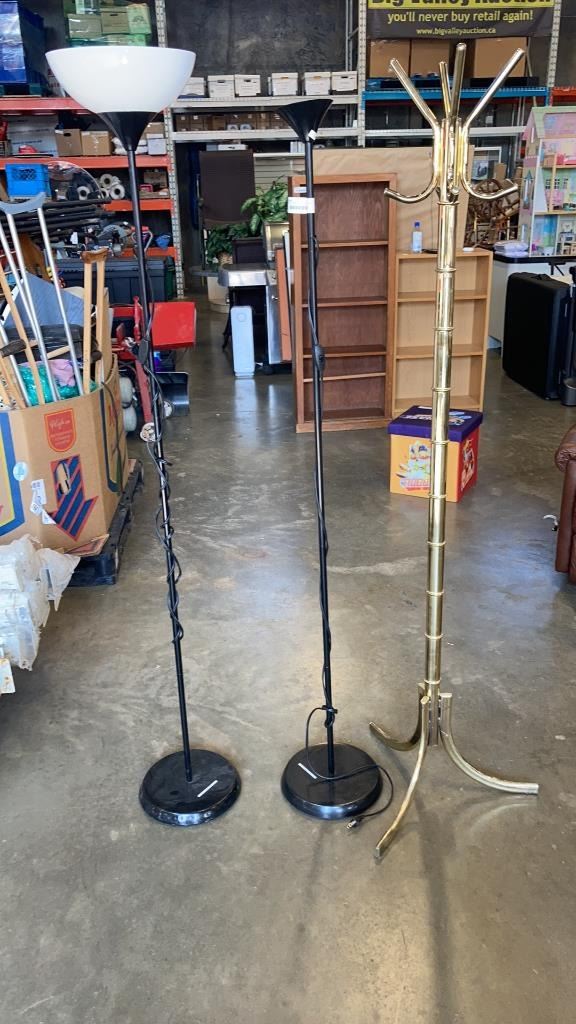 BRASS COAT TREE AND 2 BLACK FLOOR LAMPS