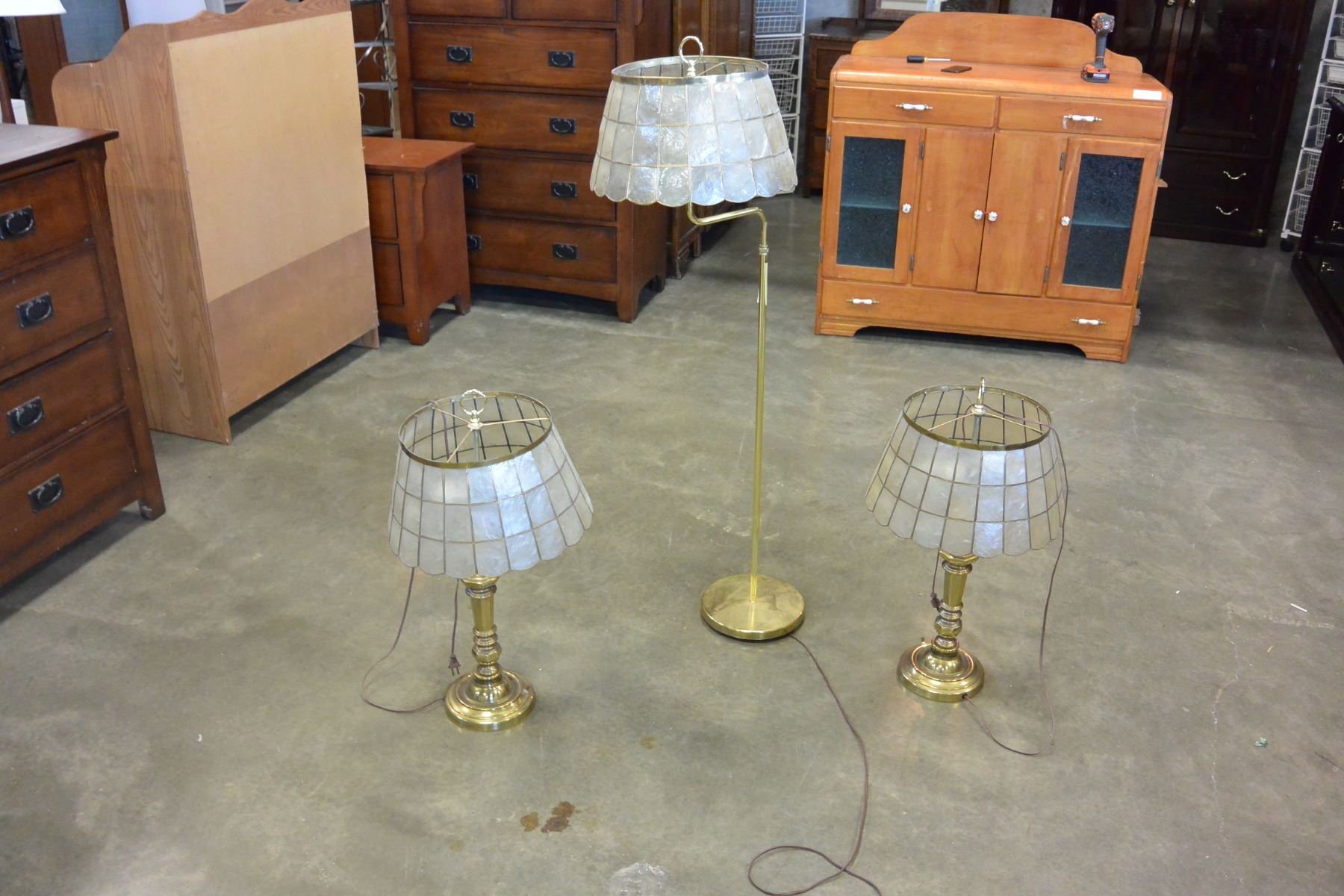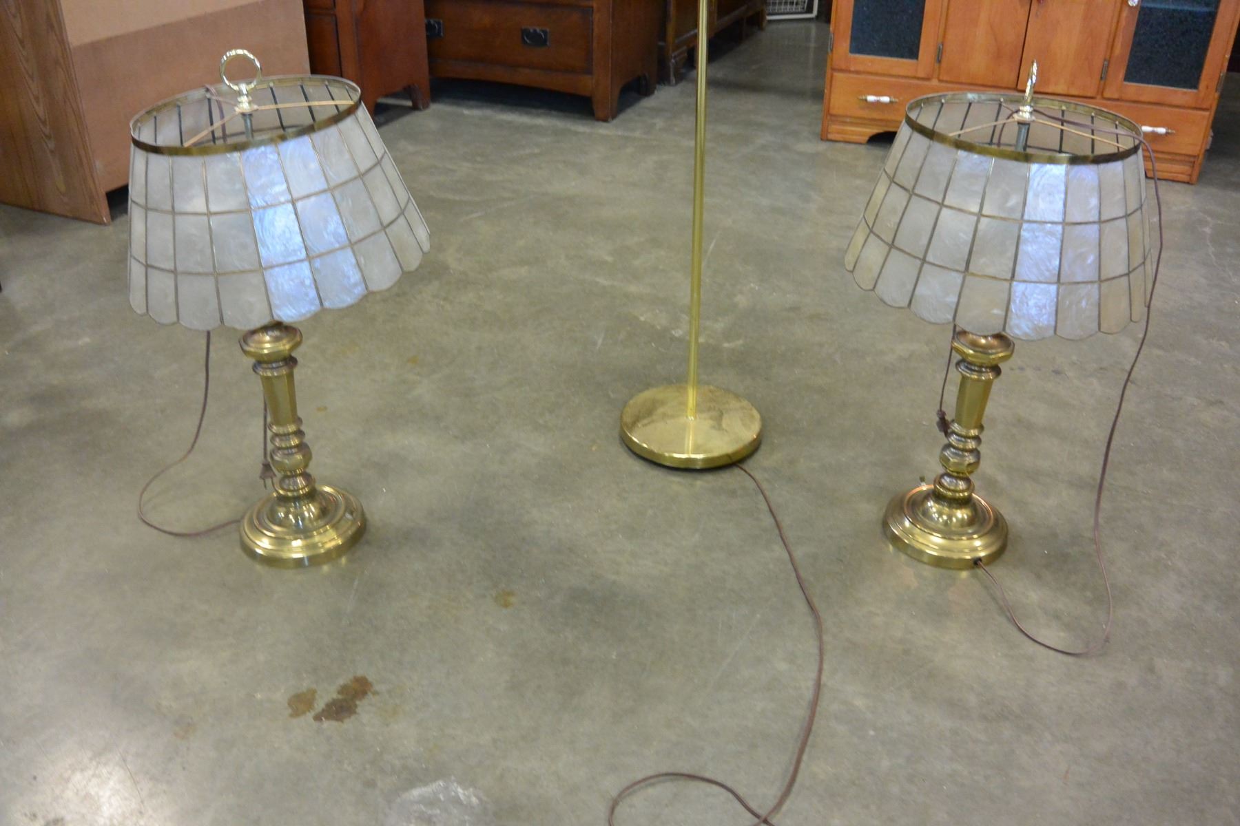 BRASS FLOOR LAMP AND TWO TABLE LAMPS