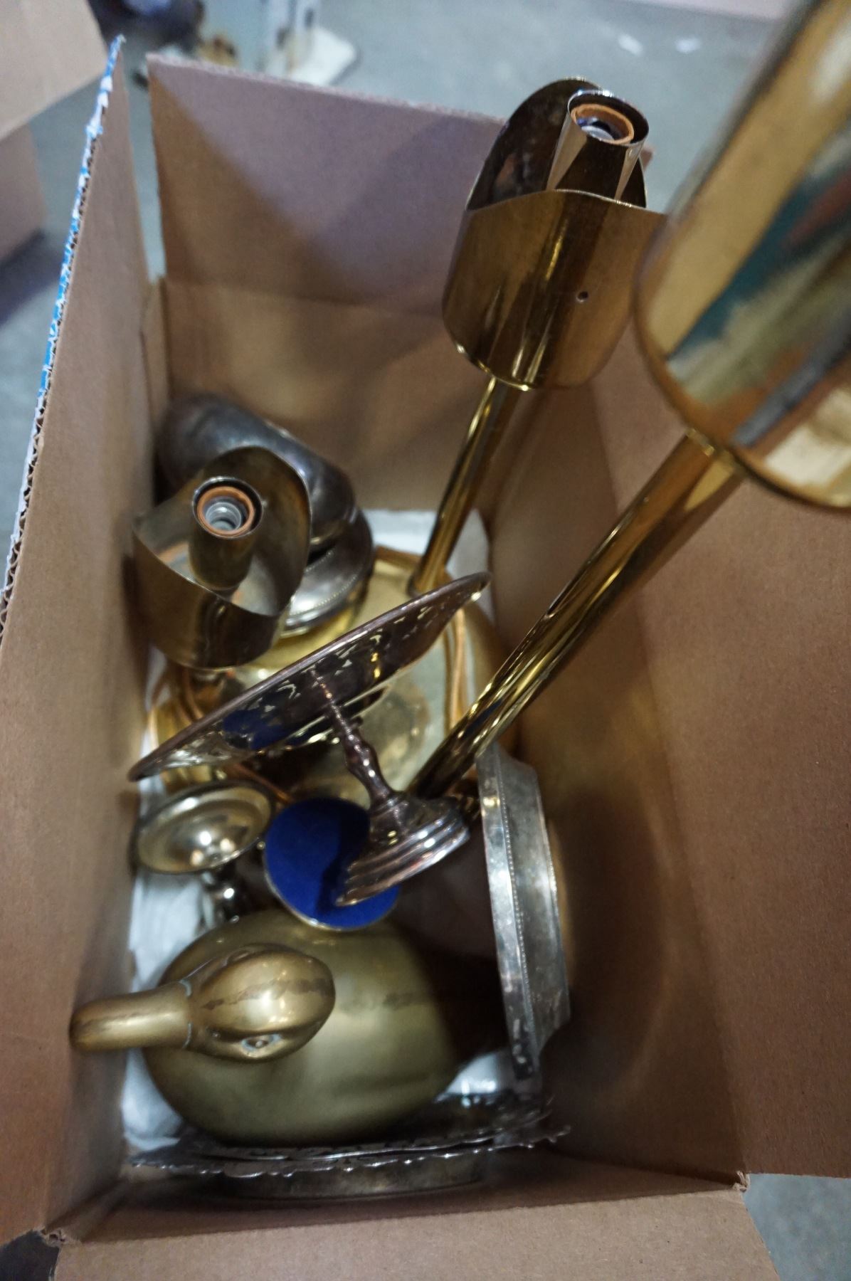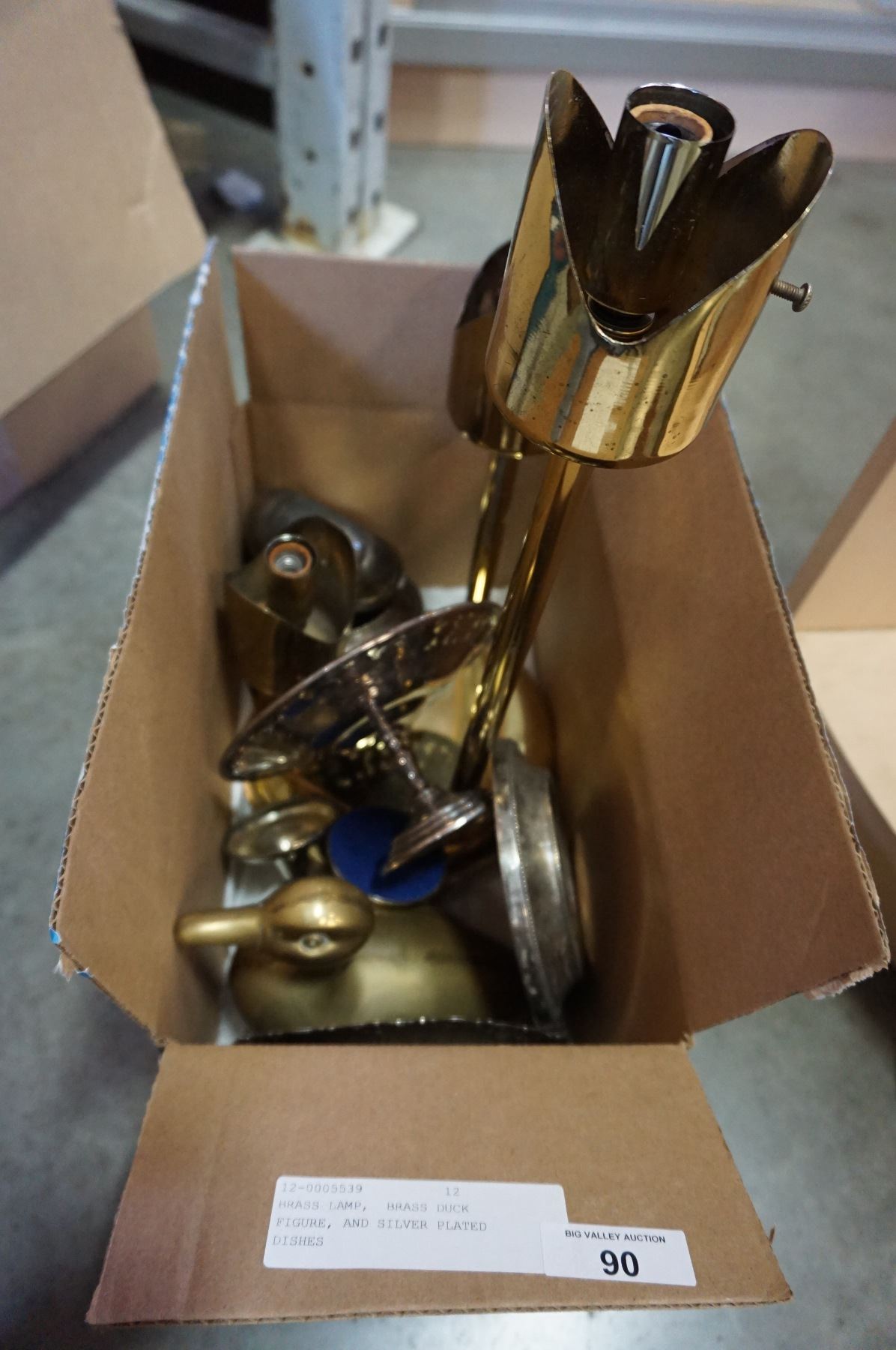 BRASS LAMP, BRASS DUCK FIGURE, AND SILVER PLATED DISHES