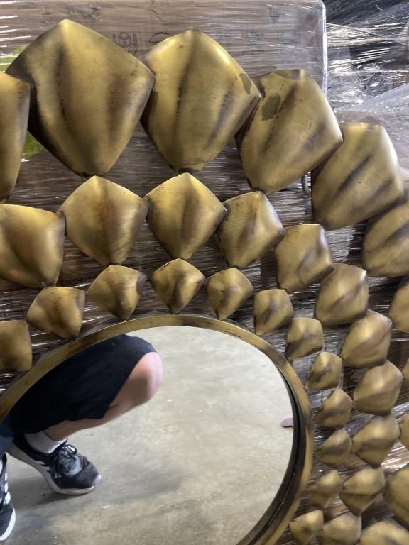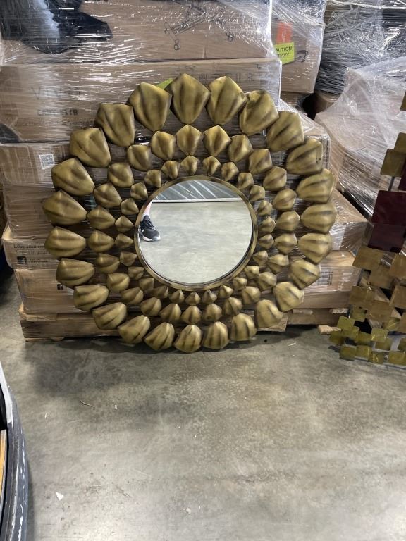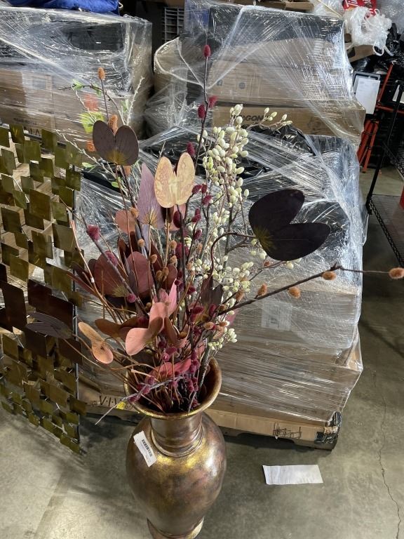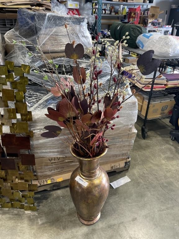 BRASS LOOK WALL ART AND MIRROR, AND VASE W/ DECORATIVE FLORALS