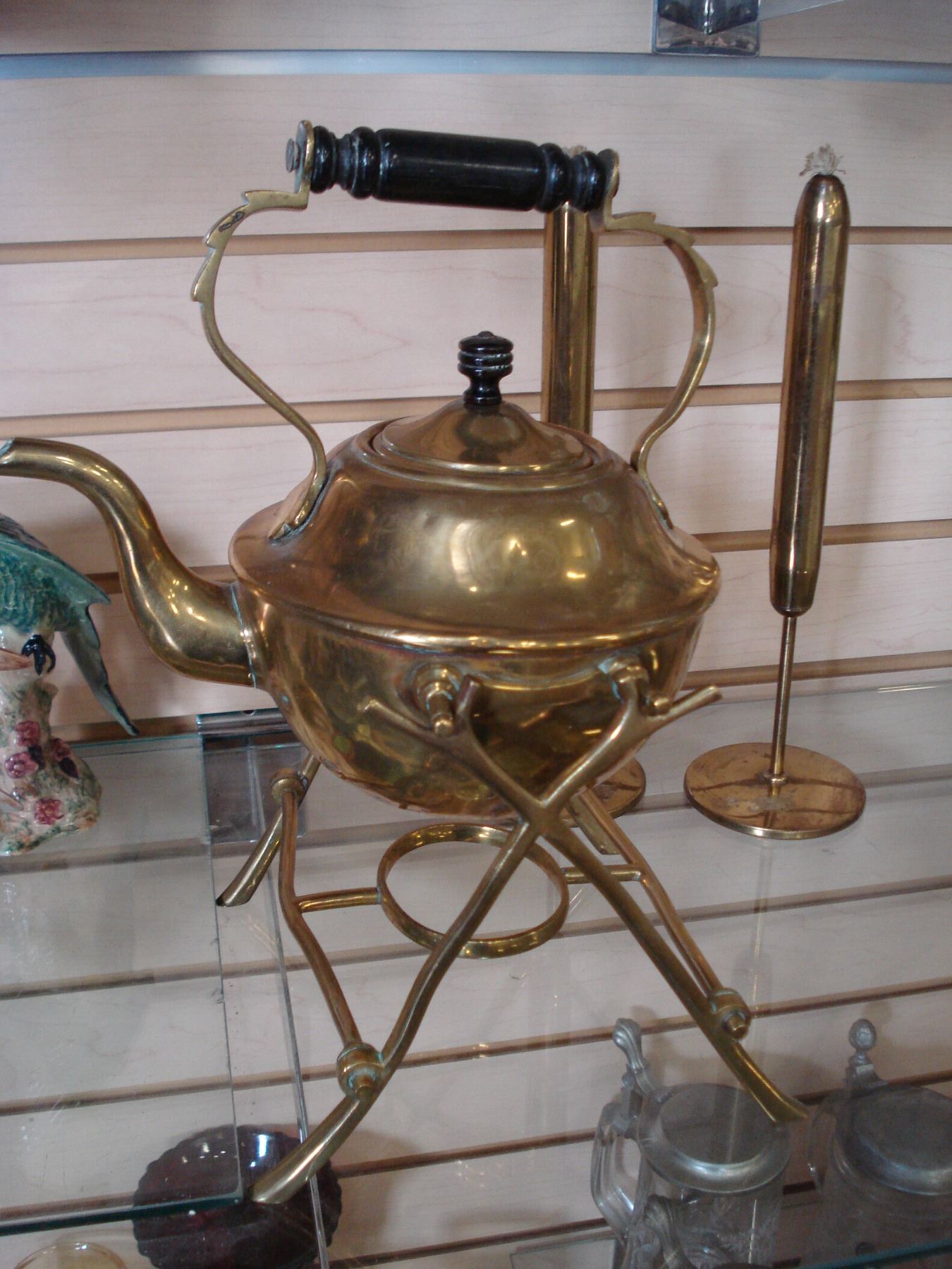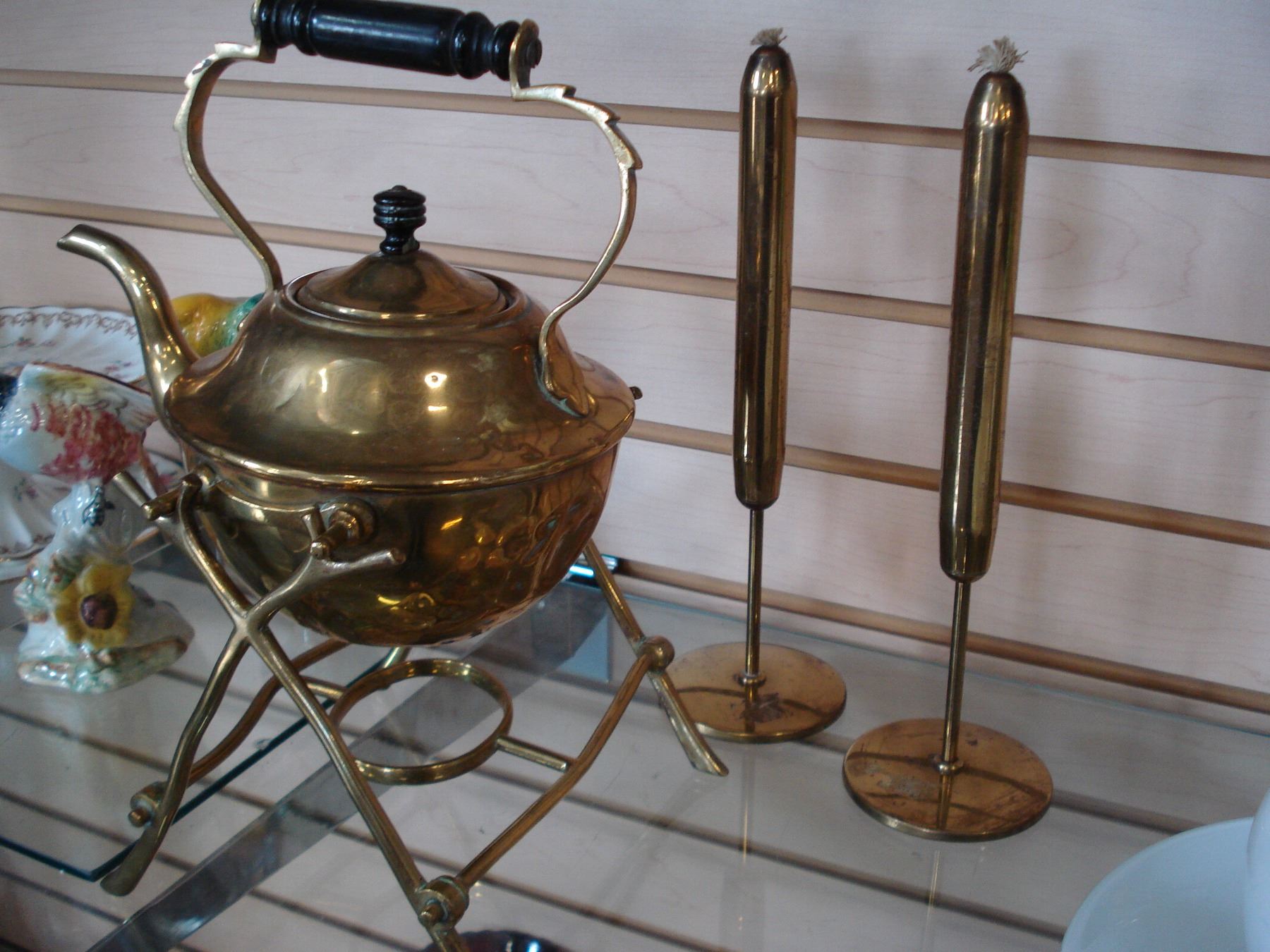 BRASS TODDY KETTLE AND CANDLE STICKS