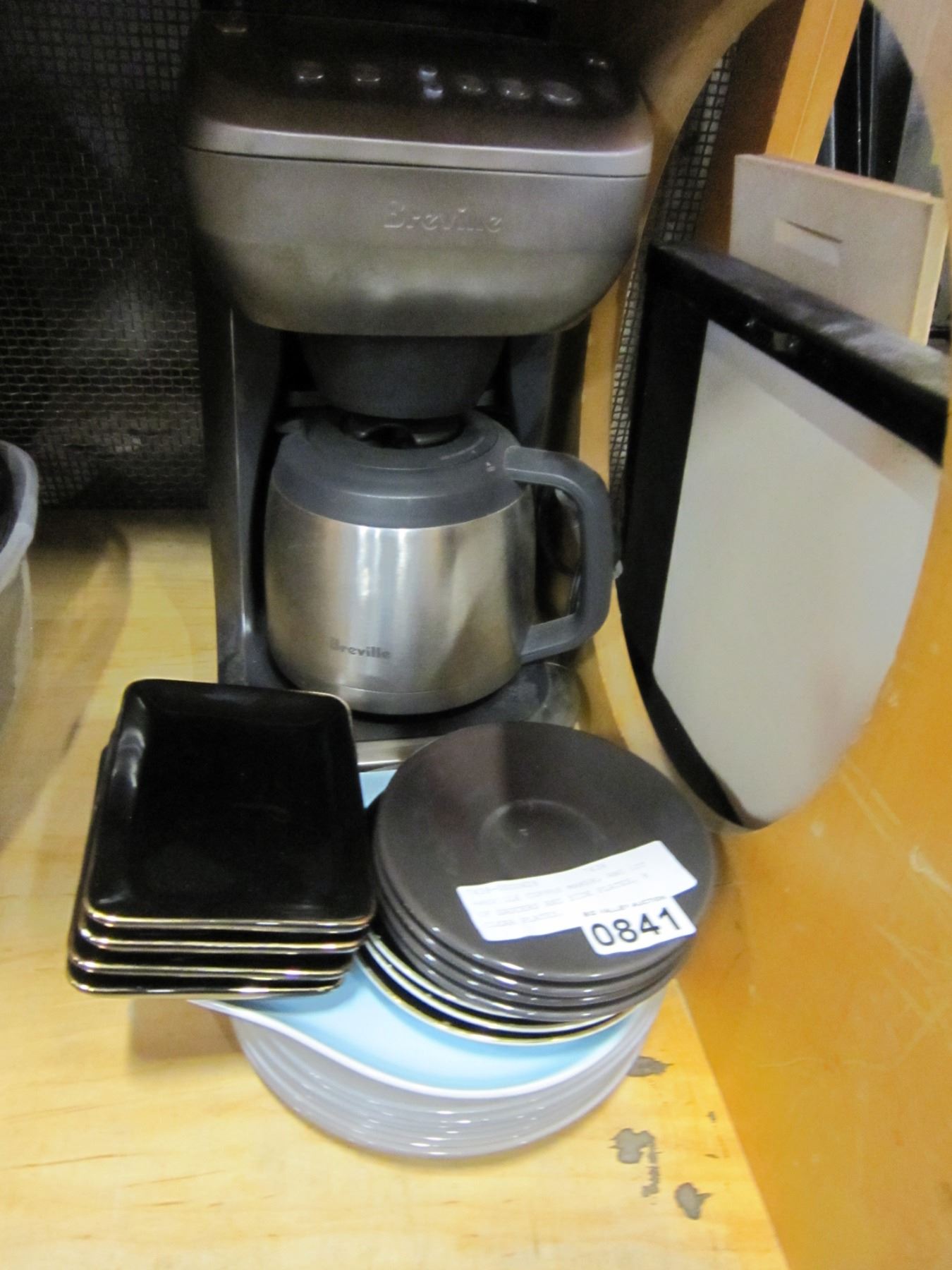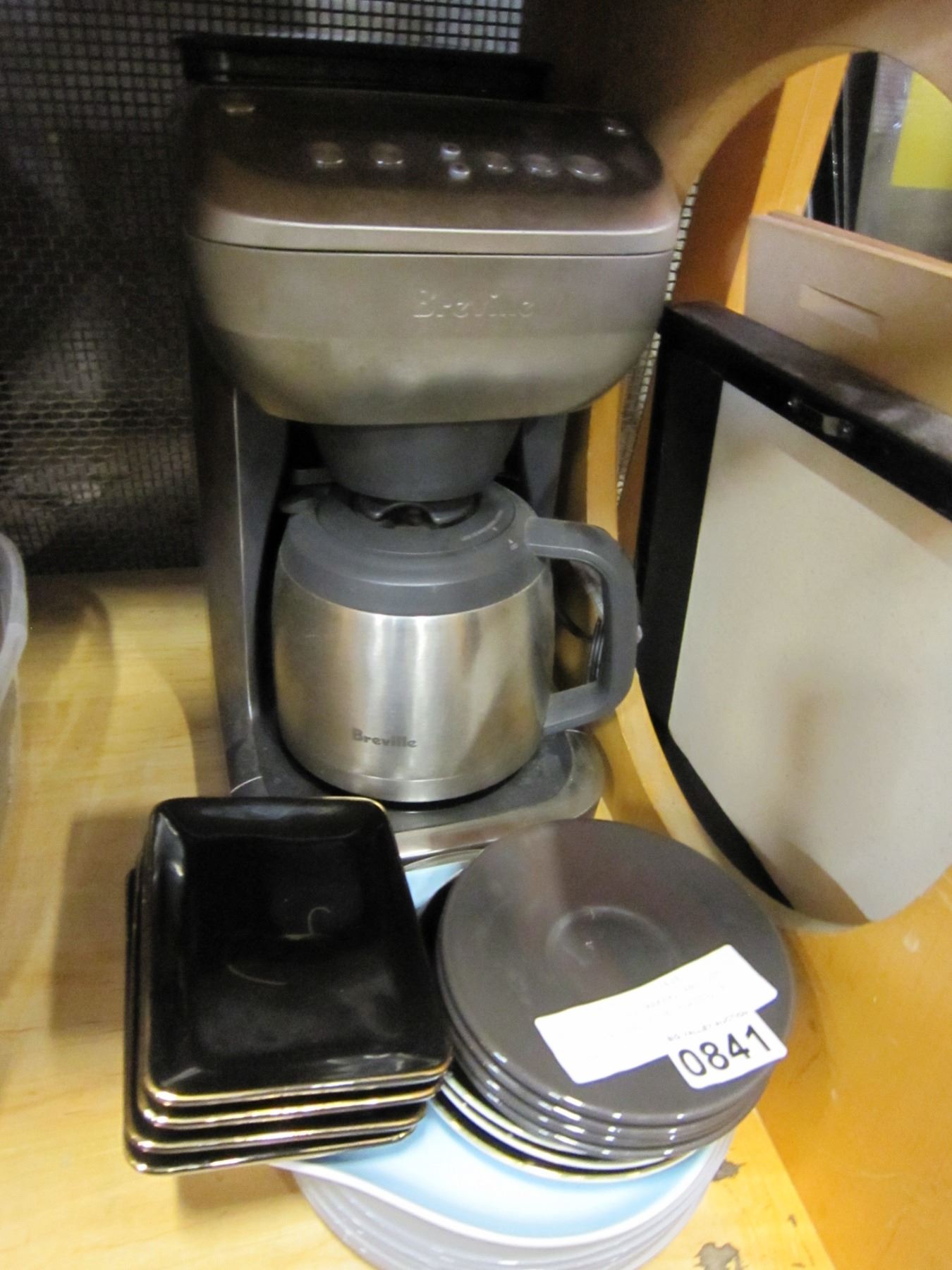 BREVILLE COFFEE MAKER, AND LOT OF SAUCERS AND SIDE PLATES, 8 CLEAR PLATES,