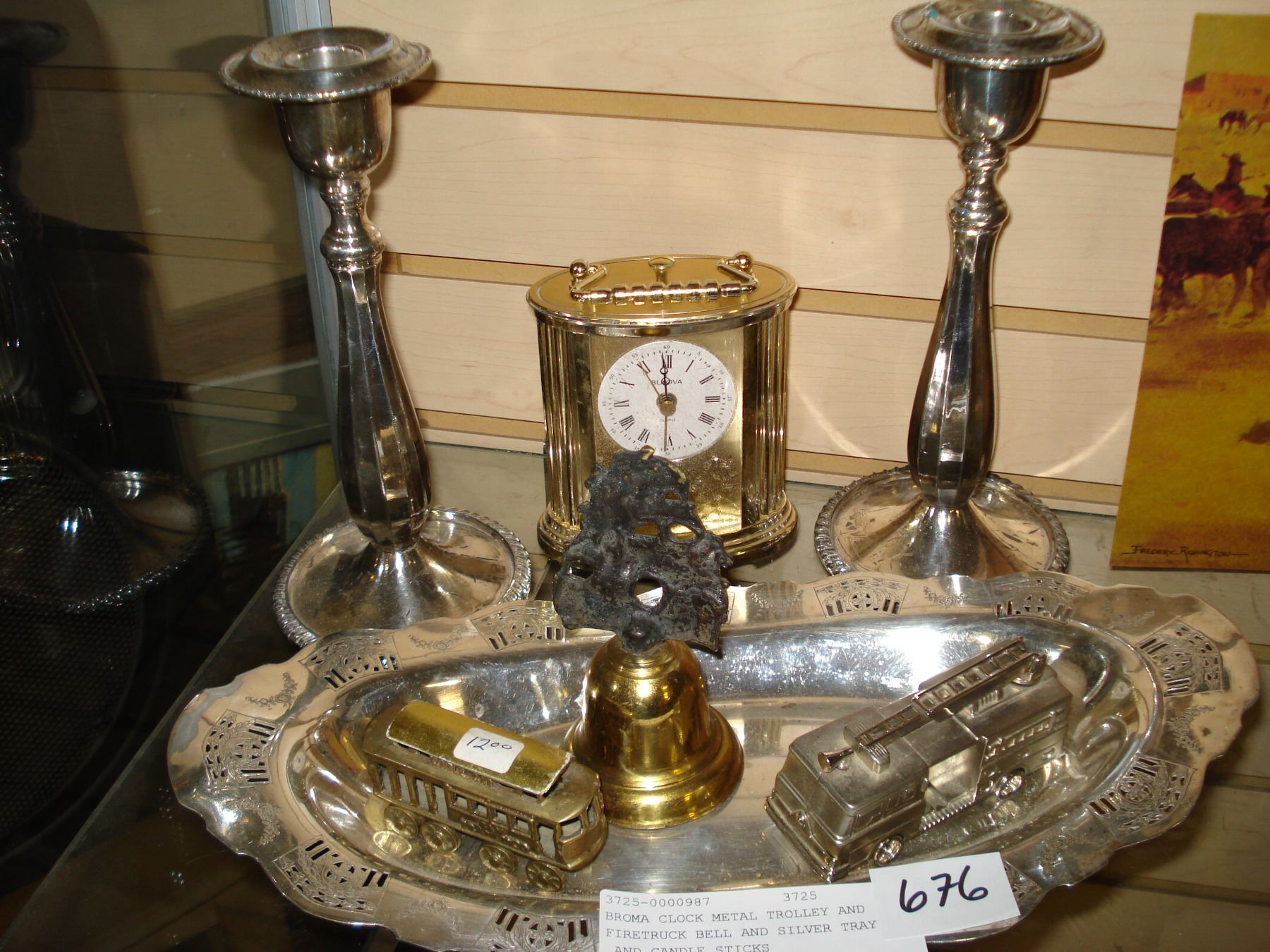 BROMA CLOCK METAL TROLLEY AND FIRETRUCK BELL AND SILVER TRAY AND CANDLE STICKS