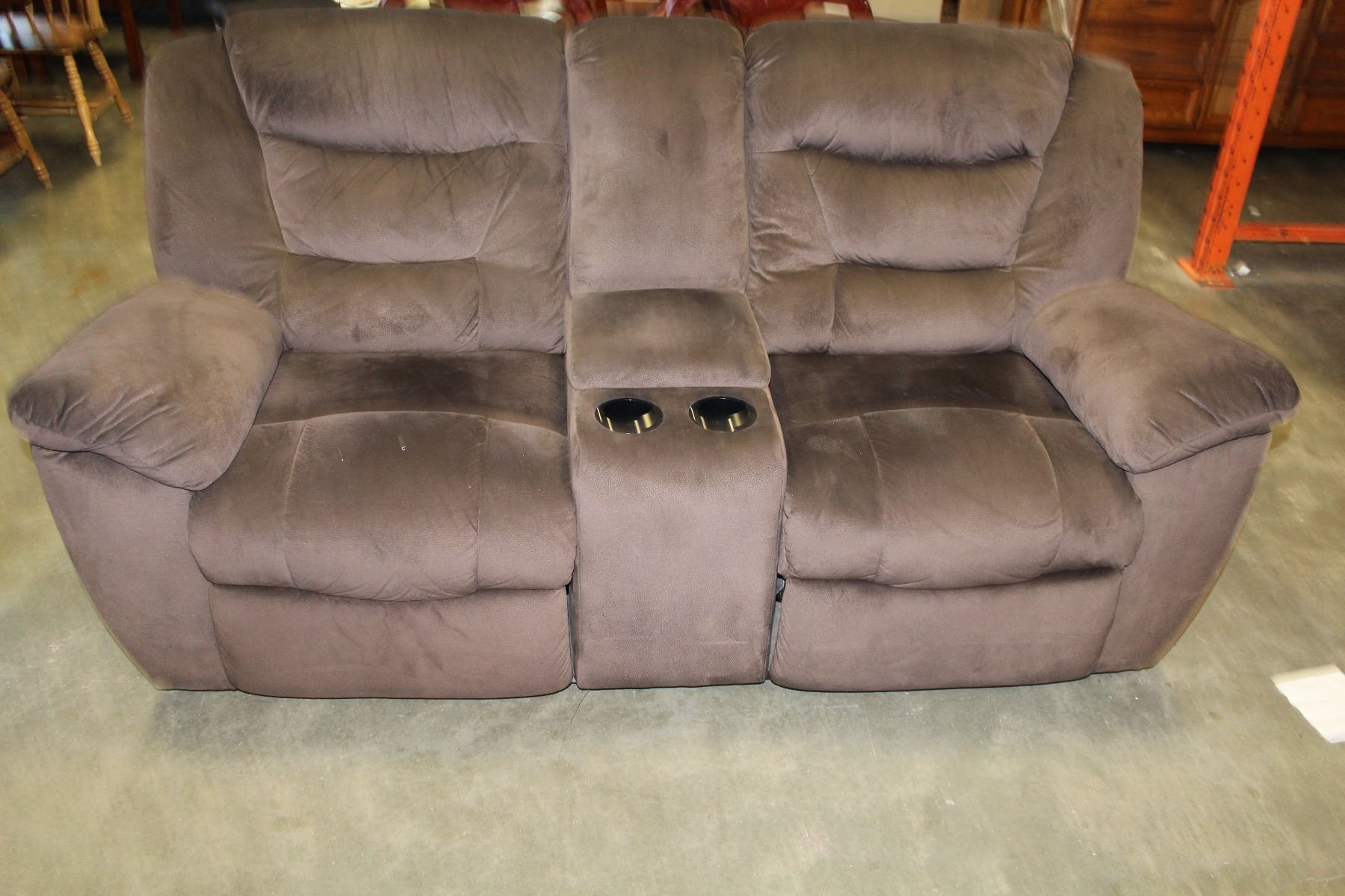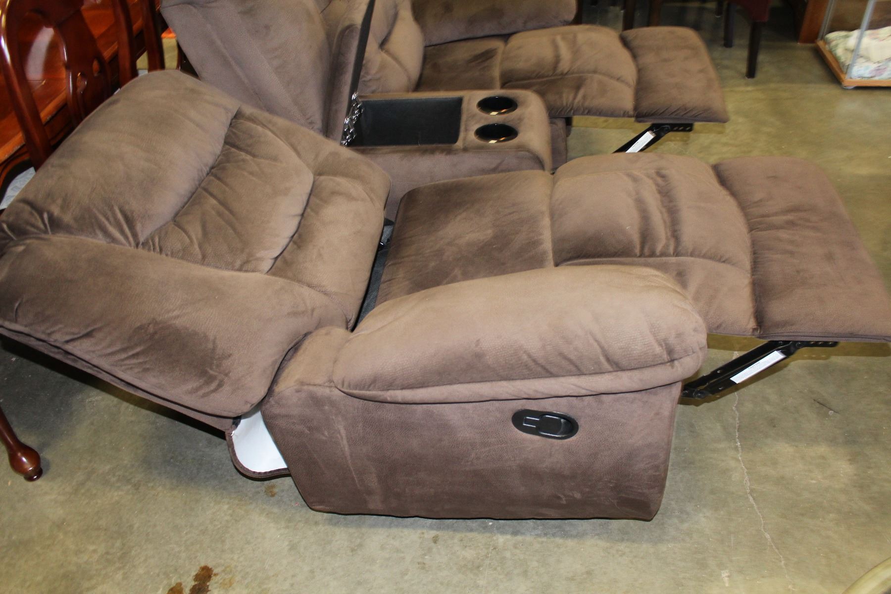 BROWN MICROFIBRE DOUBLE RECLINING LOVESEAT WITH CENTRE CONSOLE