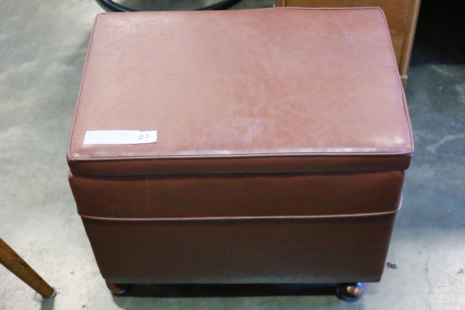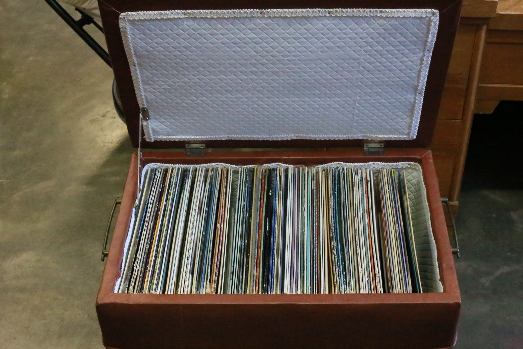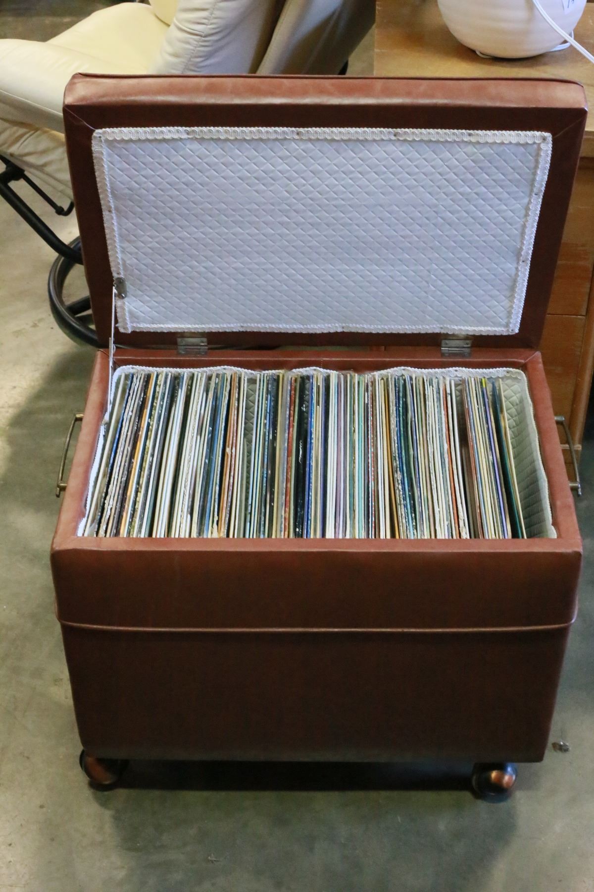 BROWN VINYL ROLLING OTTOMAN WITH RECORDS