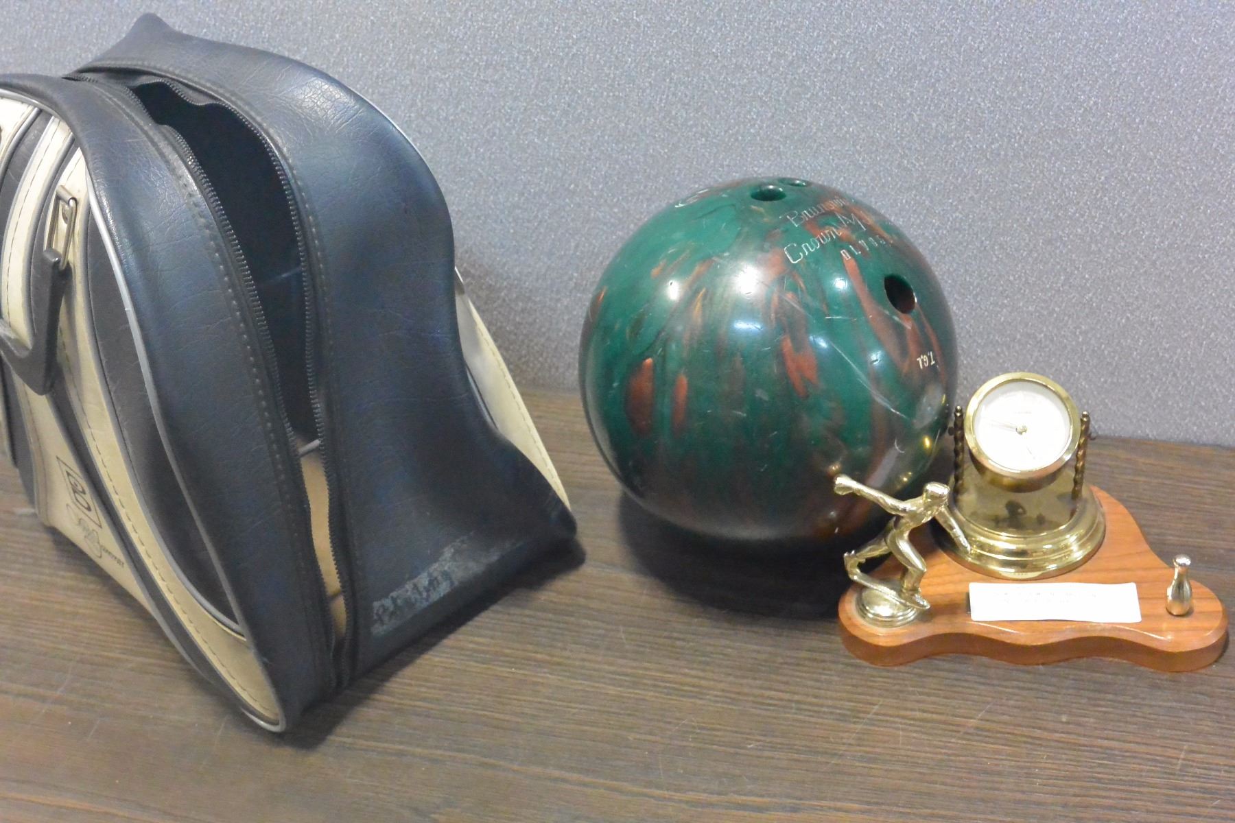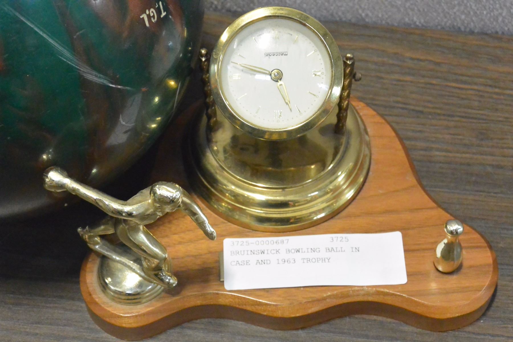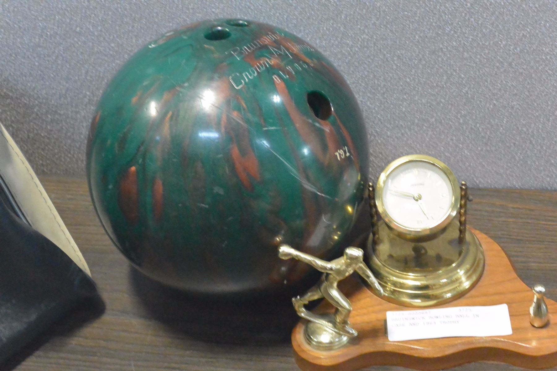 BRUINSWICK BOWLING BALL IN CASE AND 1963 TROPHY