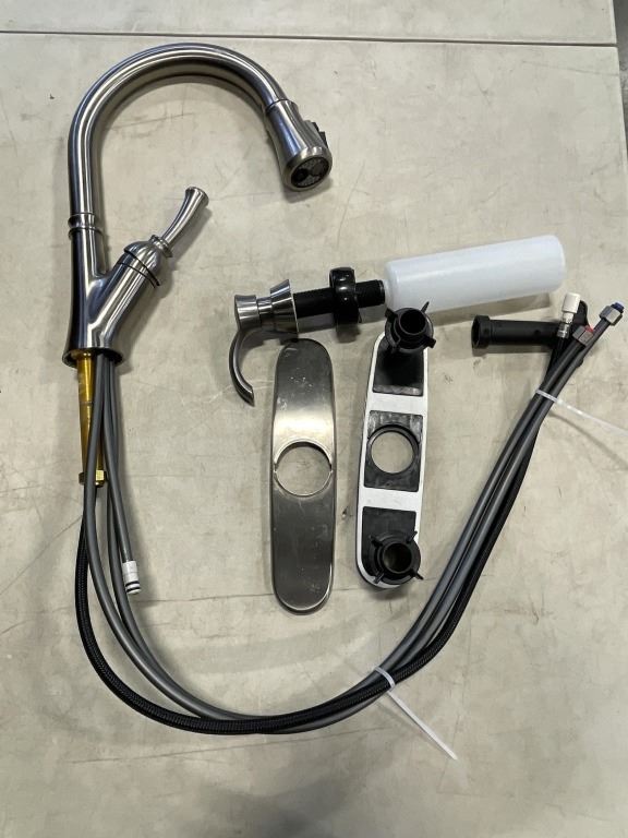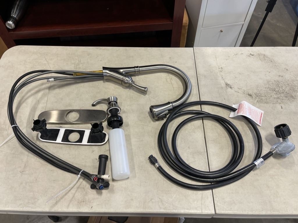 BRUSHED METAL KITCHEN FAUCET WITH SOAP DISPENSER AND PROPANE ADAPTER HOSE