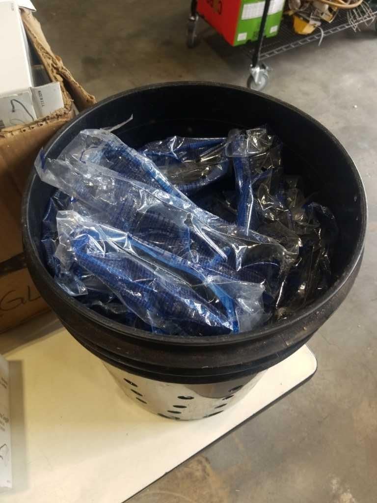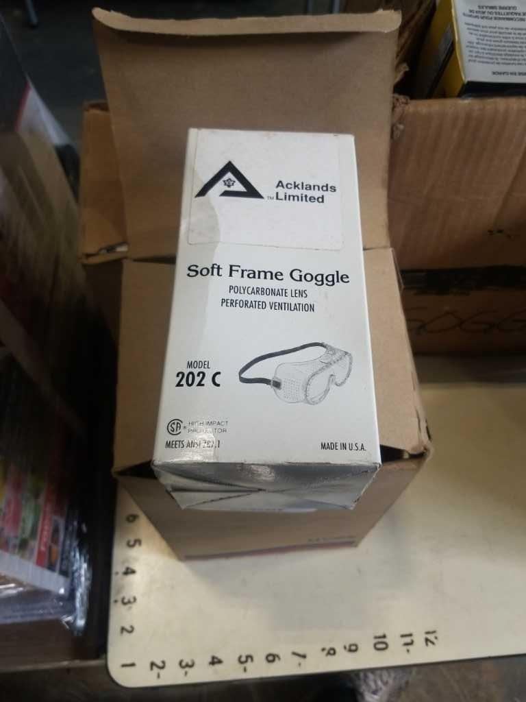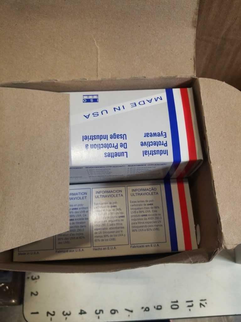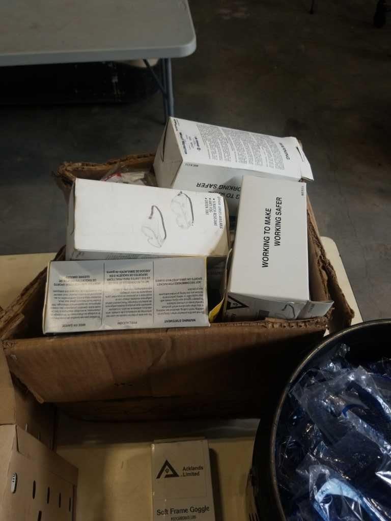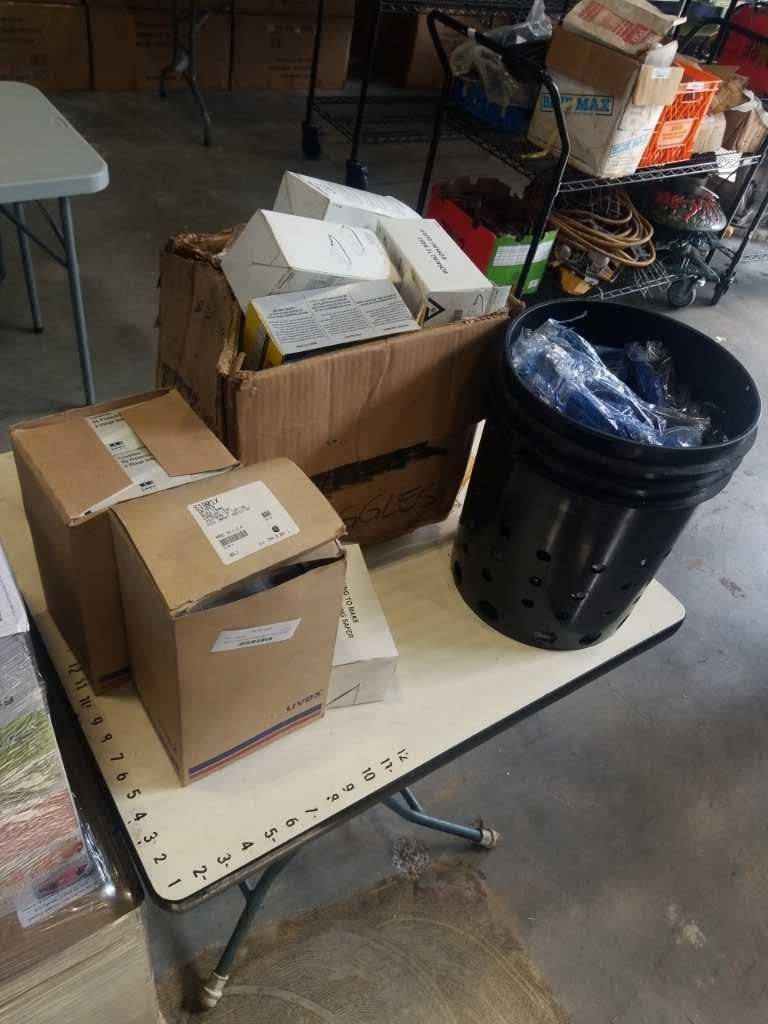 BUCKET AND 3 BOXES OF SAFETY GOGGLES AND GLASSES