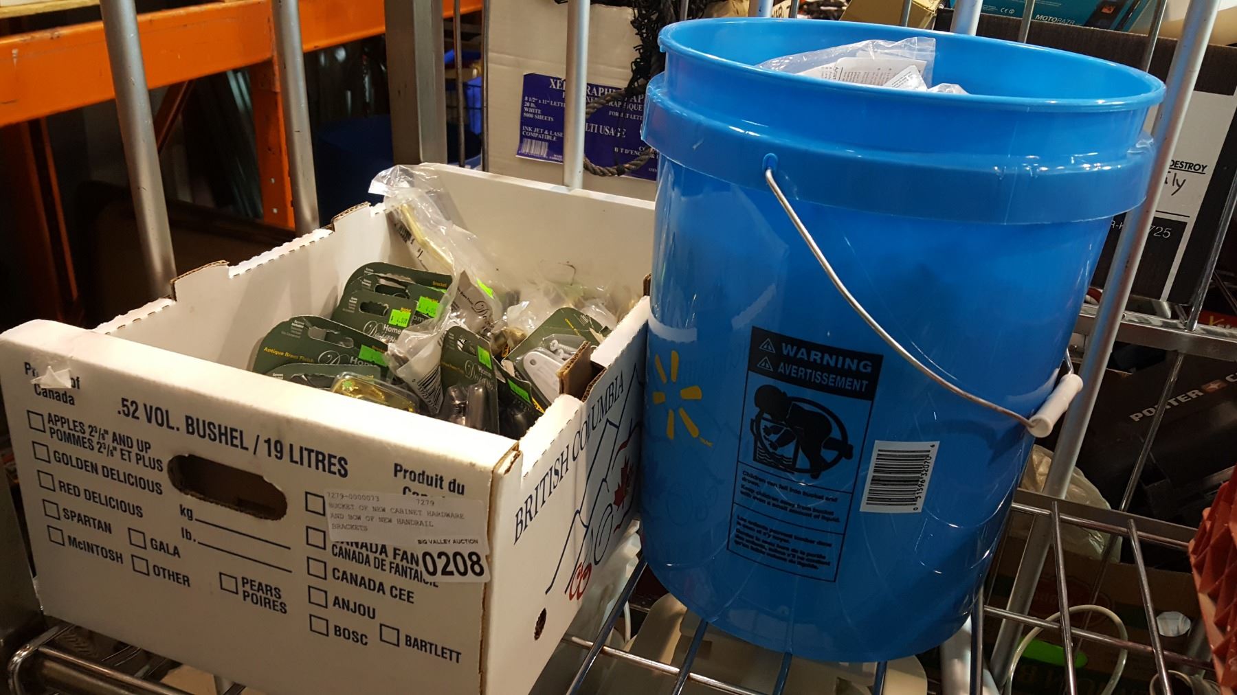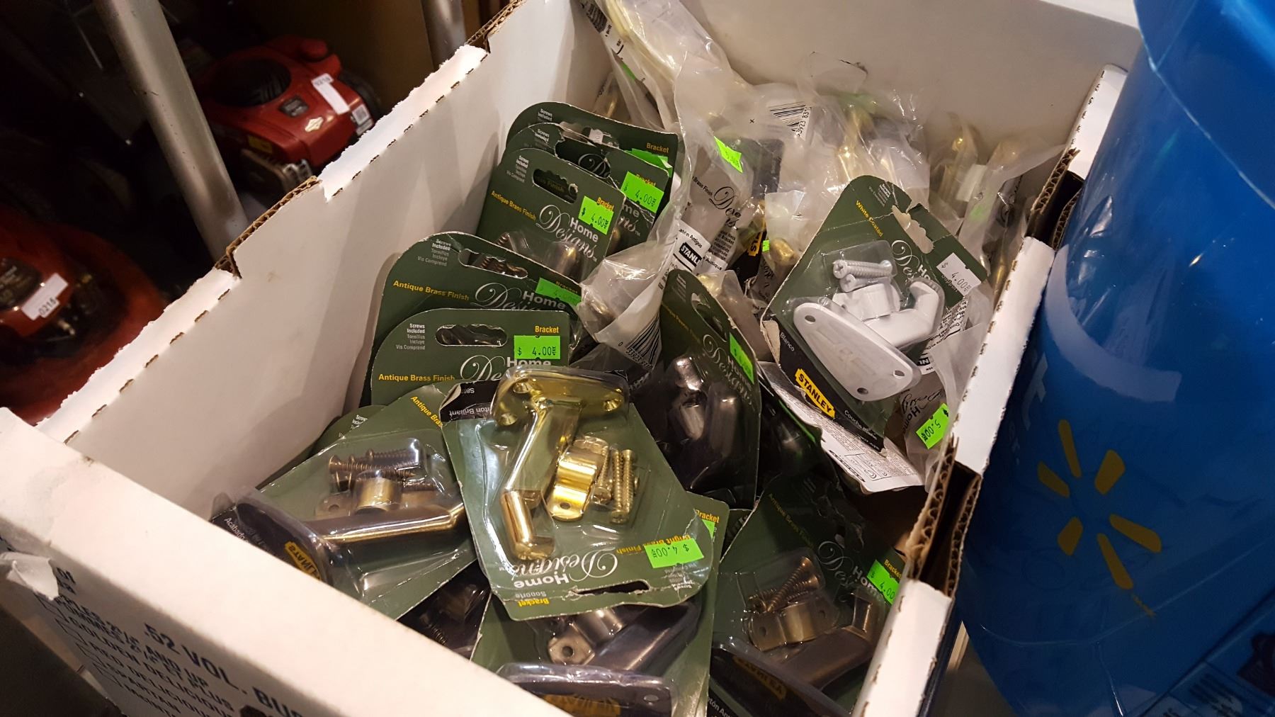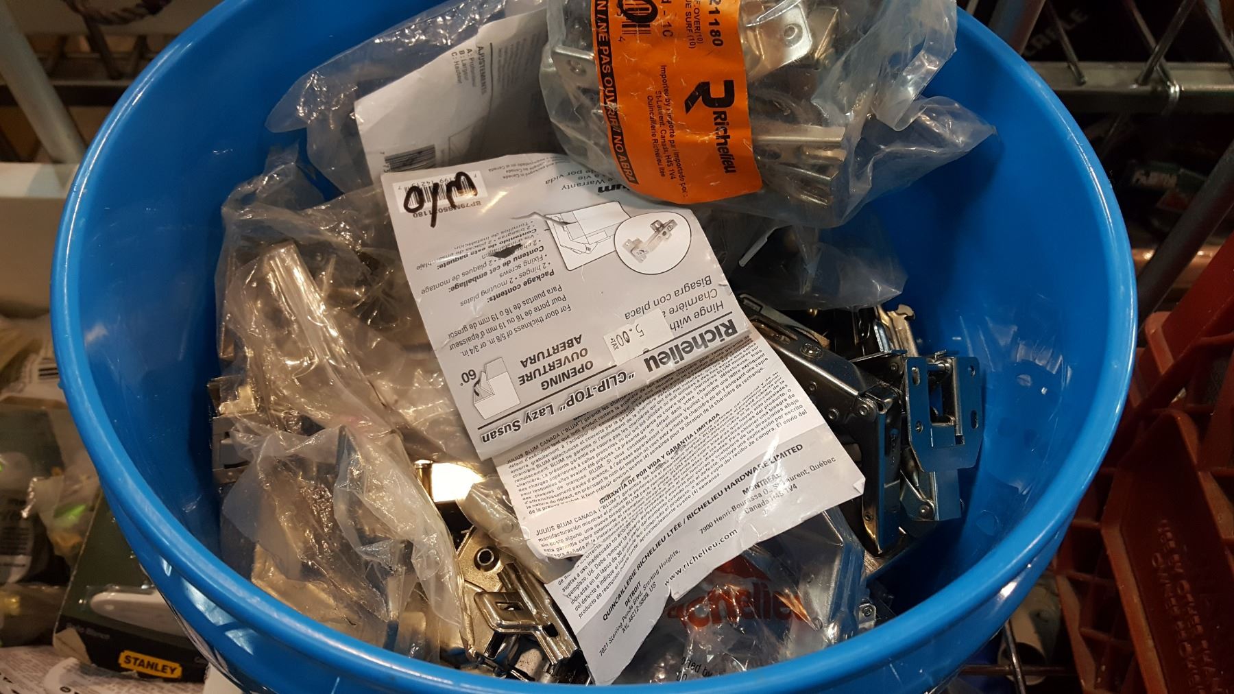 BUCKET OF NEW CABINET HARDWARE AND BOW OF NEW HANDRAIL BRACKETS