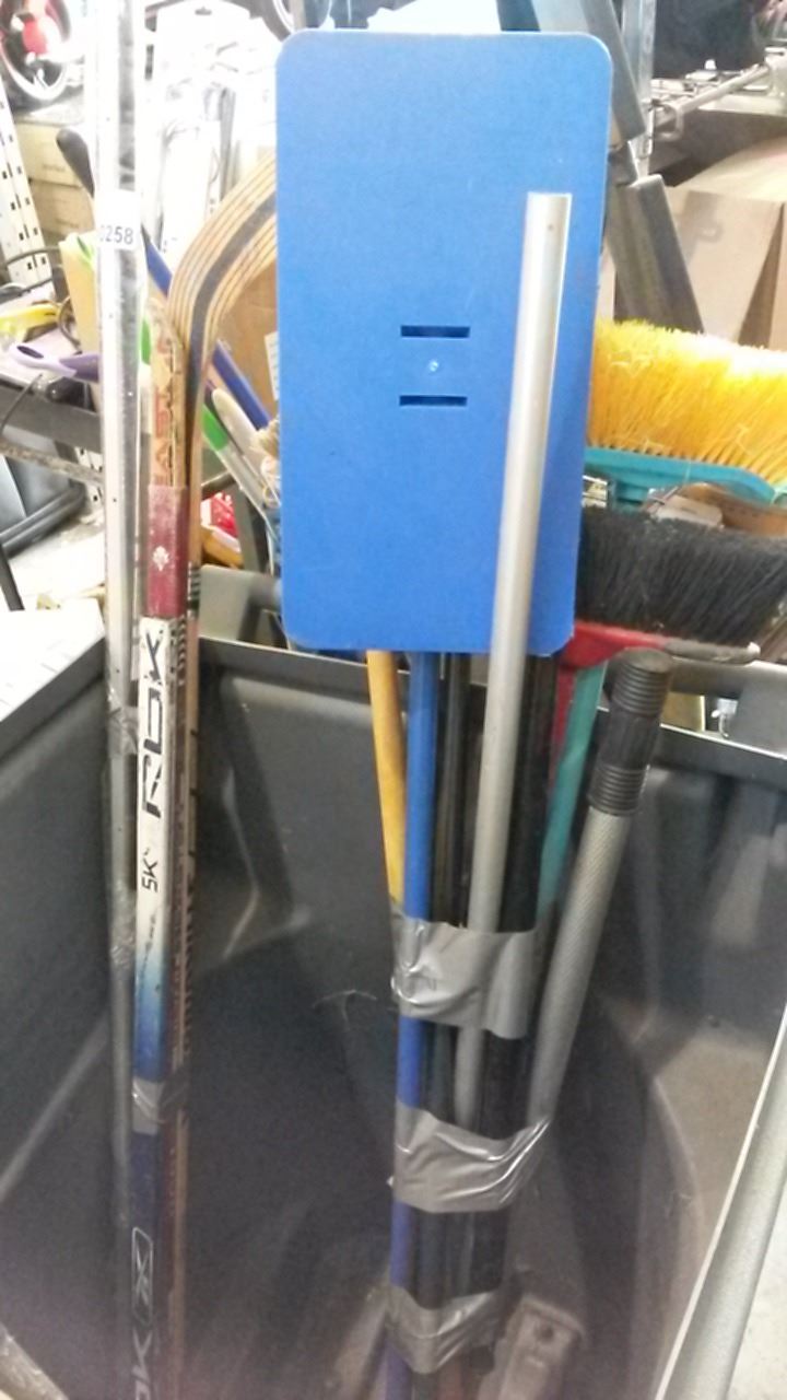 BUNDLE OF BROOMS, HOCKEY STICK, AND WEATHER STRIPPING