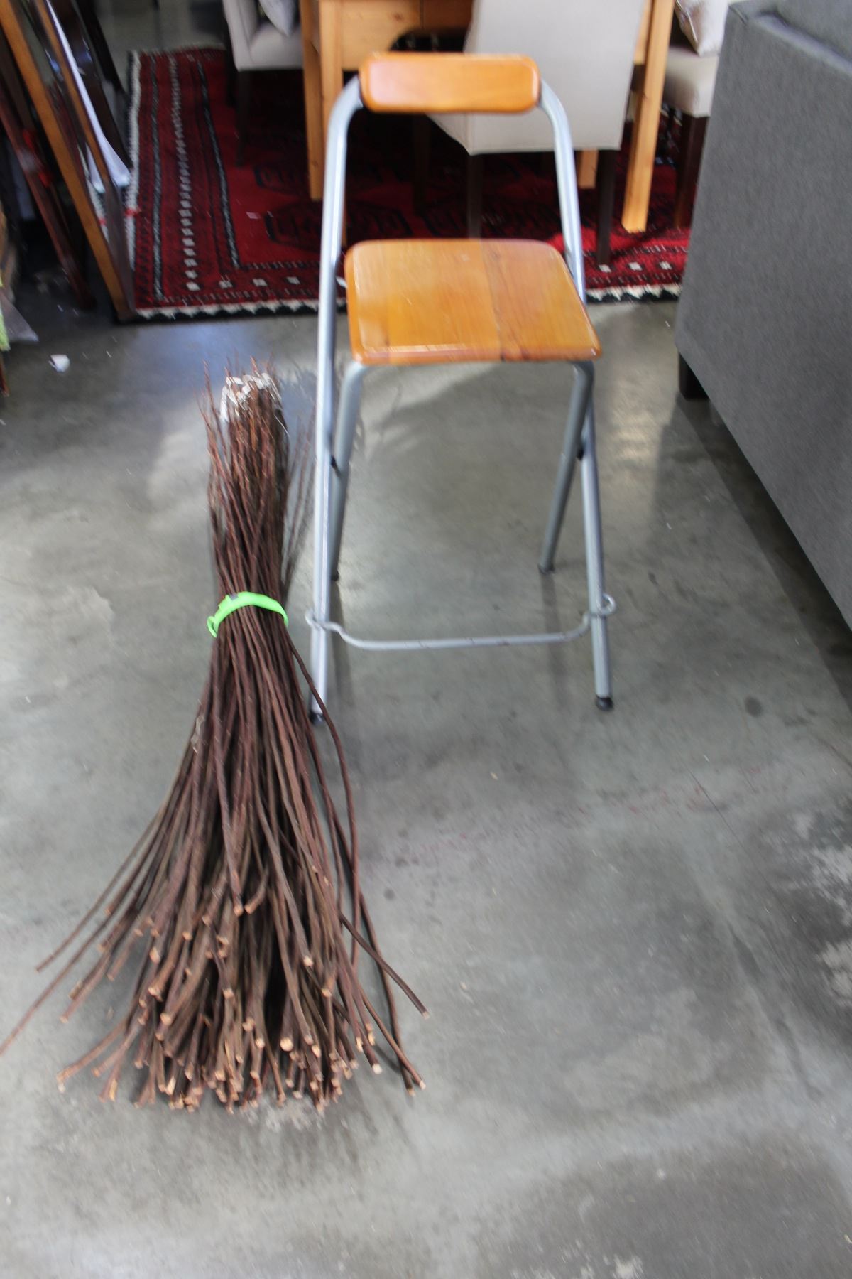 BUNDLE OF DECORATIVE STICKS AND SMALL STOOL