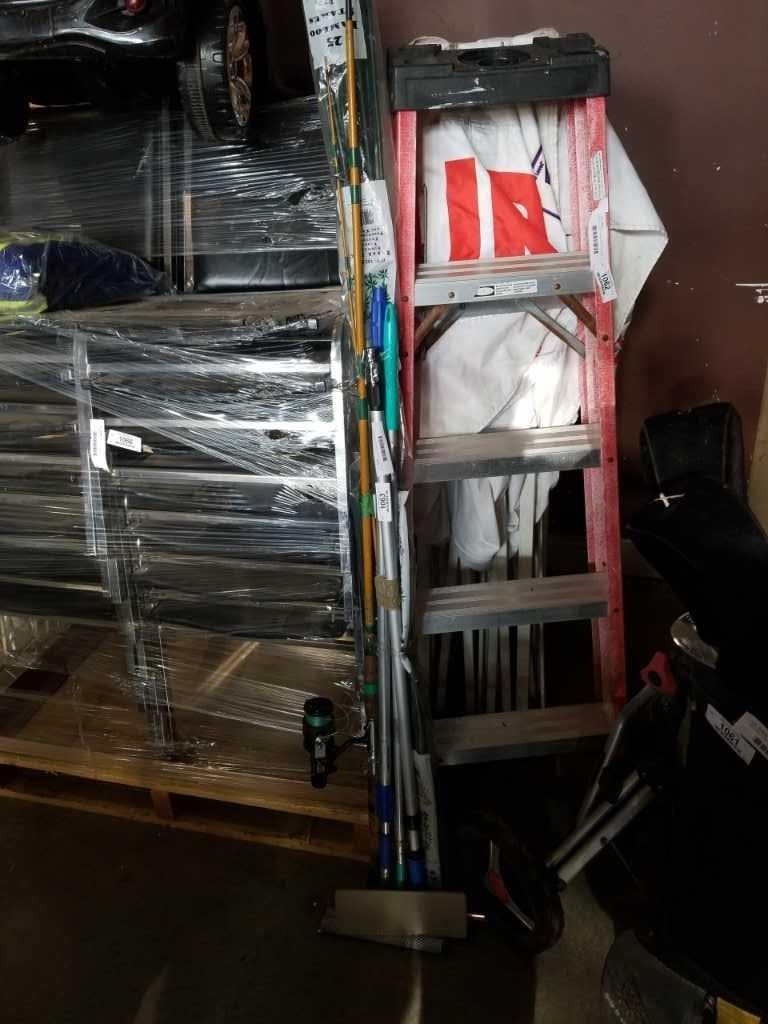 BUNDLE OF GARDEN STAKES, FISHING ROD W/REEL AND SQUEEGIES