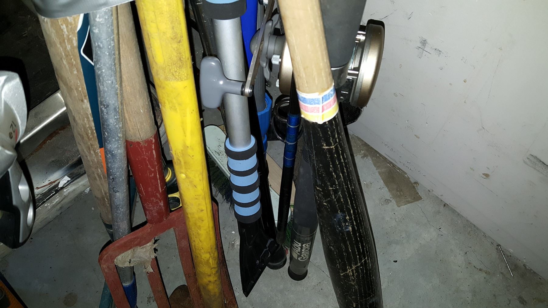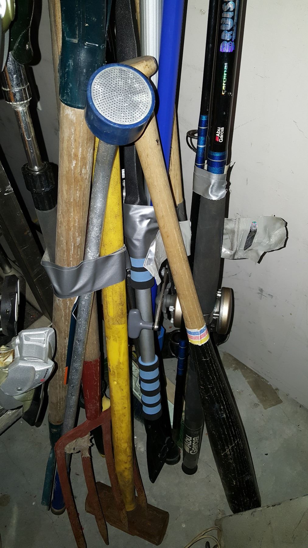 BUNDLE OF GARDEN TOOLS PITCHFORK AND SLEDGE HAMMER AND HOCKEY STICK FISHING ROD AND BAT