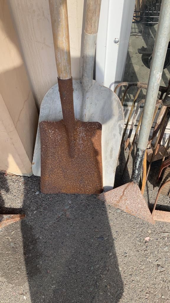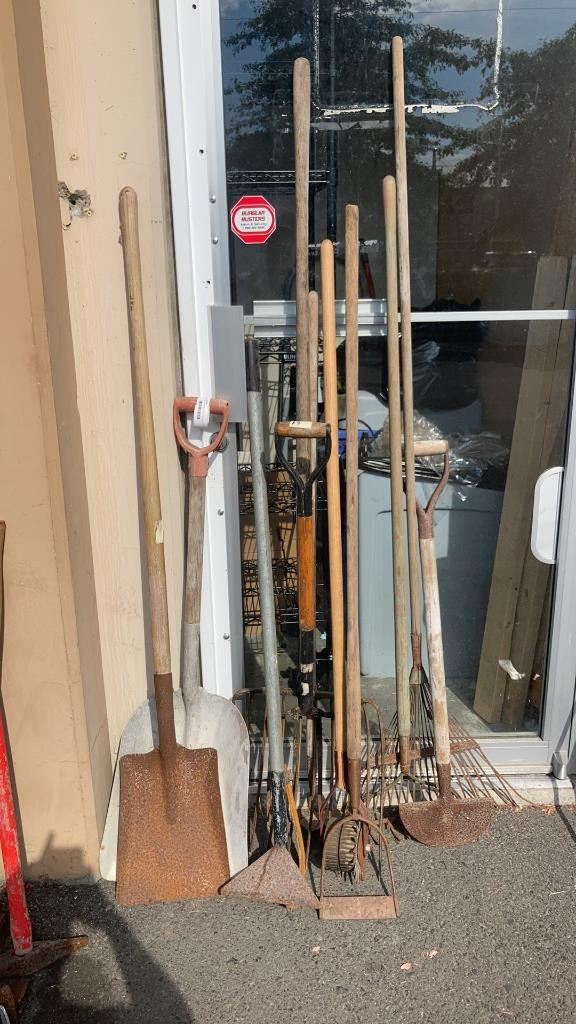 BUNDLE OF GARDEN TOOLS, SHOVELS, RAKES, PITCHFORKS