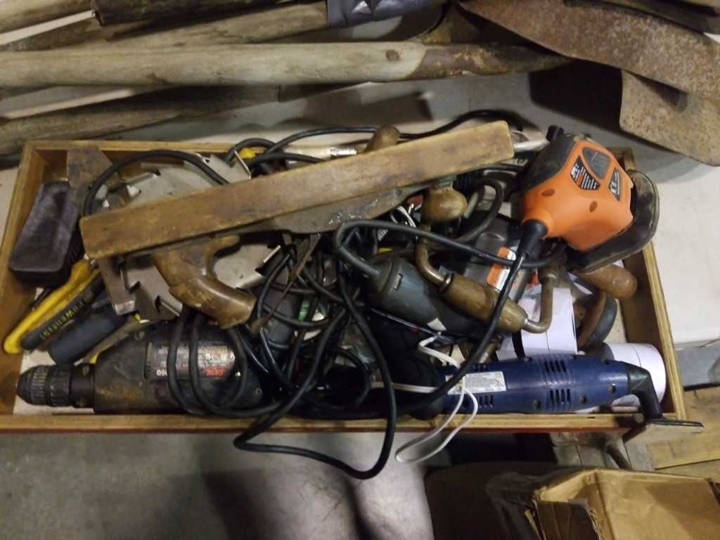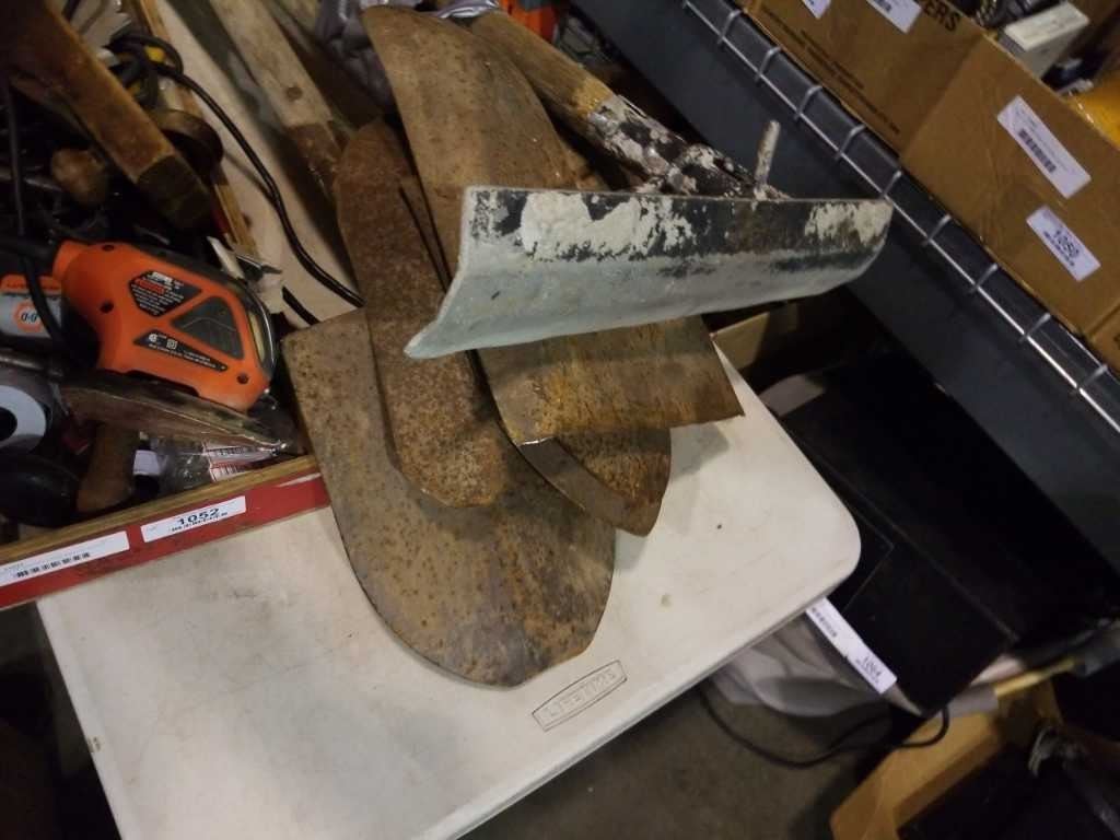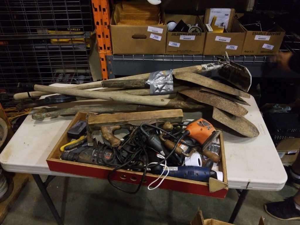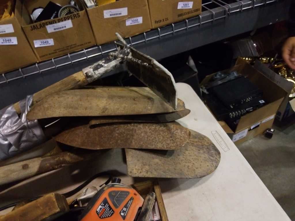 BUNDLE OF SHOVELS AND BOX OF TOOLS