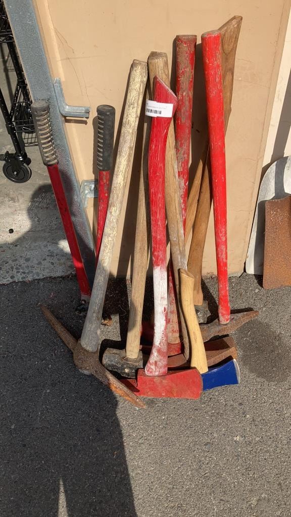 BUNDLE OF SLEDGEHAMMERS, SPLITTING MAULS, PICKAXE