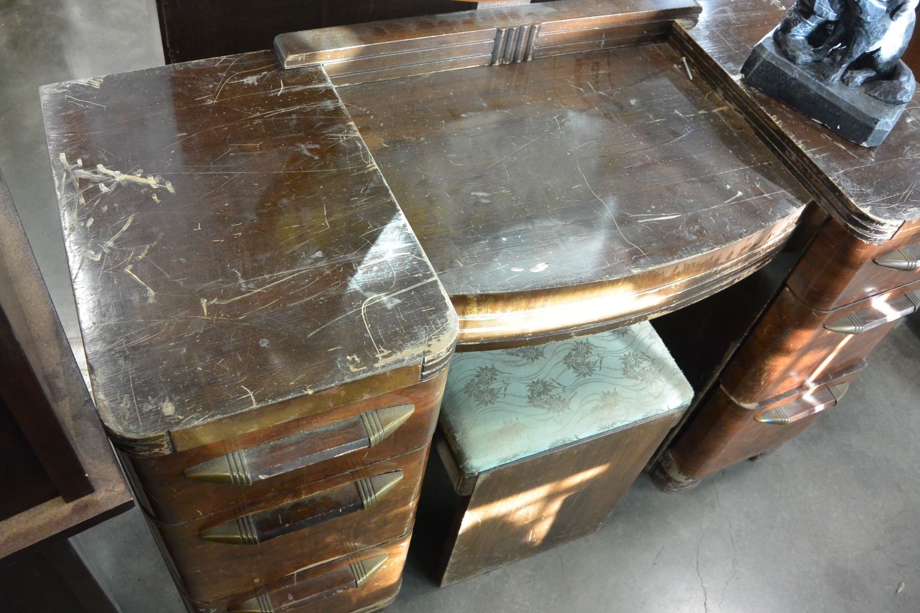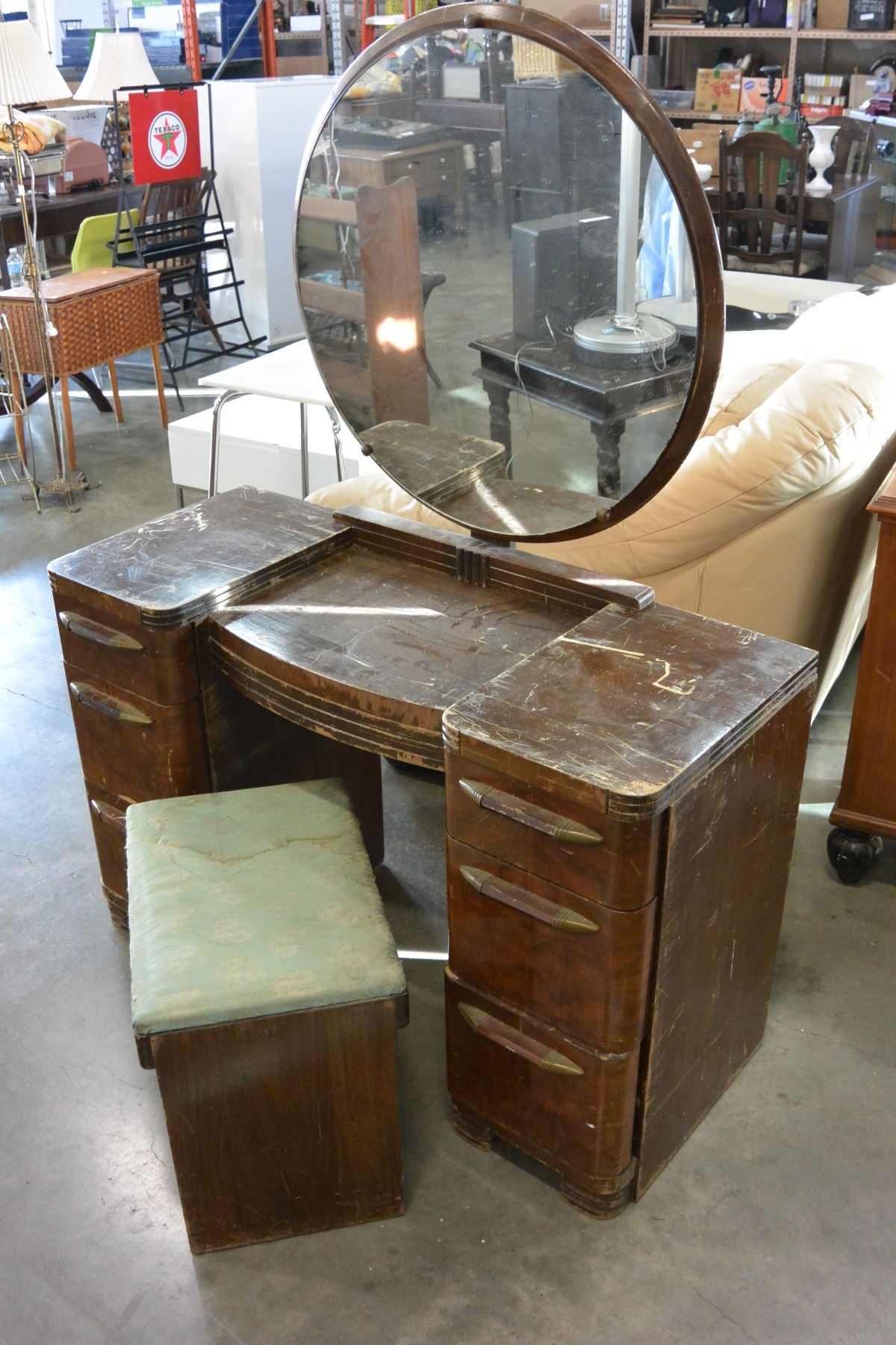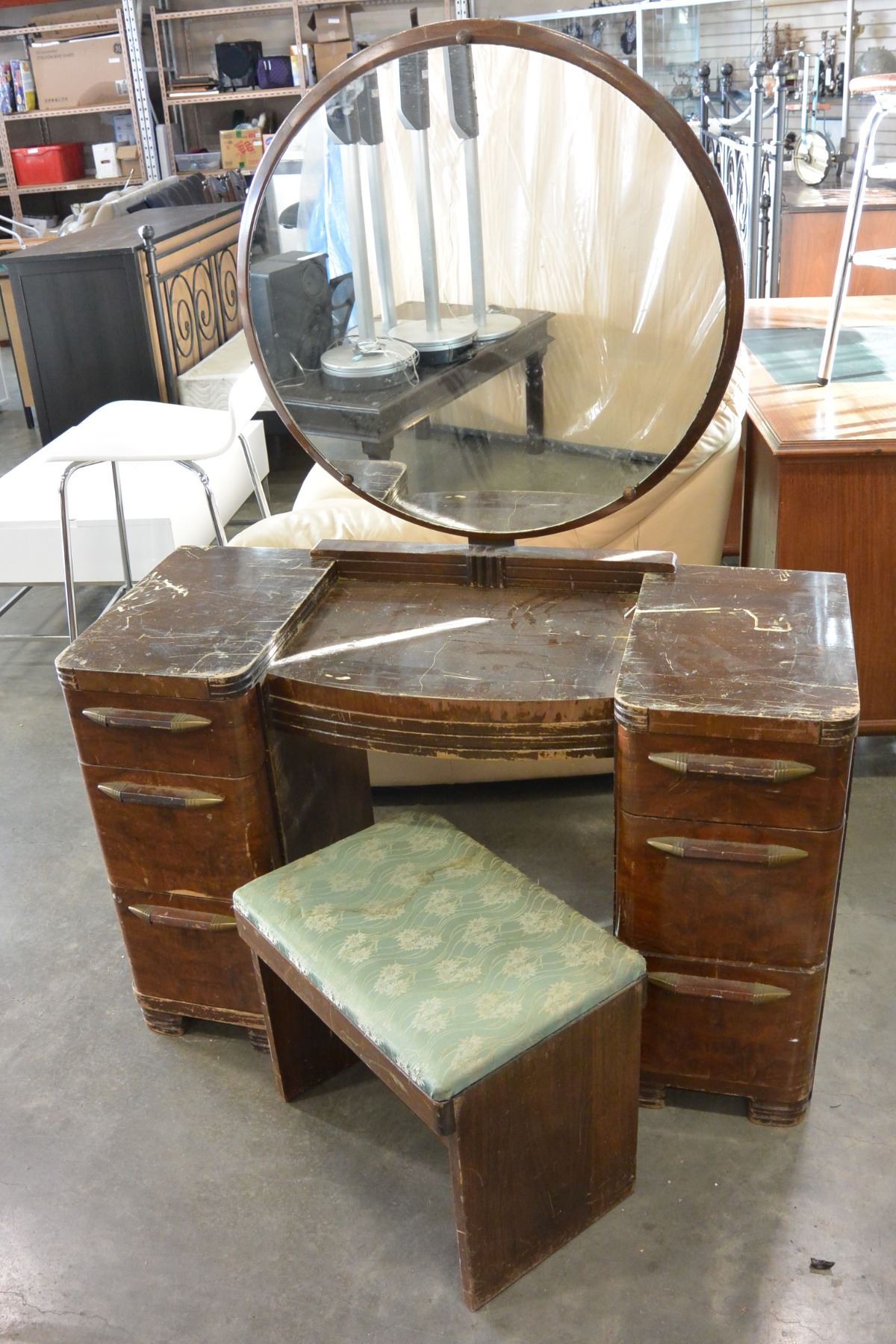 BURLED WALNUT VANITY WITH MIRROR AND STOOL