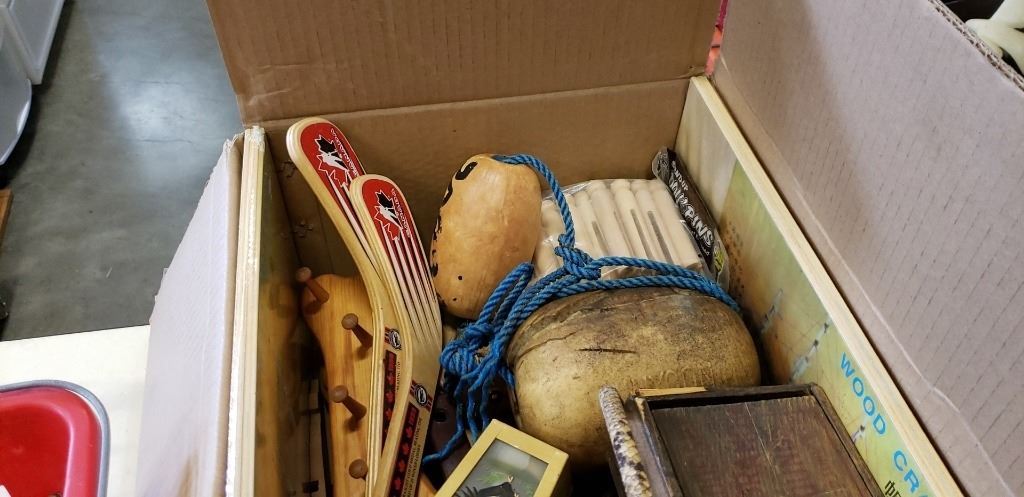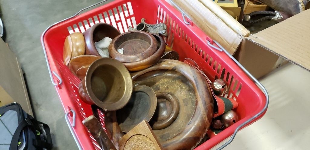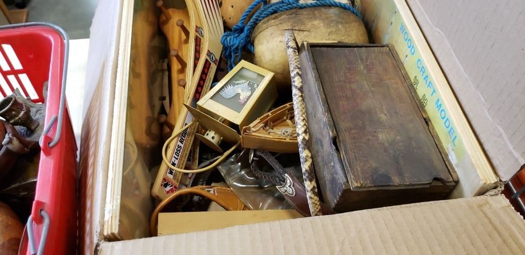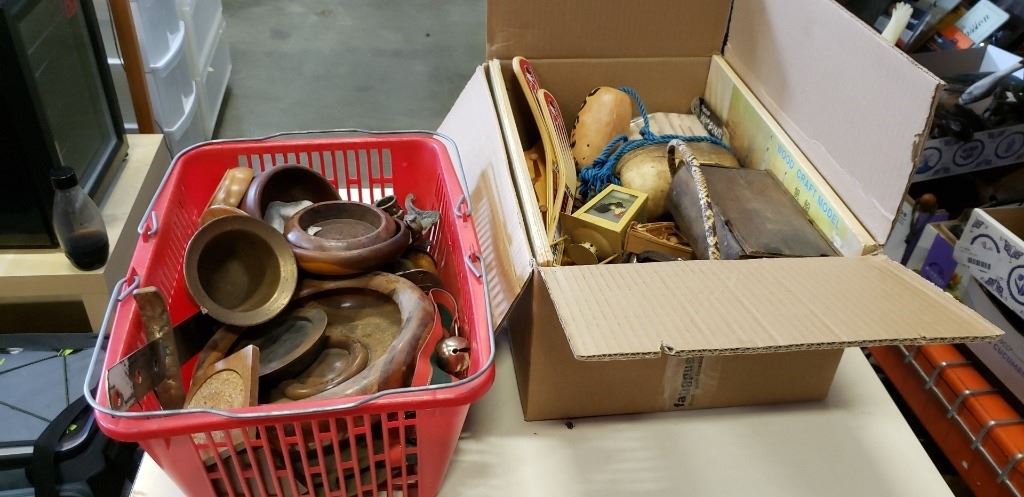 Box and basket of wooden and metal collectibles
