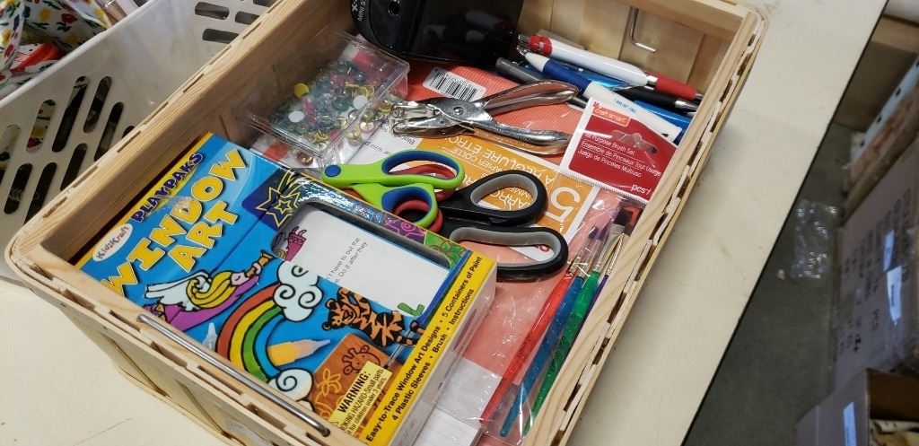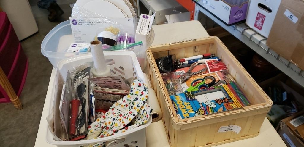 Box and two tote of office supplies and crafts supplies