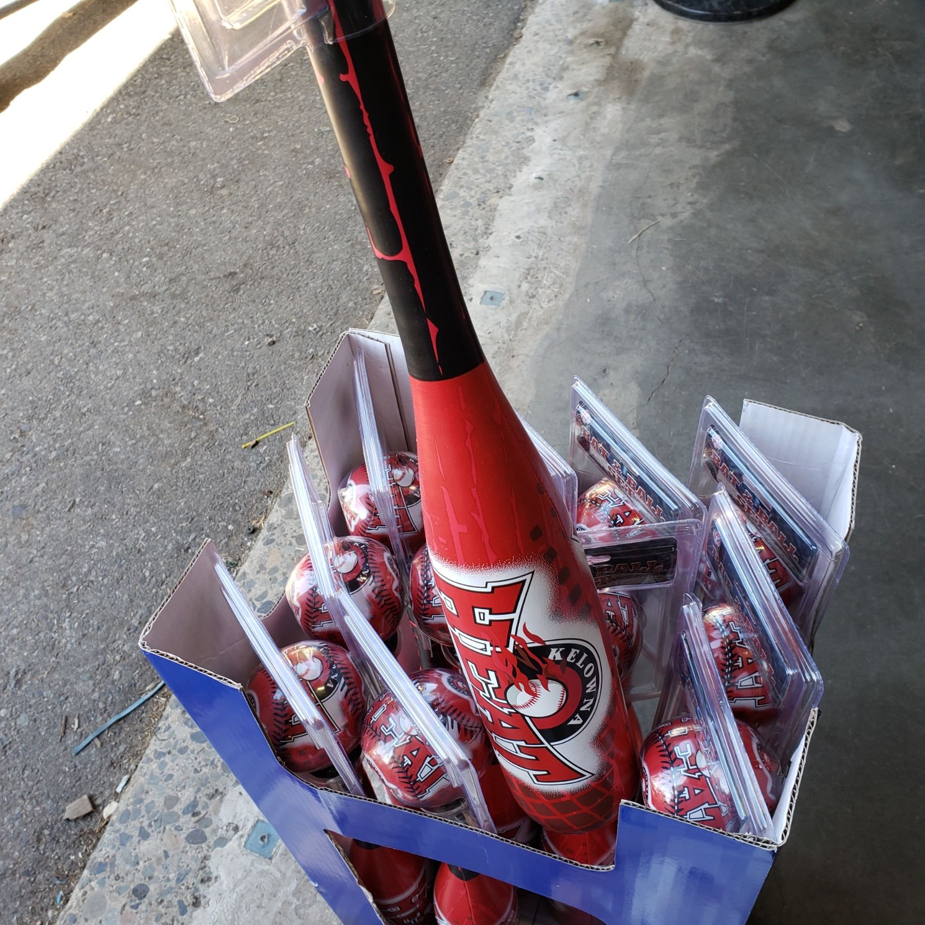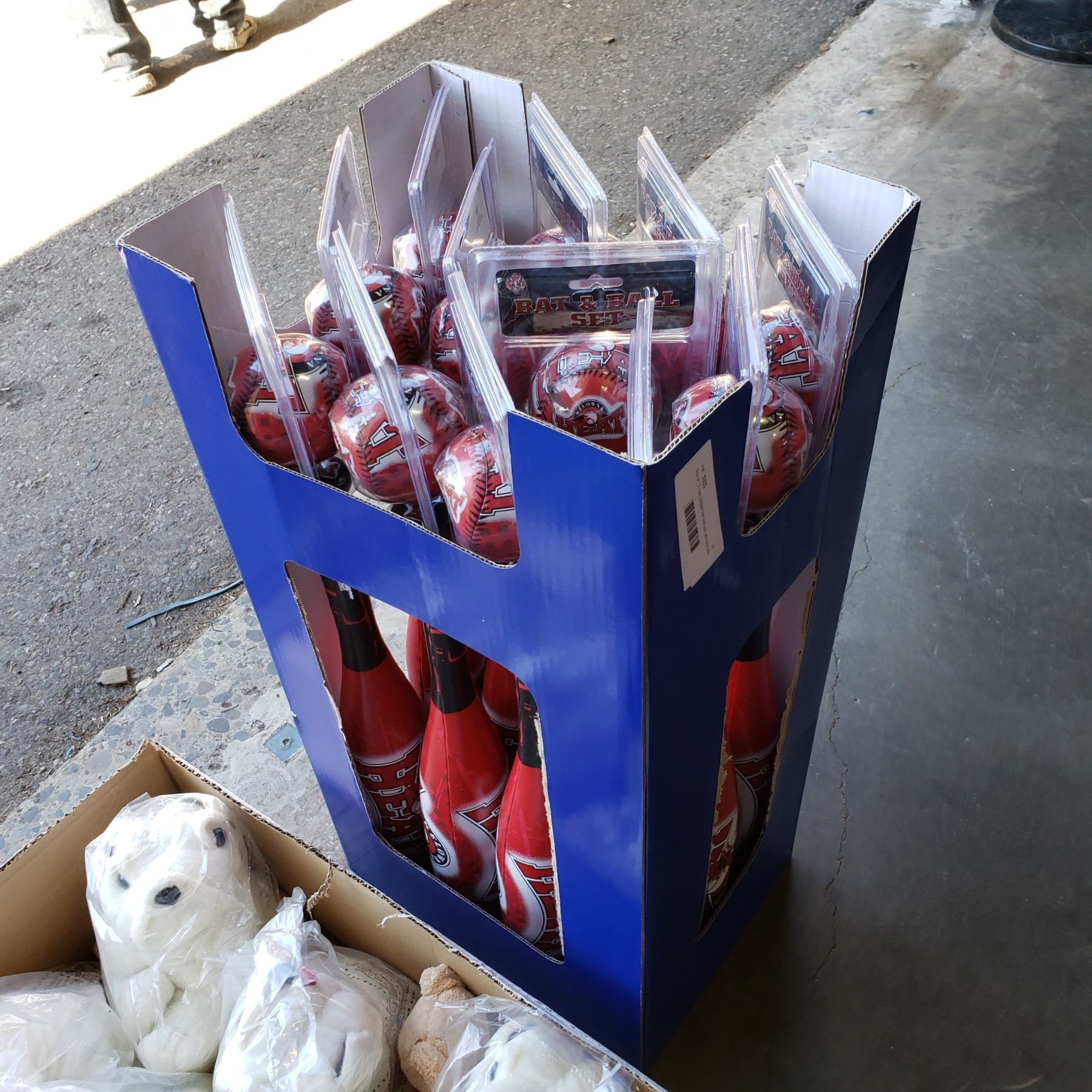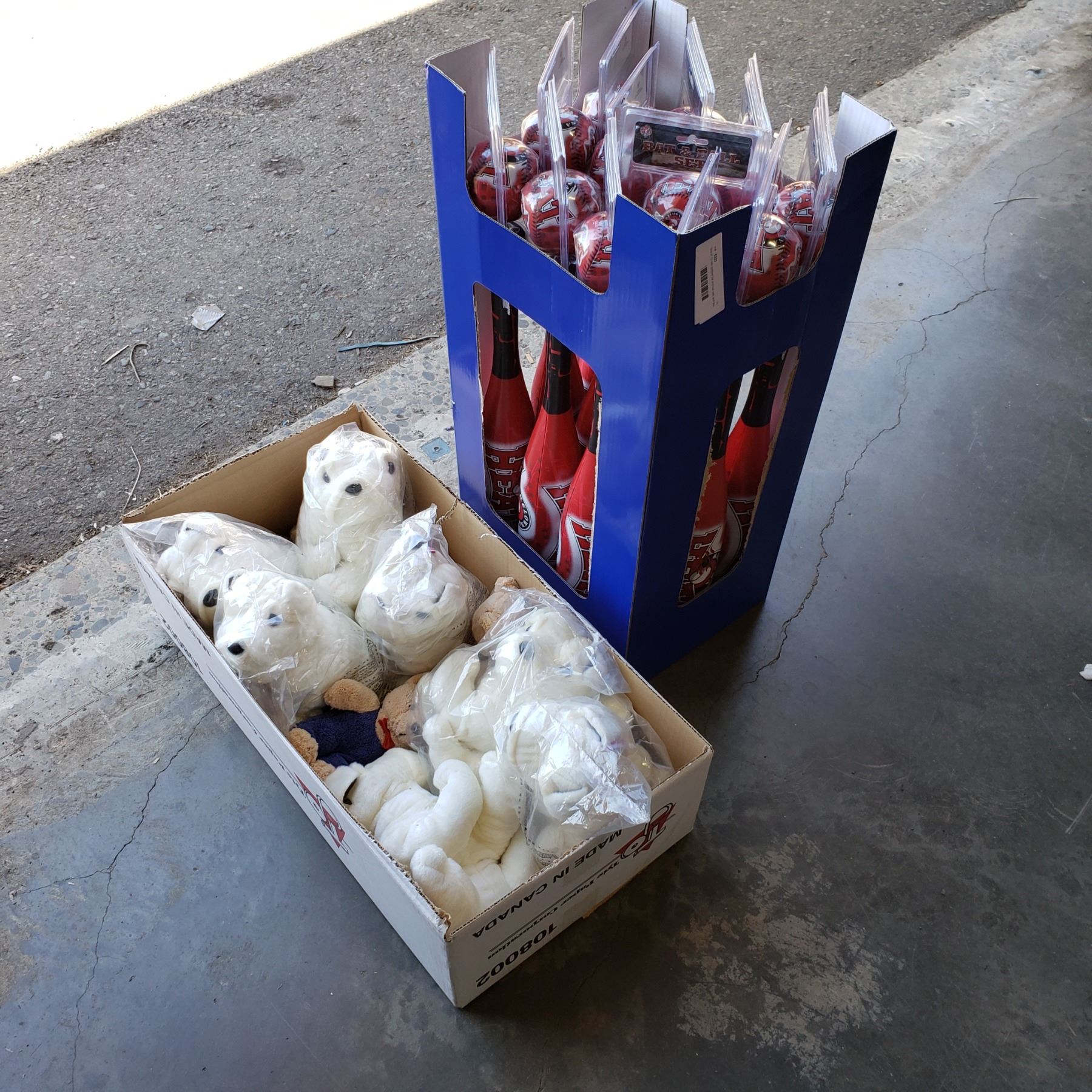 Box of 12 new padded bat and ball sets and box of stuffed dogs
