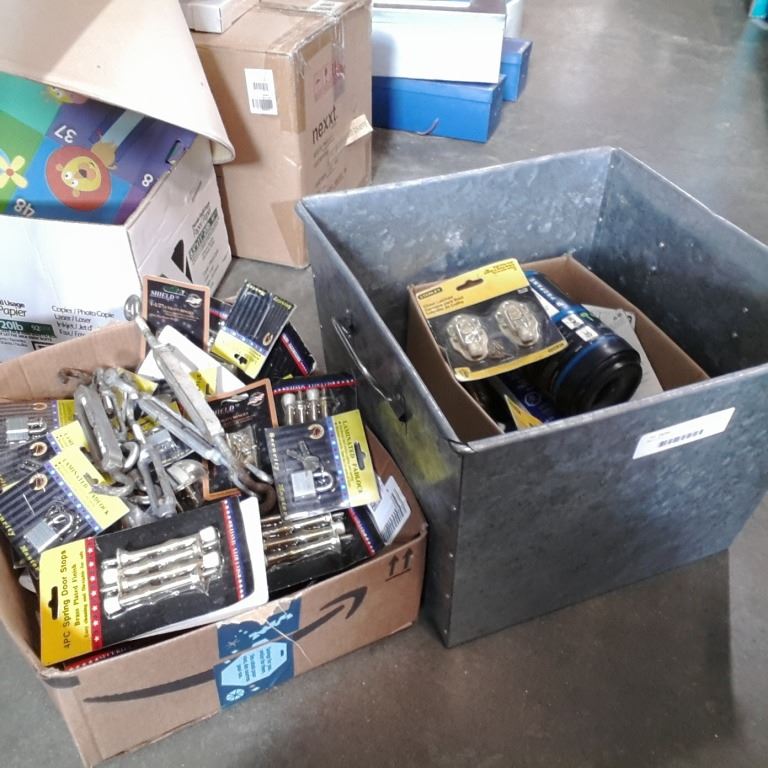Box of door accessories, and turnbuckles with bin of latches